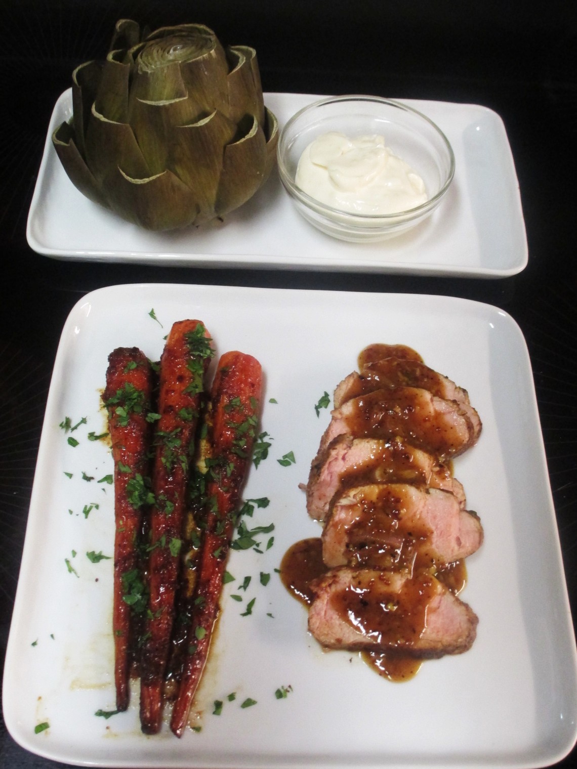 Pork tenderloin with apple cider, maple syrup, mustards and shallot sauce. Sweet and spicy Moroccan carrots. Artichoke and aioli. Pork was perfection, perfectly pink and melt in your mouth tender.