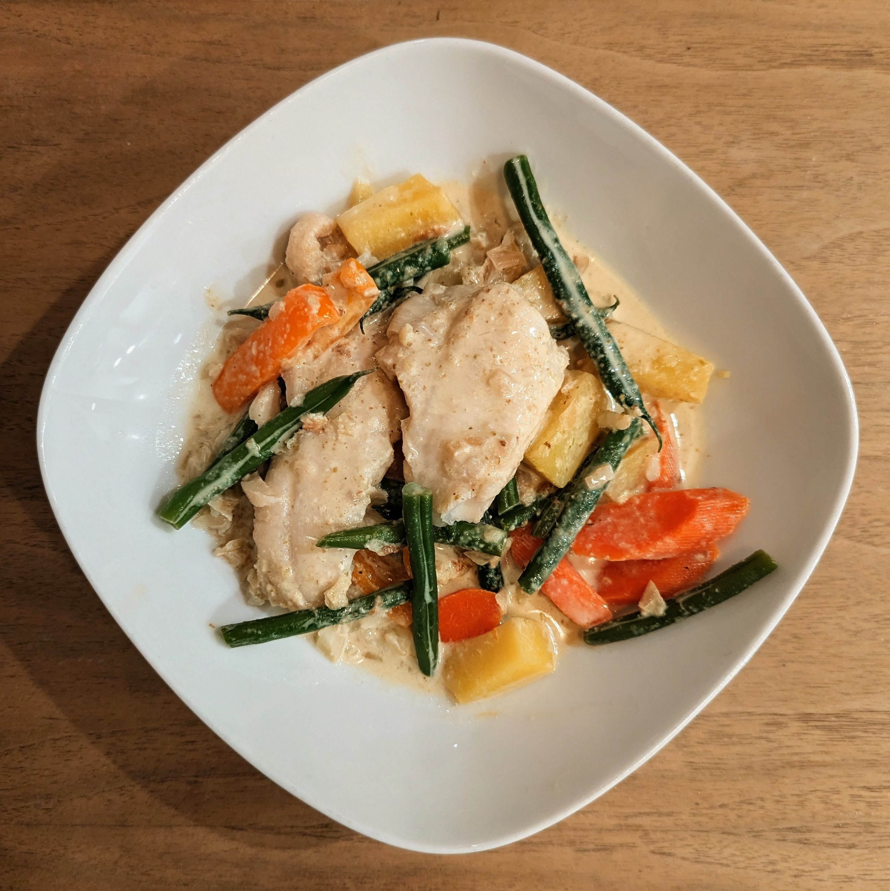 Tonight I made Thai green curry flounder with haricots, potatoes, carrots, red bell pepper, and shallot. Served over brown rice-cauli blend.
