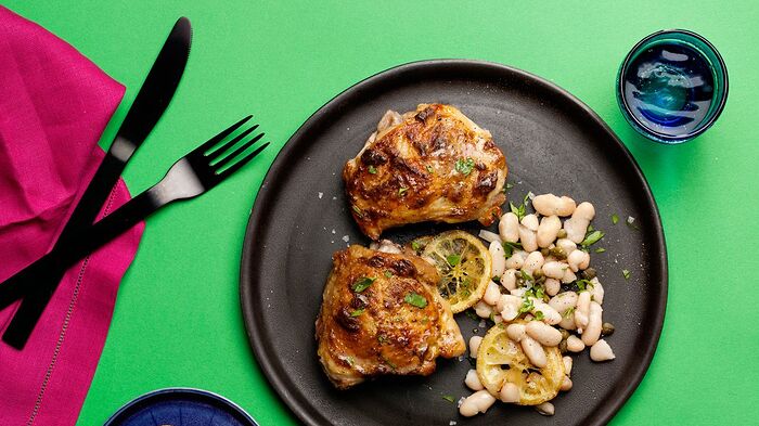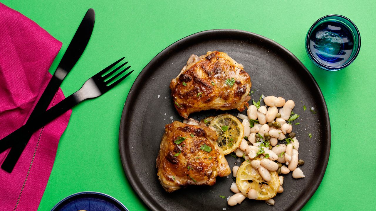 Pan-roasted chicken thighs. While the chicken rests, croutons (here cranberry-pecan leftover from Thanksgiving) are roasted in the schmaltz, then tossed with salad greens and a honey-cider-vinegar vinaigrette made with any remaining schmaltz.