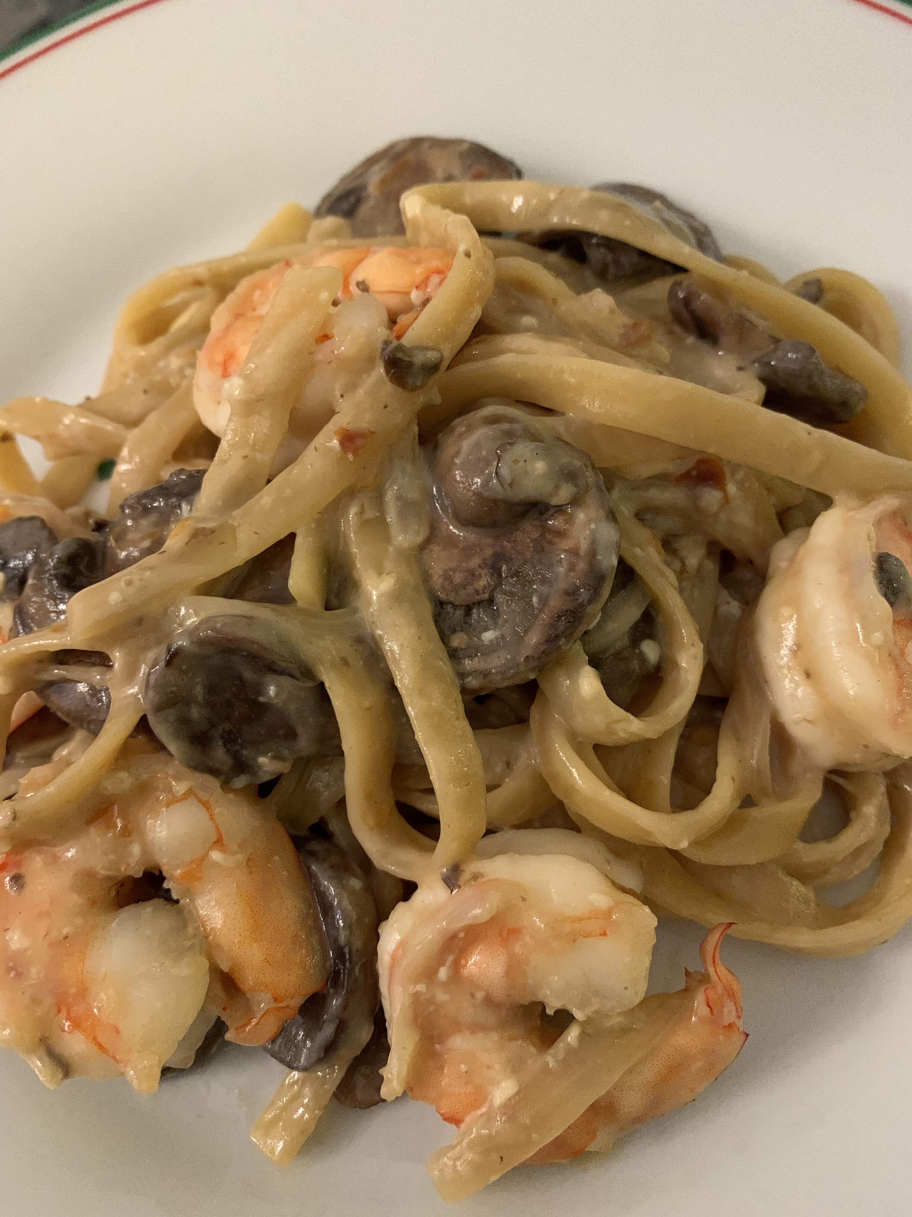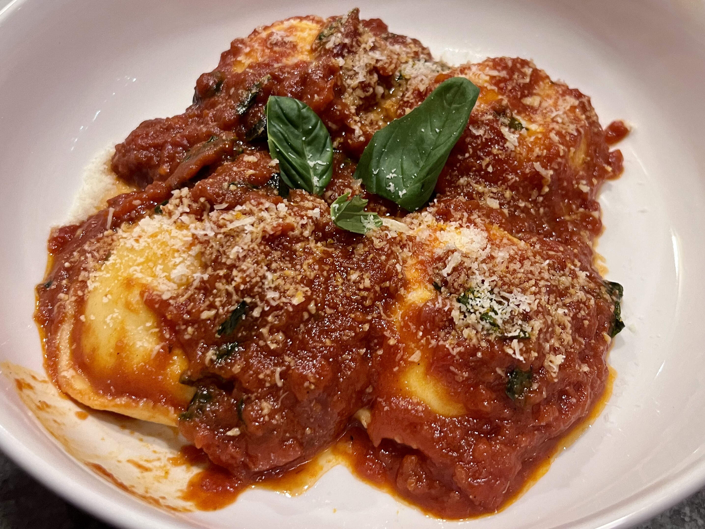 Since we weren’t up for a big celebratory dinner tonight, I made a few of the last box of Talluto’s pillowy, creamy ricotta ravs with about 2/3 of a jar of Rao’s I had in the basement, to which I added a glug of Primitivo, a squeeze o’ tomato paste, a healthy shake of RPF for a touch of heat, and a bunch of fresh basil at the end.