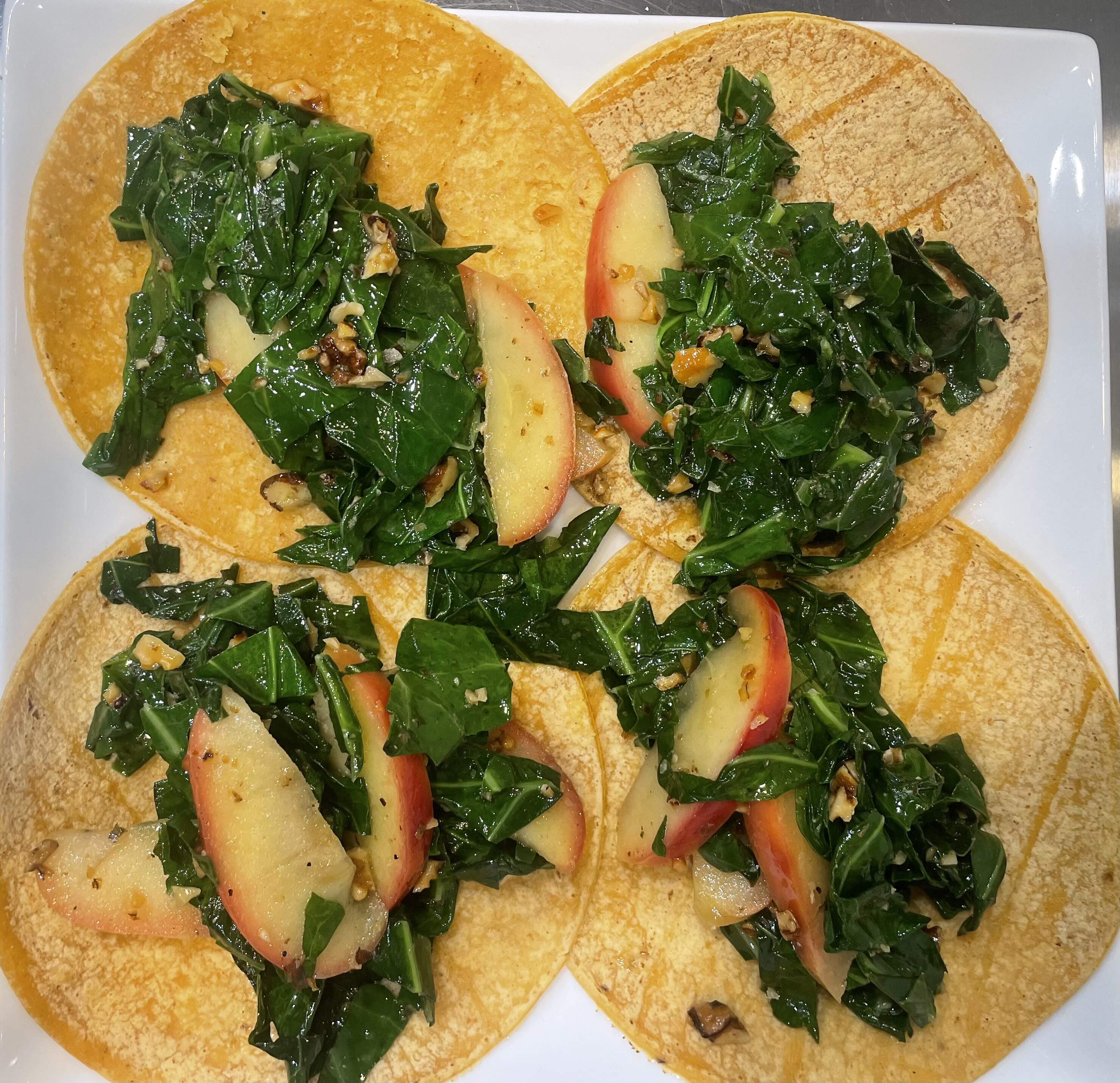 Collard Greens Tacos with Pickled Apples and Walnuts from the “Dos Caminos Tacos” cookbook - for the pickled apples you heat up apple cider vinegar, water, sugar, halved jalapeno and pickling spices until the sugar dissolves and add thinly sliced Gala apples. Let it cool down for an hour and filter off the pickling liquid. Walnuts are getting roasted in olive oil and finely chopped. Sliced collard greens are sautéed in the walnut oil until slightly wilted and mixed with the apples and walnuts. Served on corn tortillas