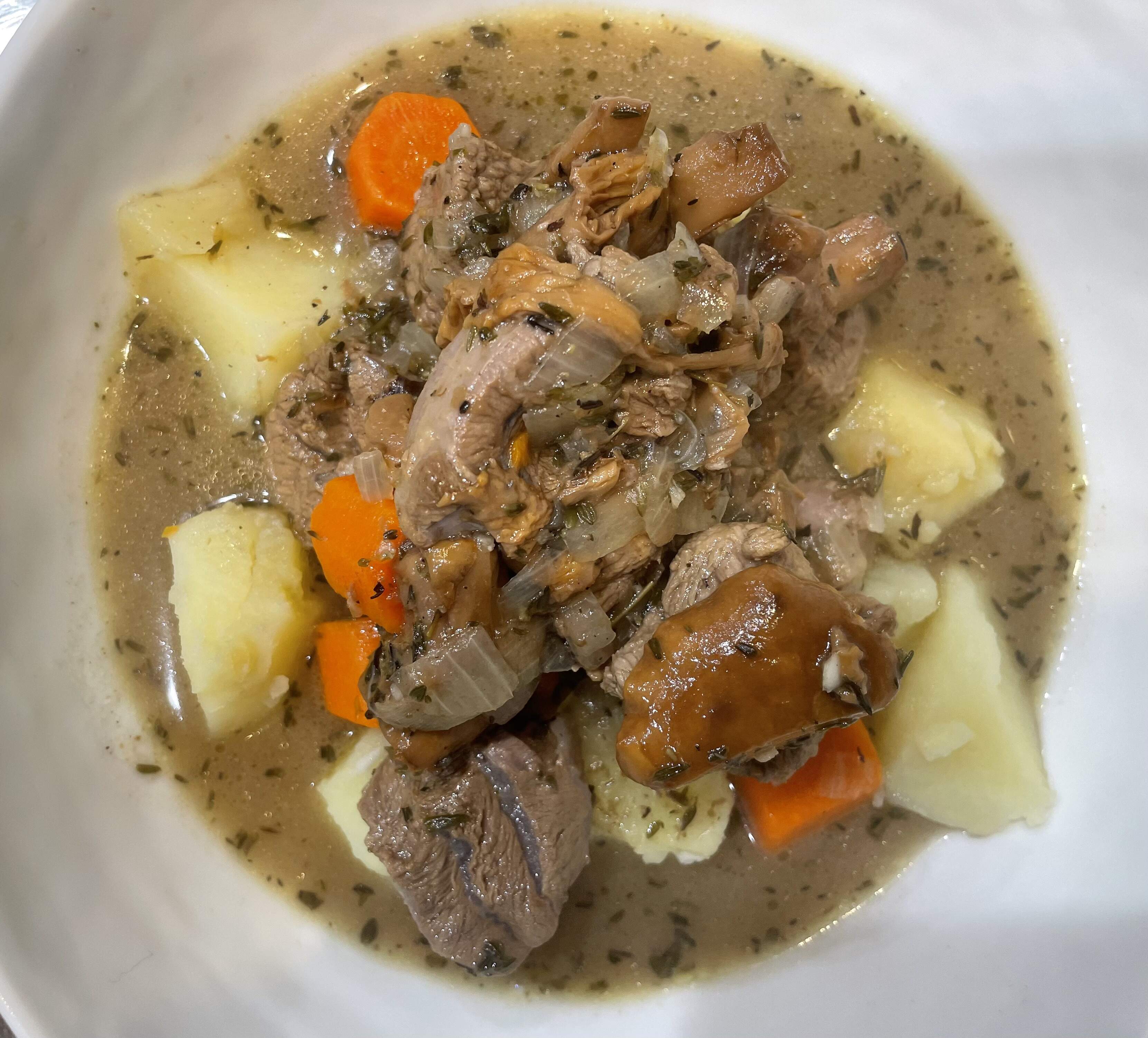 Lamb Stew with Chanterelles and Carrots - simple prepared stew from the Larzac region with lamb leg, chanterelles, carrots, white onion, garlic, plenty of thyme and bay leaves just braised in water and white wine. Served over boiled potatoes
