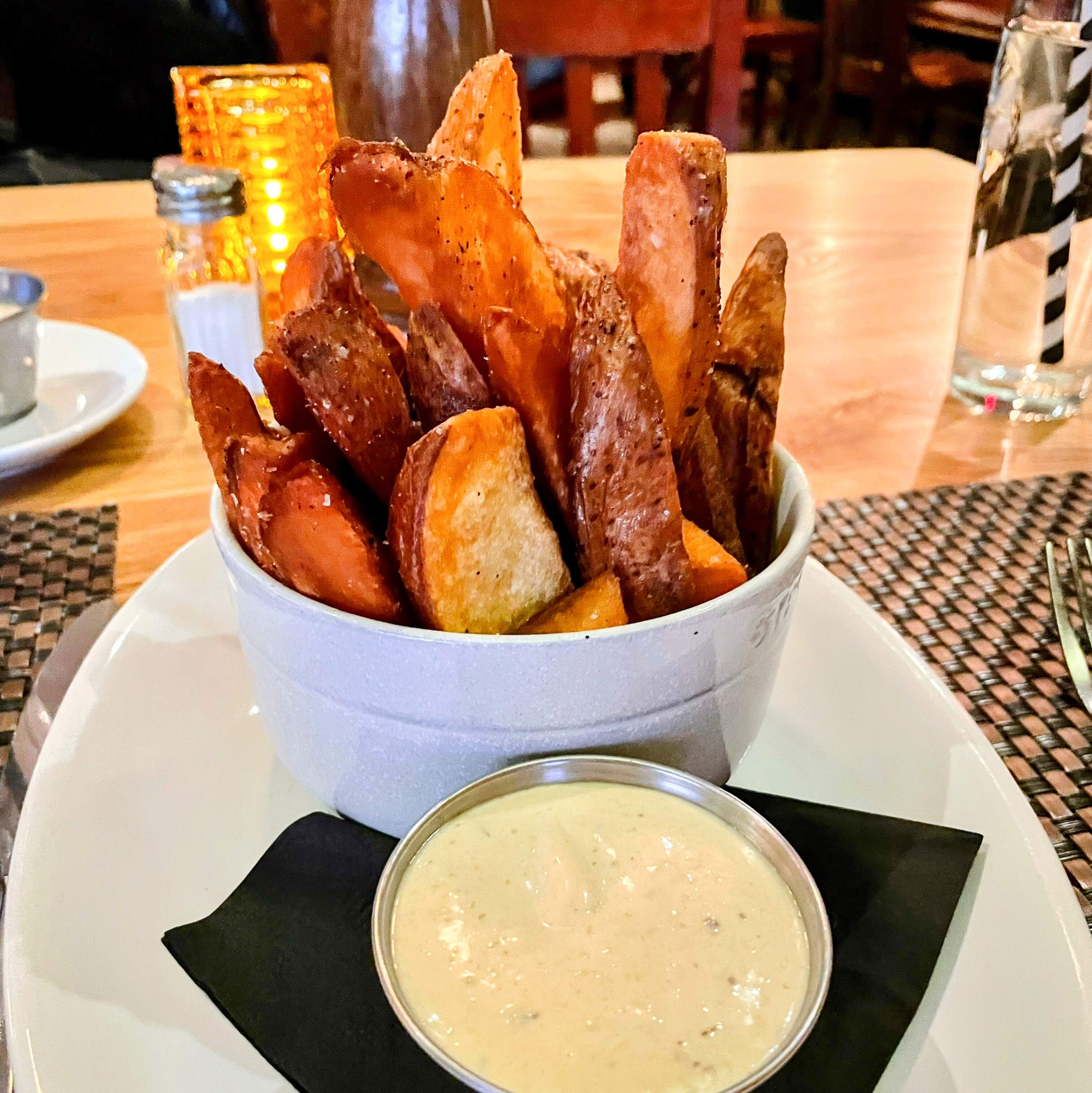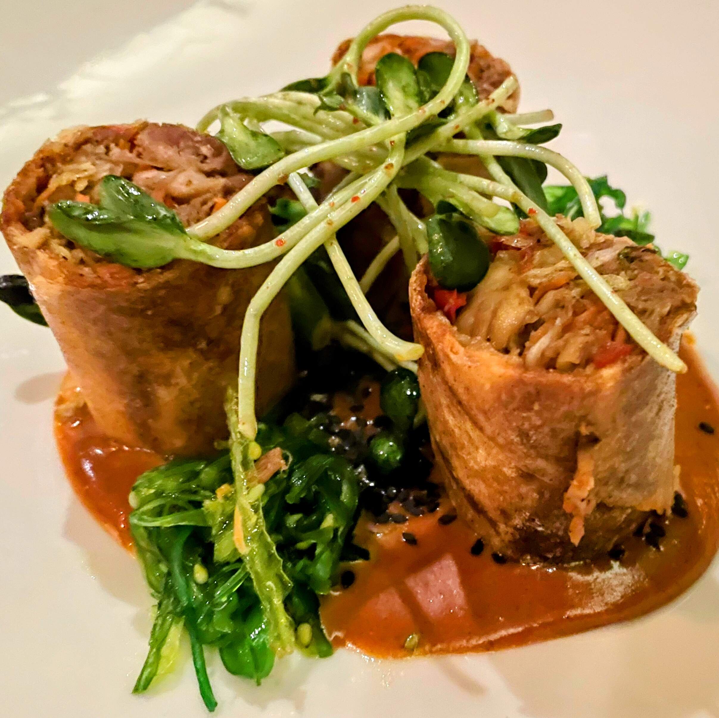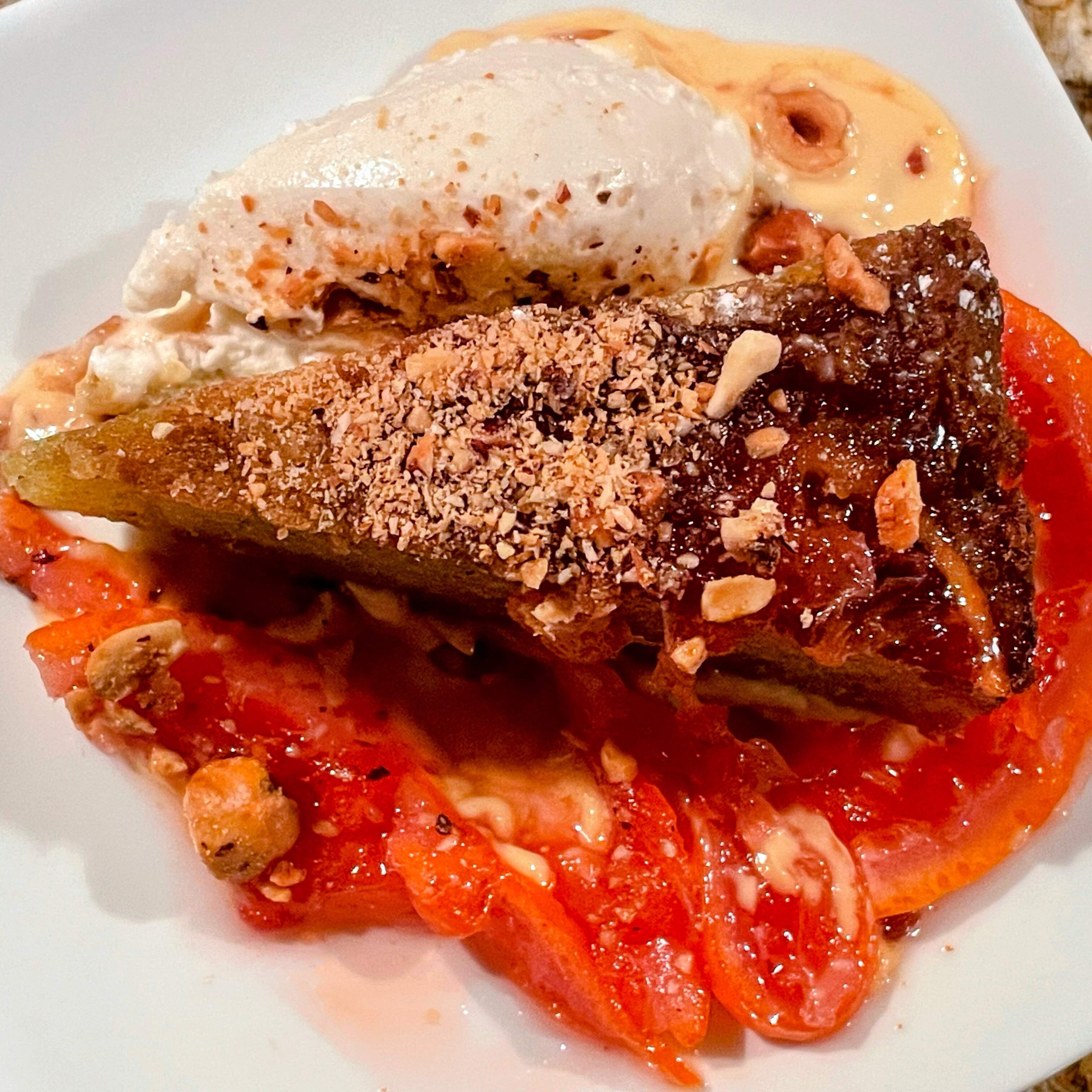 We enjoyed another outstanding dinner at James on Main, in Hackettstown, NJ, including pan roasted black bass with beluga lentils, sunchoke puree, and blood orange butter; excellent rabbit ragu risotto; duck spring rolls with peanut sauce; wood fired pork belly with pineapple habanero glaze; mushroom polenta; fries; and a fantastic blood orange cake for dessert. It all went great with a couple of excellent cabernets.