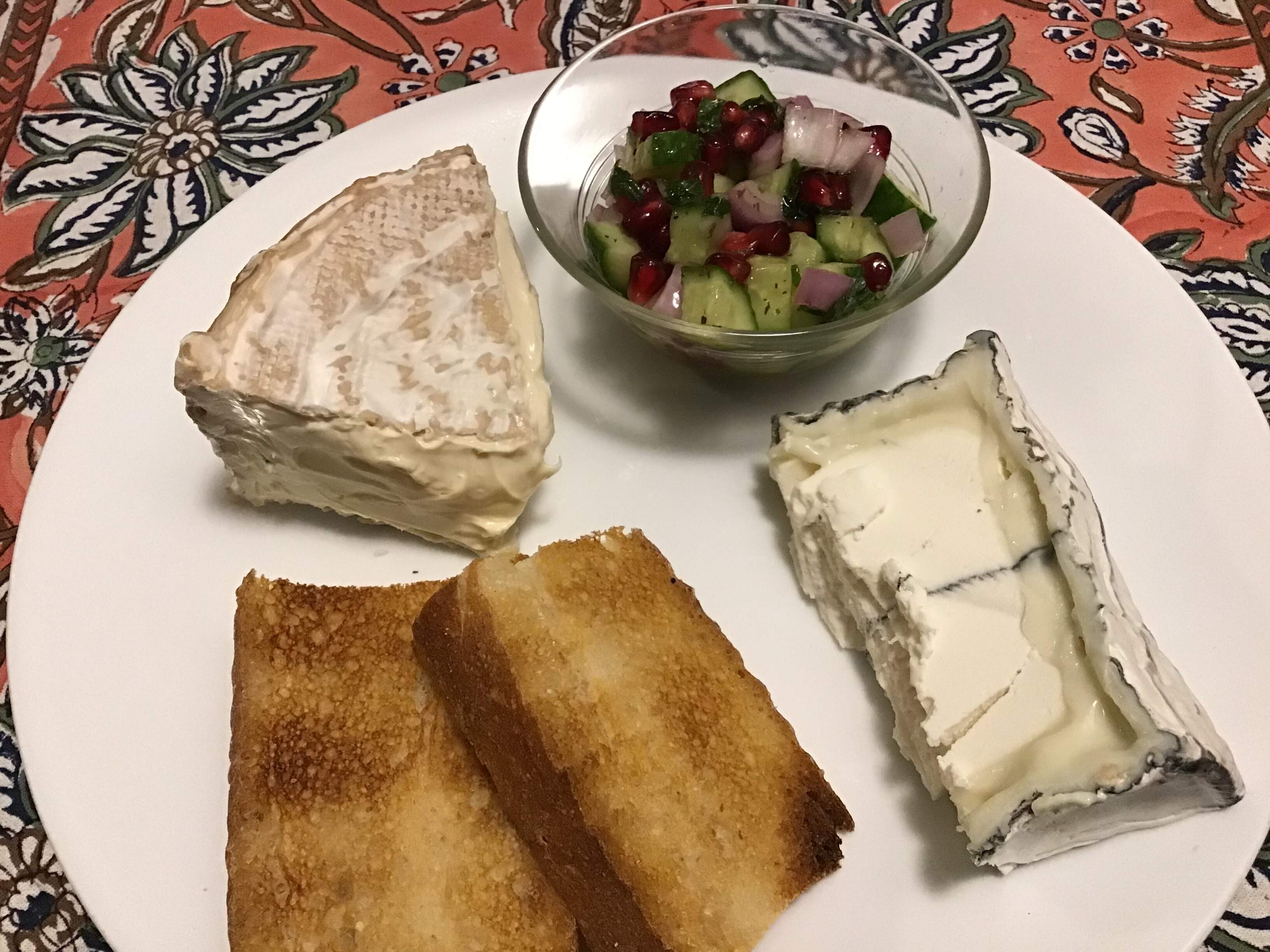 Luscious cheeses gifted by a kind friend, toasted baguette and small cucumber pomegranate salad.