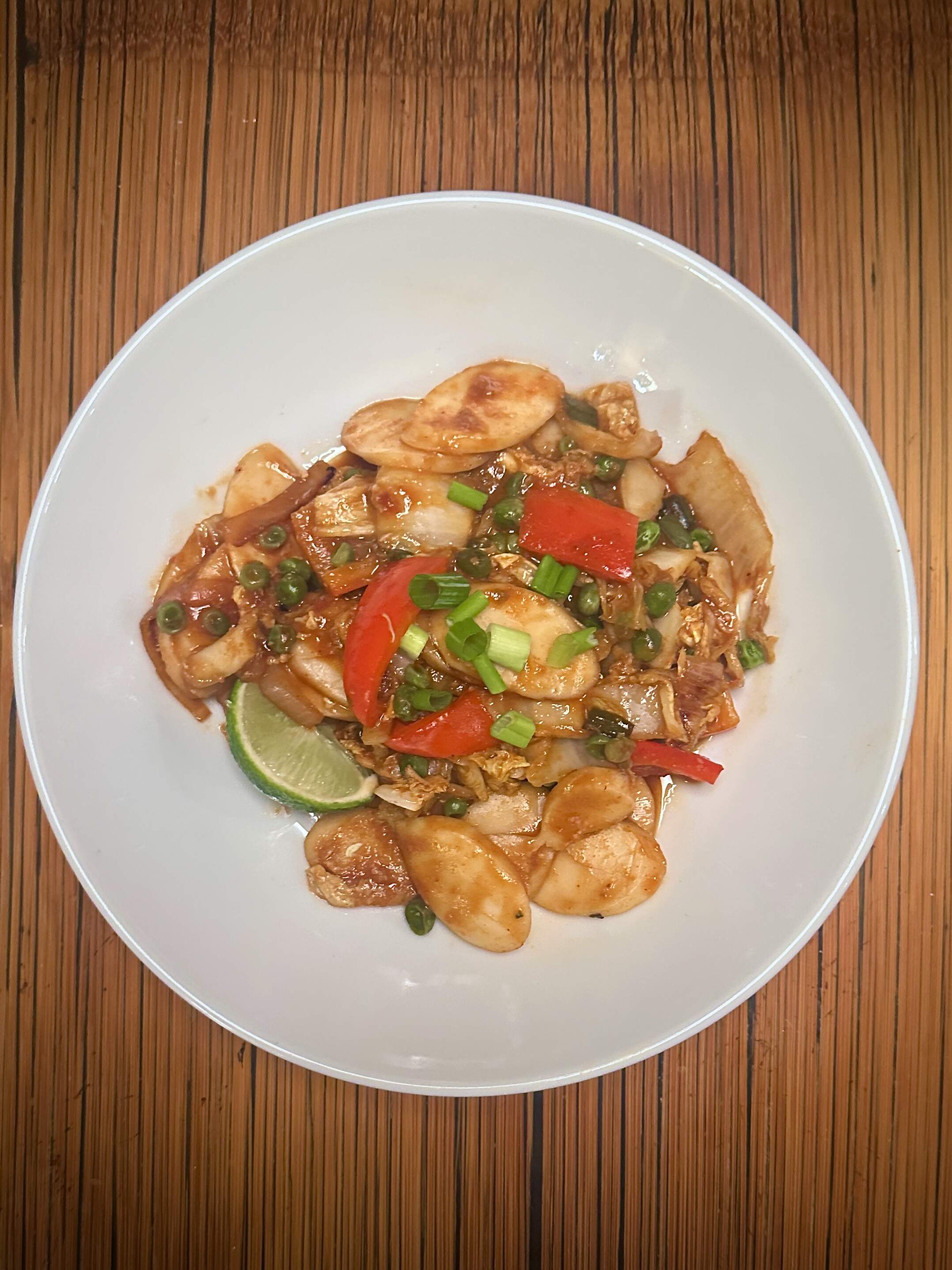 I started off making dinner thinking I was going to make Mee Goreng Mamak (Malaysian Fried Noodles) and then realized I really didn’t have many of the ingredients to do it justice so I ended up winging it. I sauteed garlic, shallots, Napa cabbage, frozen peas, a piece of a red bell pepper and half a jalapeno together with rice cakes. I made a multicultural sauce with ketchup, kecap manis, soy sauce, gochujang and Thai sweet chili sauce. A couple of eggs were stirred in at the last minute. It was surprisingly pretty good.