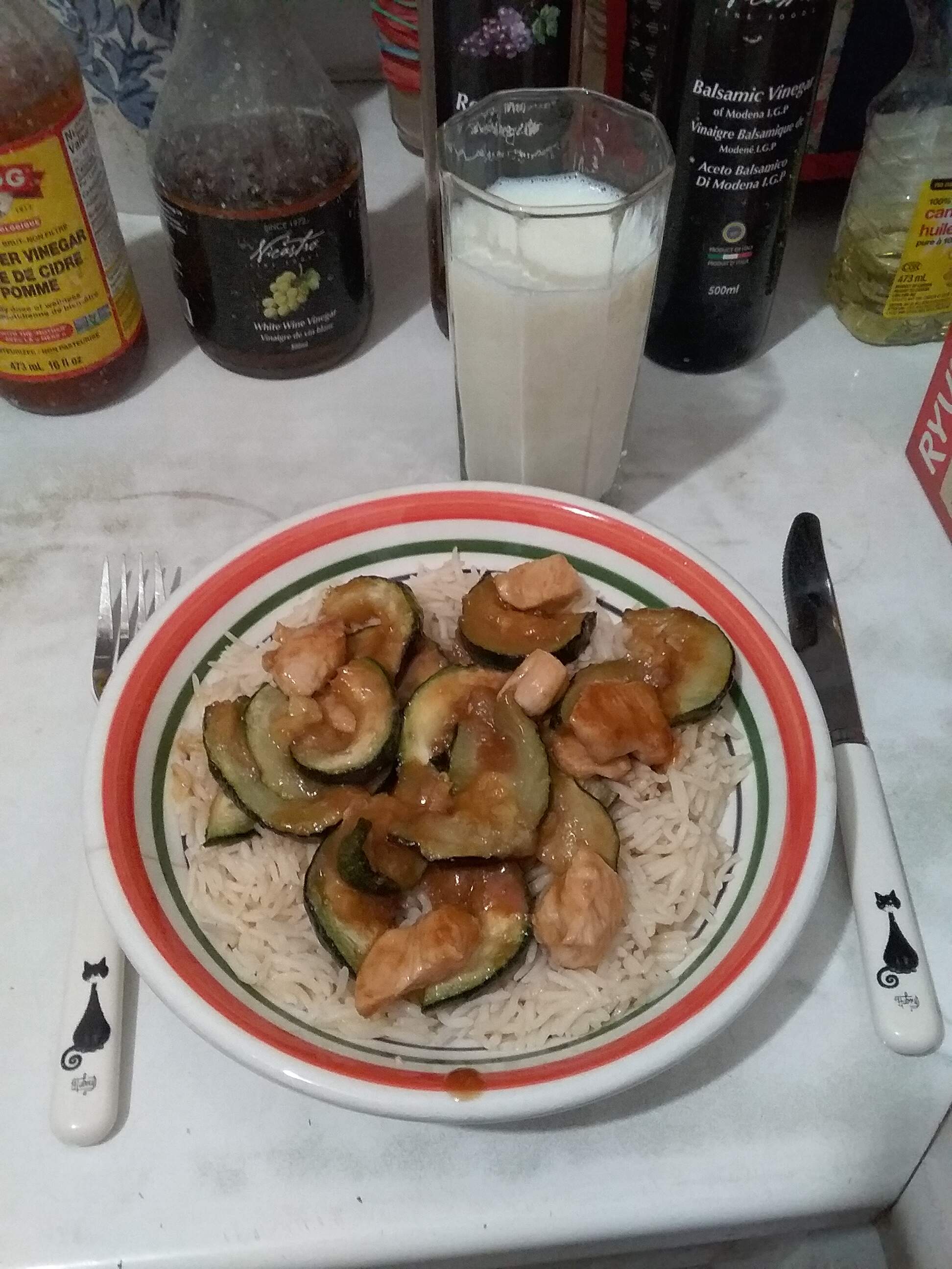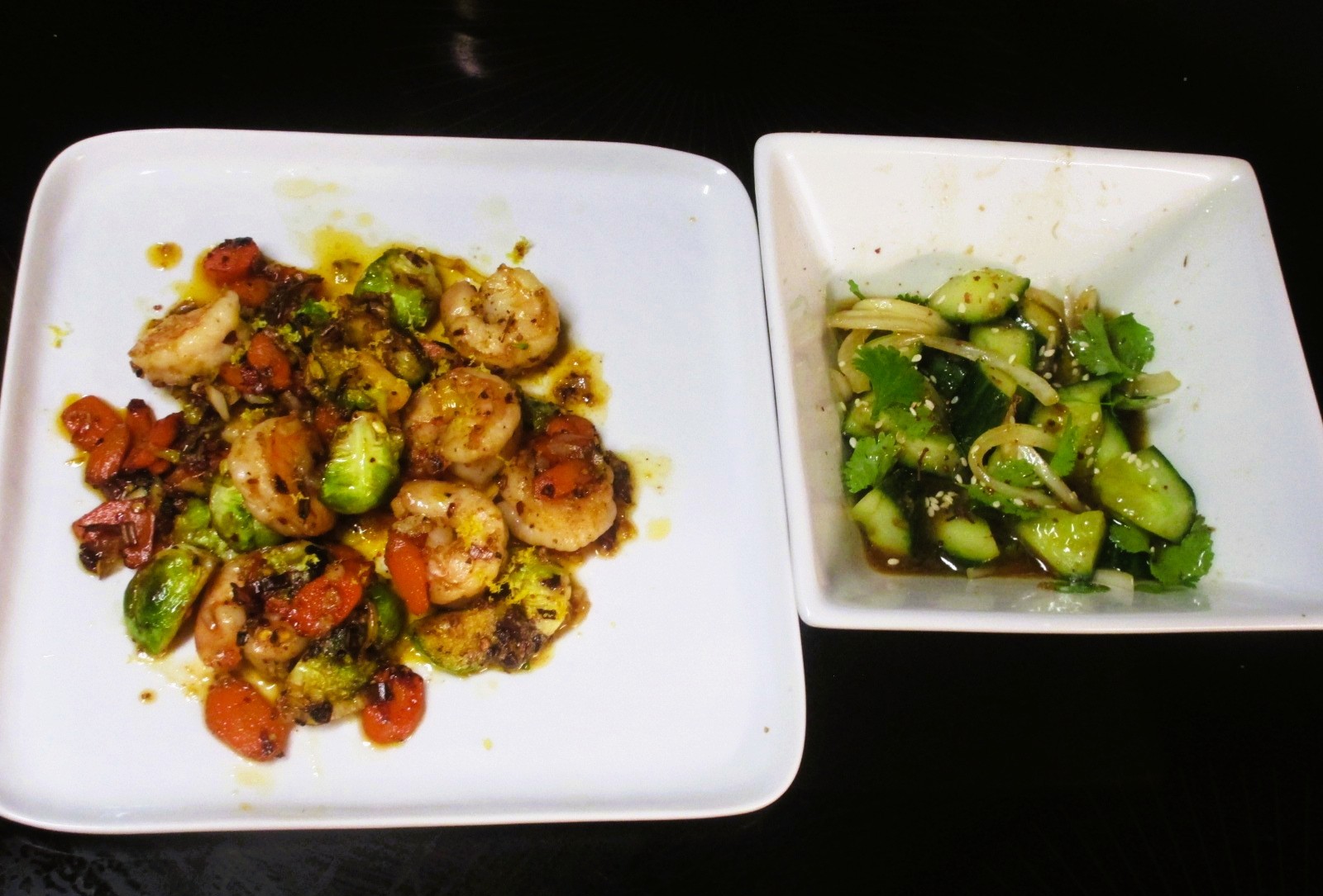 brussels sprouts. Smashed cucumber and onion salad, mystery dressing from the fridge (labeled cuke dressing and tasted of soy sauce), sesame seeds.