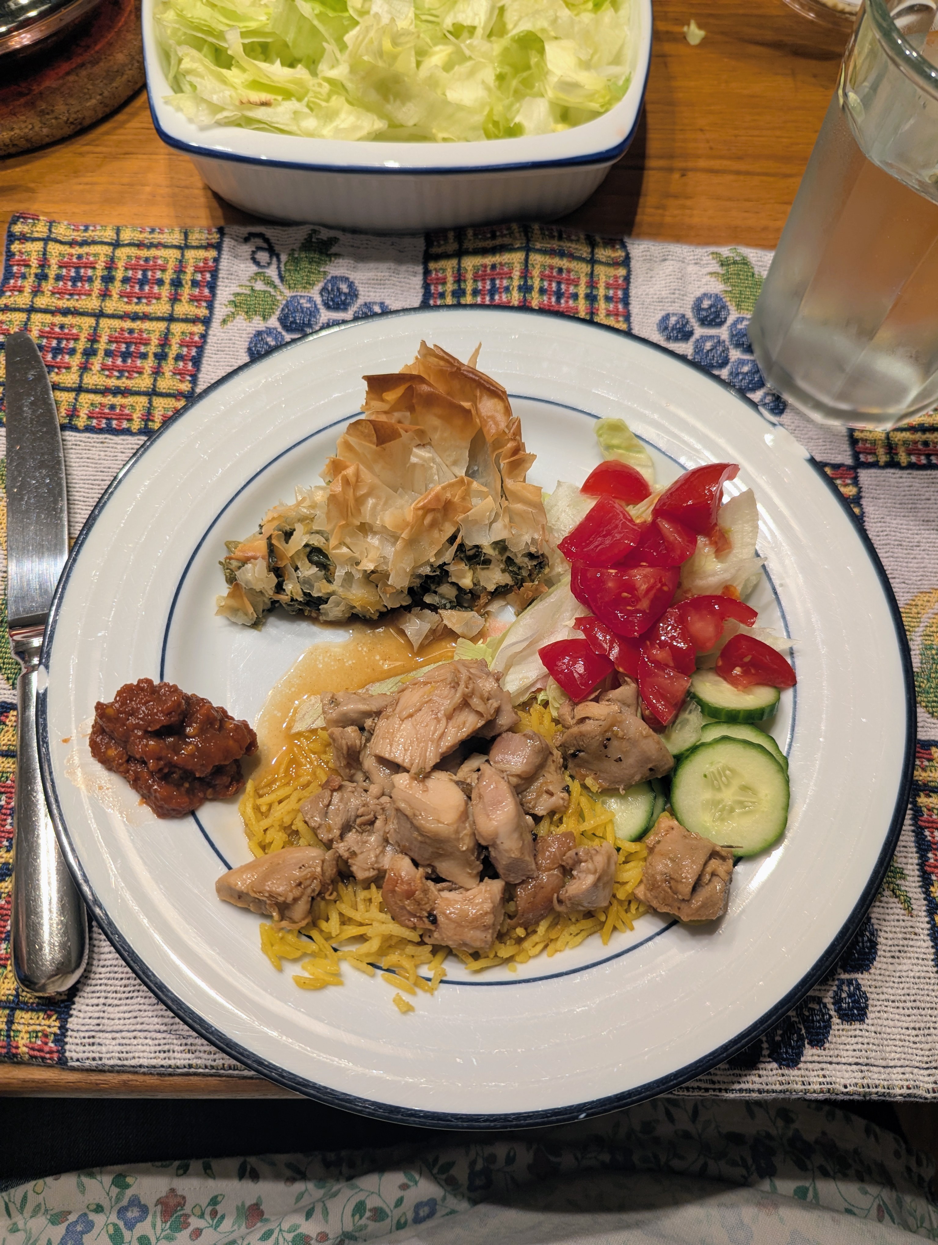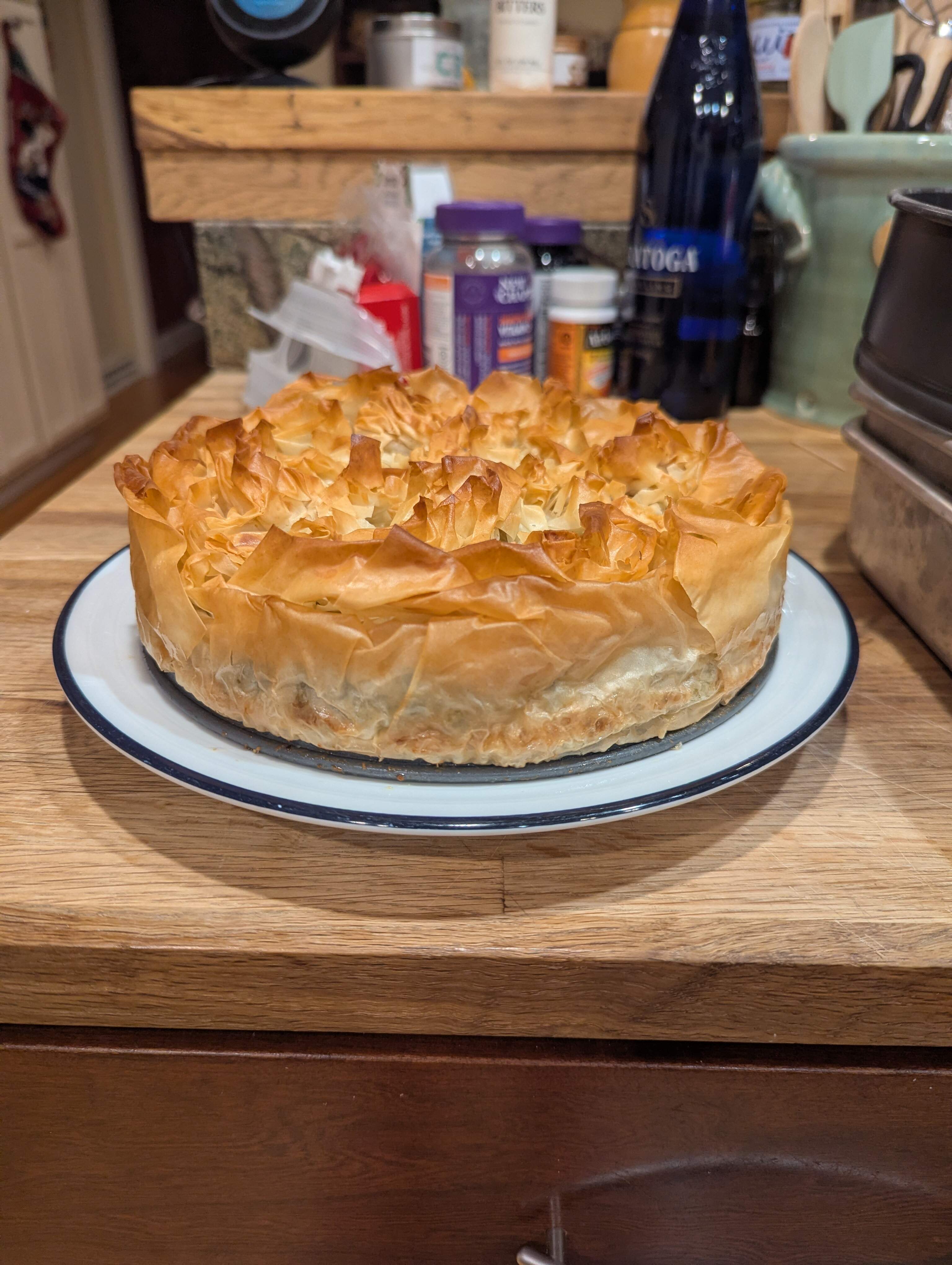 I made a spanakopita pie to bring to a friend’s for dinner. We also brought a feta-yogurt dip my DH made, croccantini, mixed olives, “hummus chick” hummus (all tahini - delish!), and purchased baklava. My friend made Serious Eats’ halal cart chicken with rice and salad. So good! I overdid it; everything was delicious and dinner was later than our usual Early Bird special.