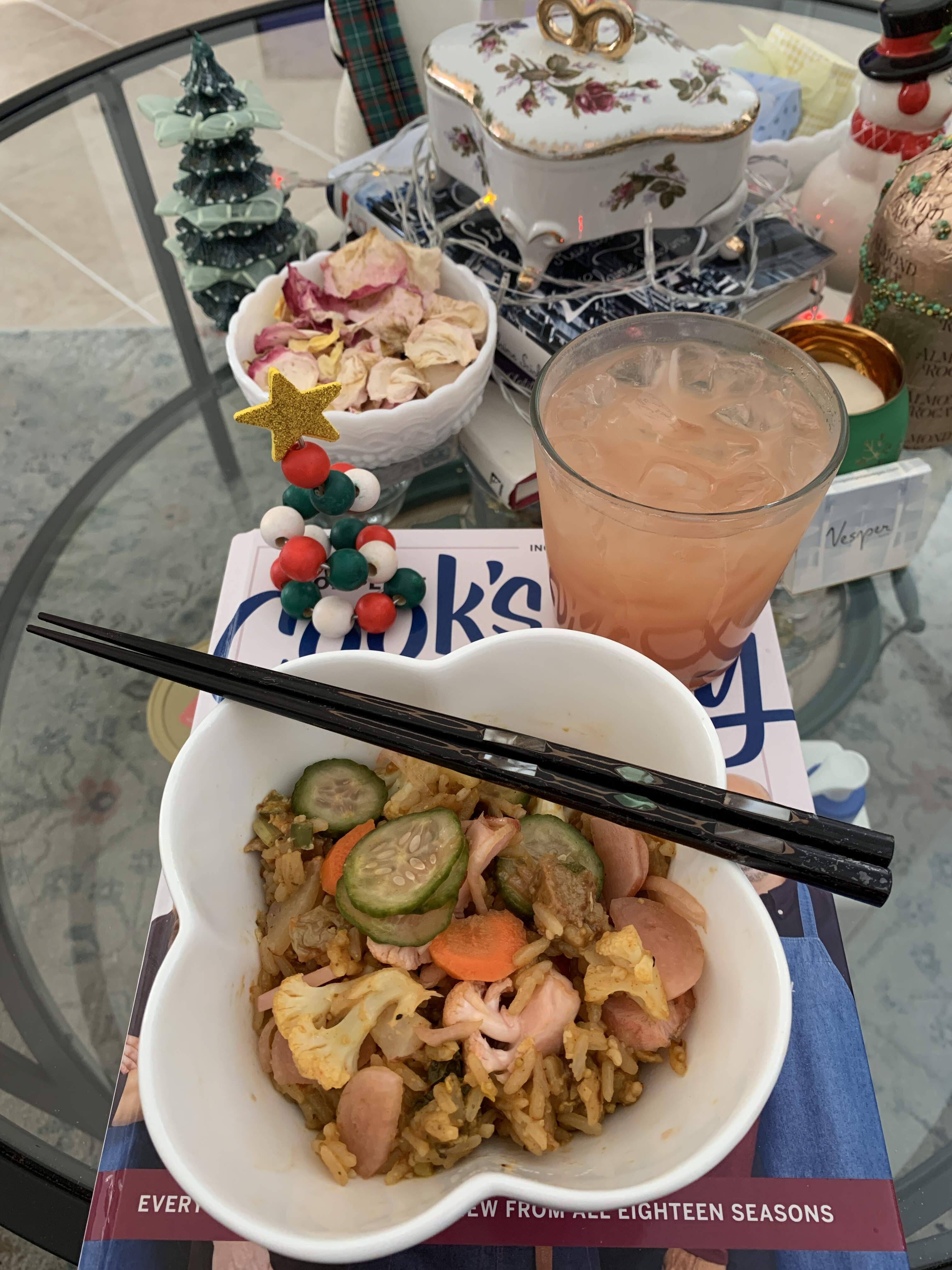 Made “fried rice” with leftover pork tenderloin, egg, and vegetables. Pickled veg as a garnish. Chopsticks are my favorite, purchased in the 70s at Adventureland in Disneyland Anaheim.