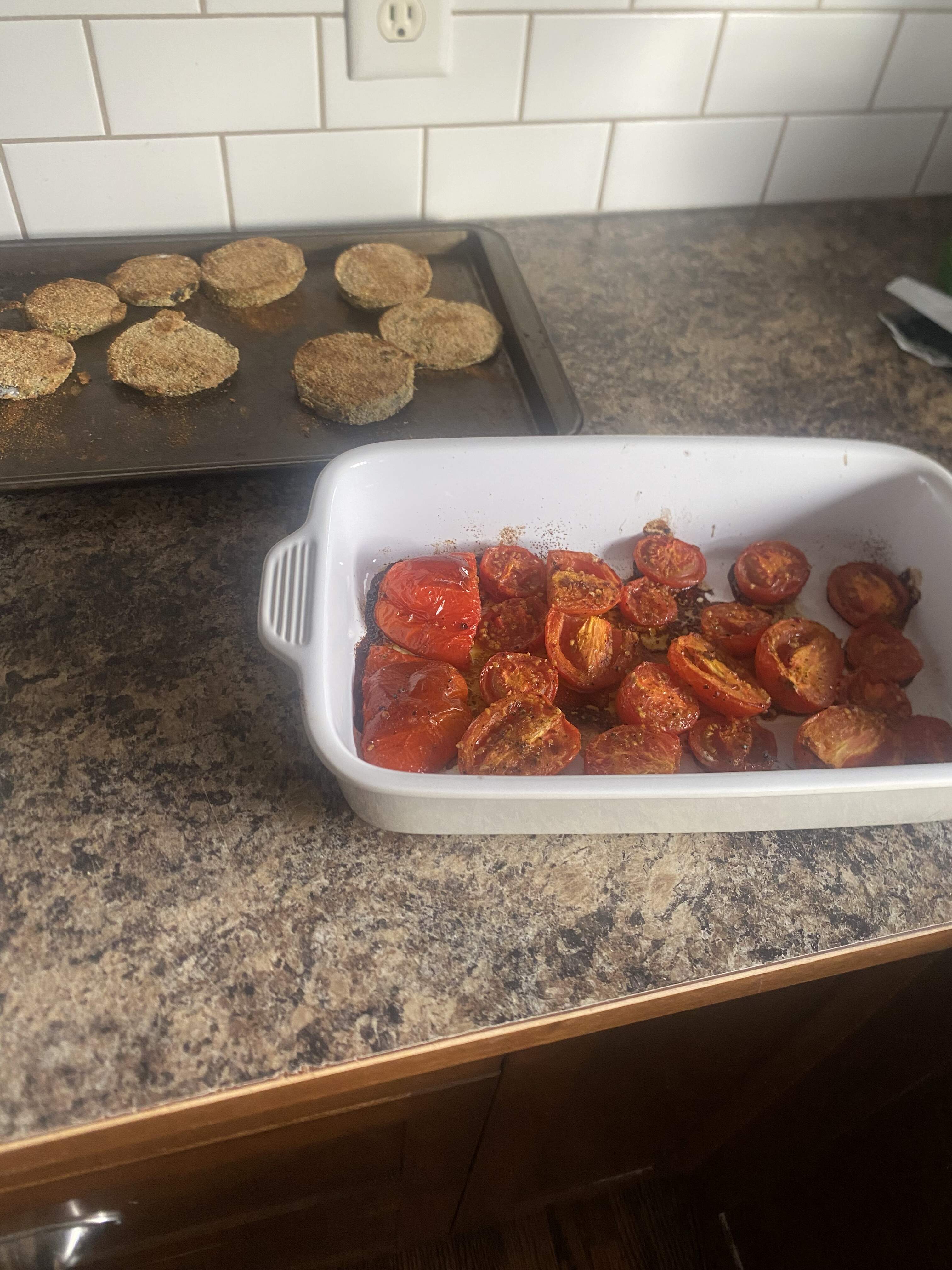 I made eggplant parm but forgot a picture of the final product. Here are some eggplant cutlets I had frozen last time, and the roasted tomatoes before they were sauced.