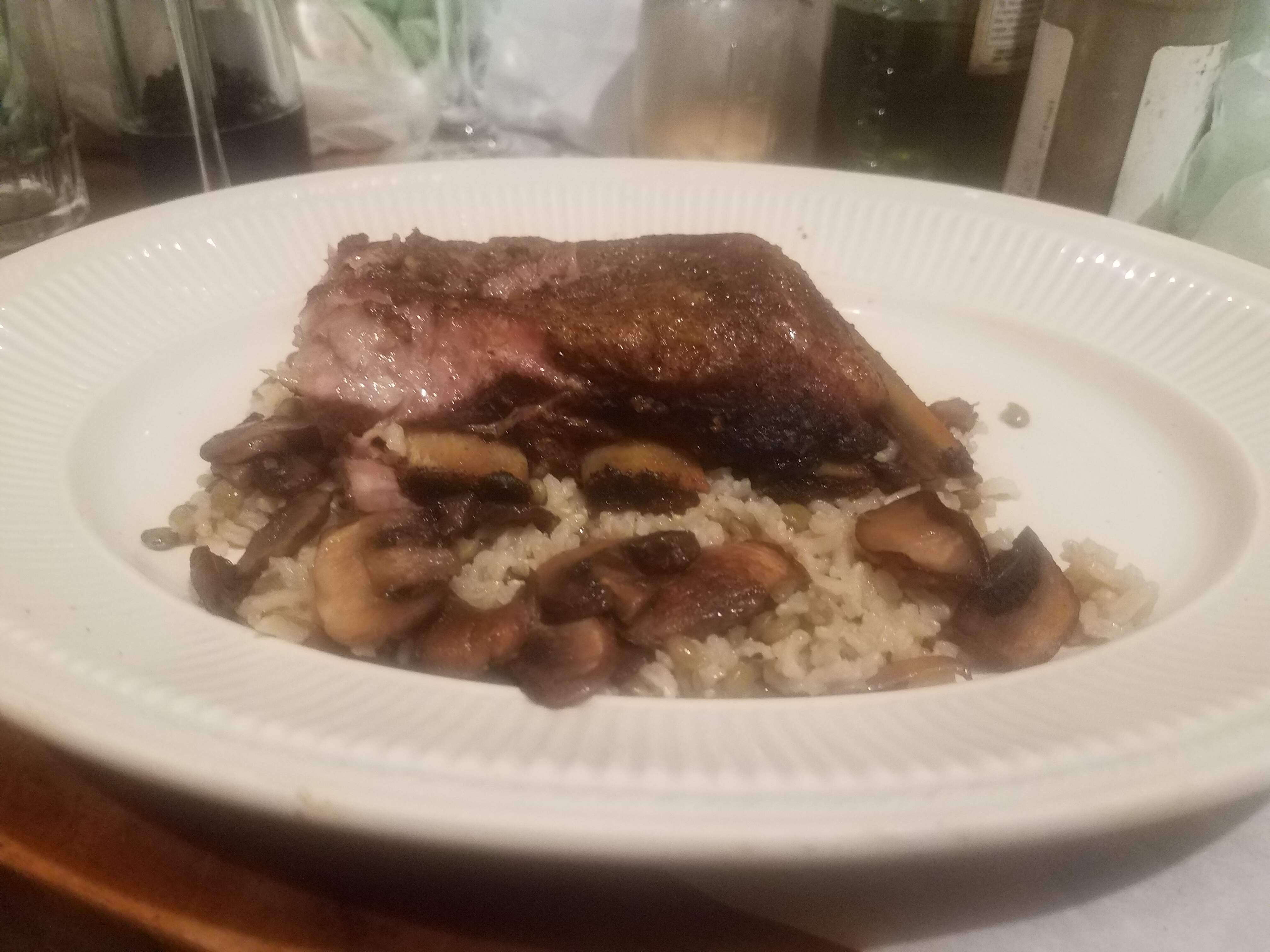 Four hour spareribs, the meat falling off the bone when I tried to cut them apart. Brown rice and lentils, crimini mushrooms.