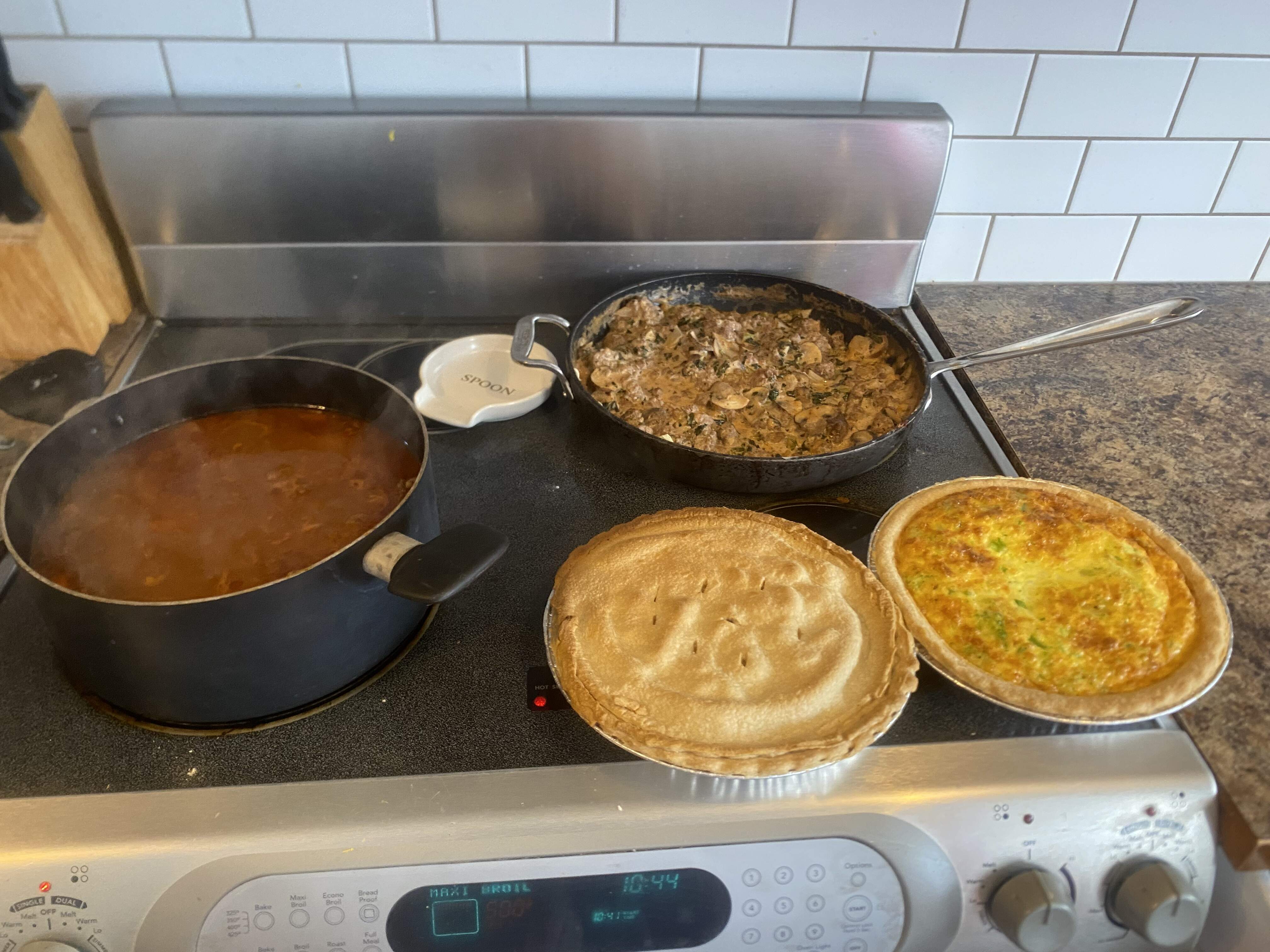 I’m going to be home alone the 24-27, so I made some grub for the freezer. Lots of time since the Bears beat the Packers yesterday, thank you very much. We headed to a new to us spot to watch the game. BOGO half off for appies. The three of us shared wings, potato skins, stuffed yorkies and some cauliflower wings. The food was actually pretty decent, so we will be checking it out again. Anyway, the freezer got a broccoli-Gruyère quiche, stroganoff without the noodles, a turkey pot pie and a lot of beef stew.
