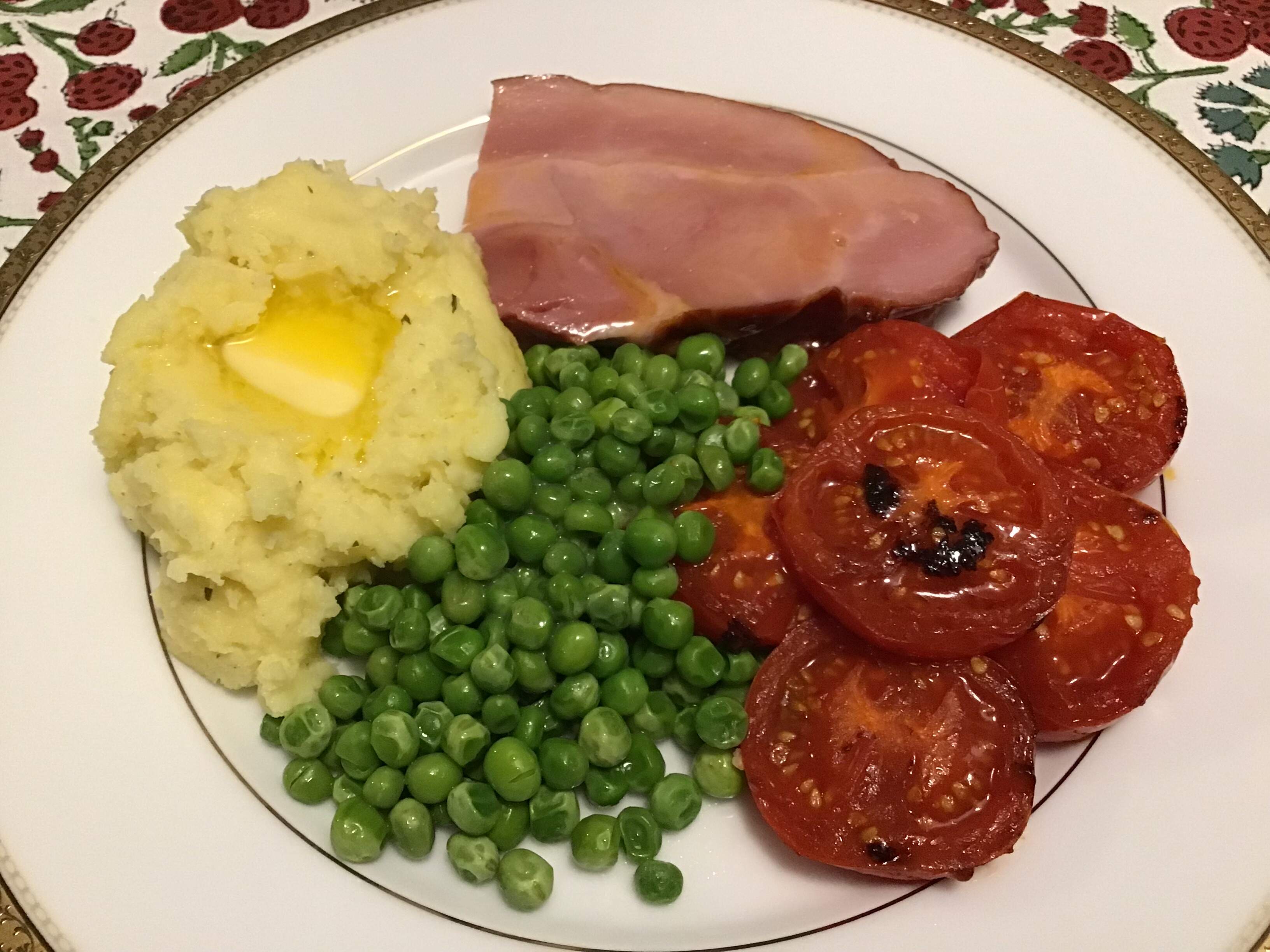 Ham, black truffle Boursin mashed potatoes (delicious! highly recommend!) with butter lake, buttered baby peas, tomatoes.