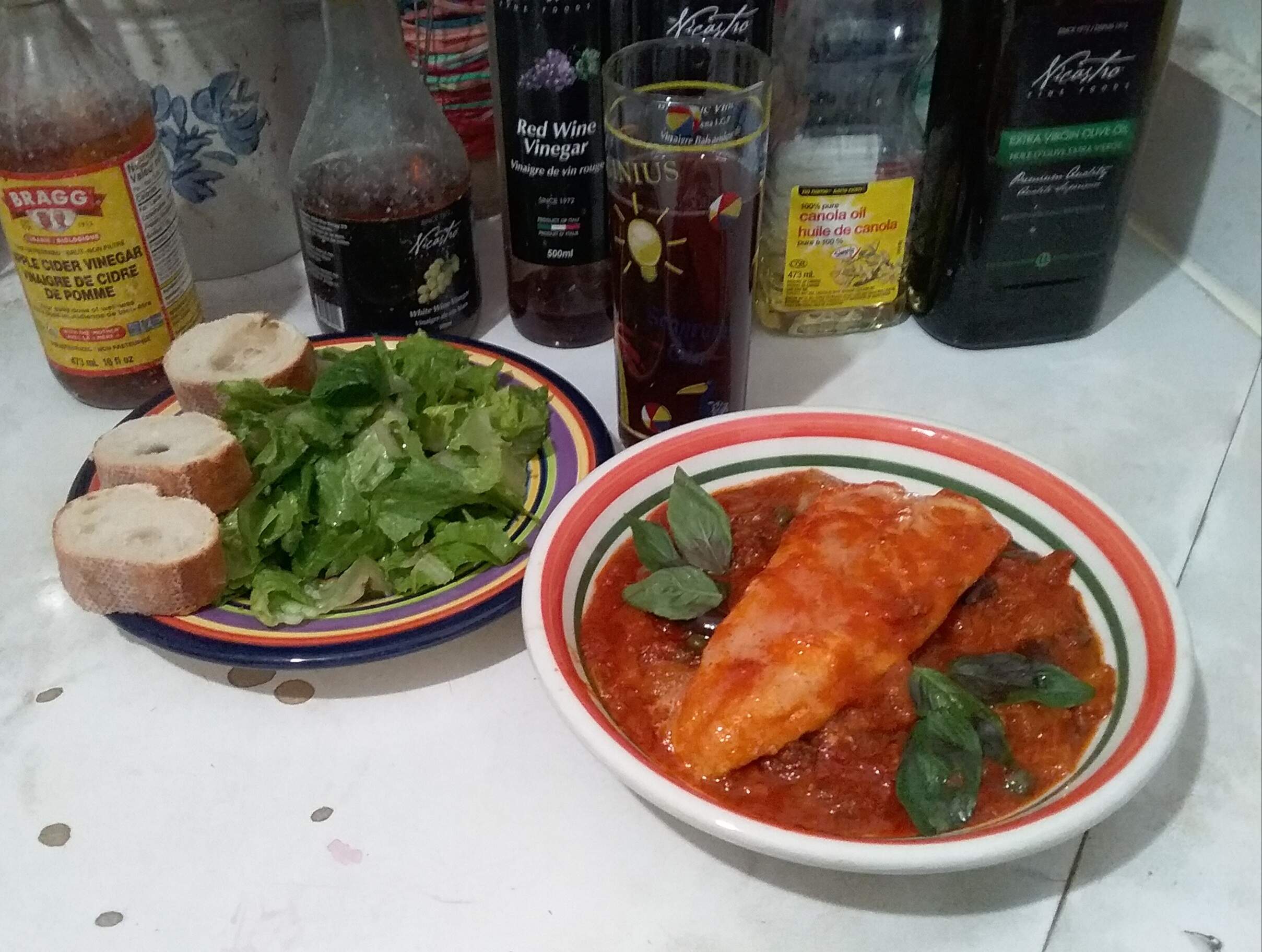 Christmas Eve dinner was a basa fillet simmered in a marinara sauce with olives and capers. I had a caesar salad on the side minus the croutons since I had a fresh baguette so I had a few slices to mop up the sauce.