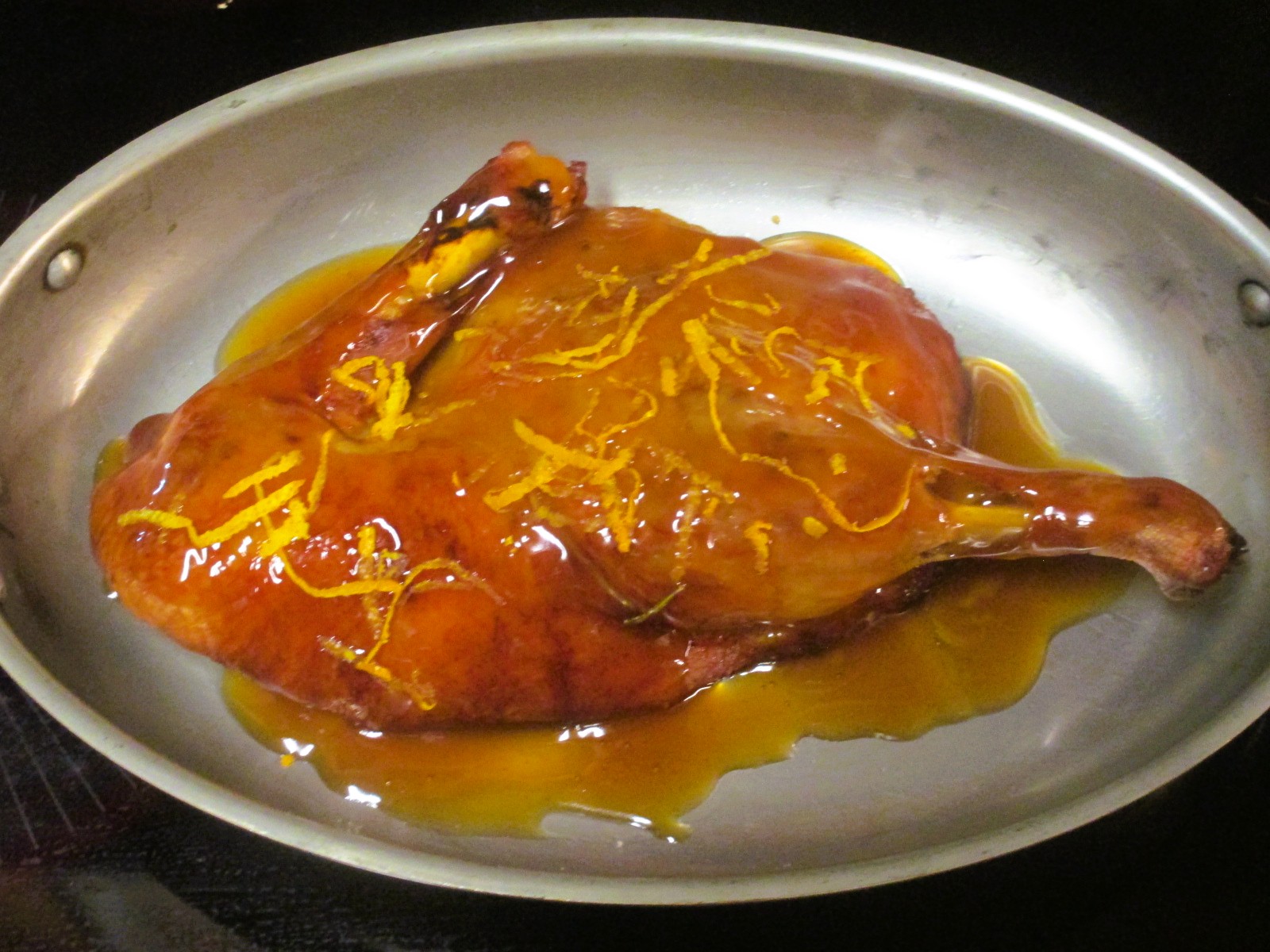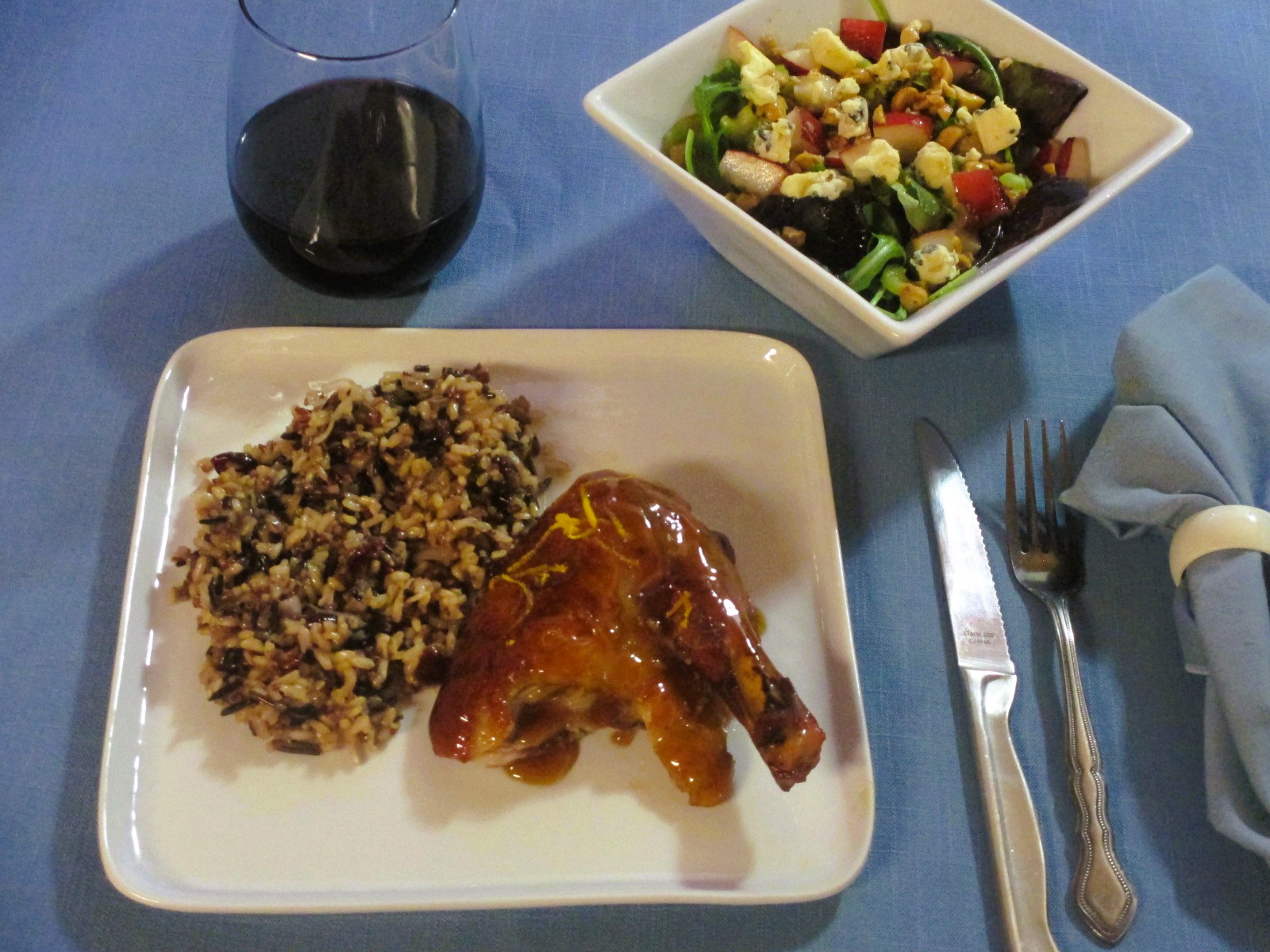 Duck à l’Orange. I did not roast the duck, I bought a half roasted duck from Maple Leaf Farms and just made the sauce. 'Twas very good. Rice again, this time wild blend gourmet rice, craisins and shallots; Baby butter leaf and arugula salad with celery, red Anjou pears, hazelnuts and cambozola, sherry vinegar & oo dressing. There was a Manhattan and wine with.