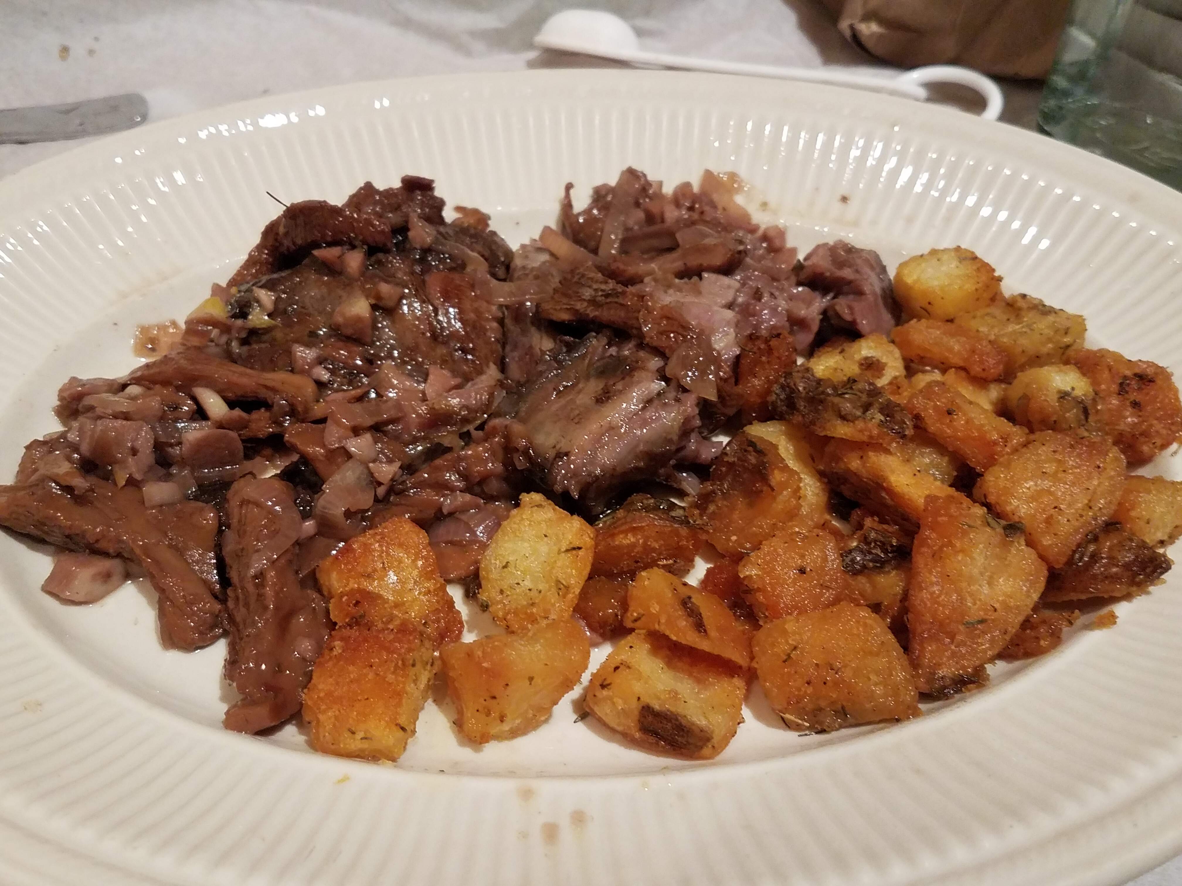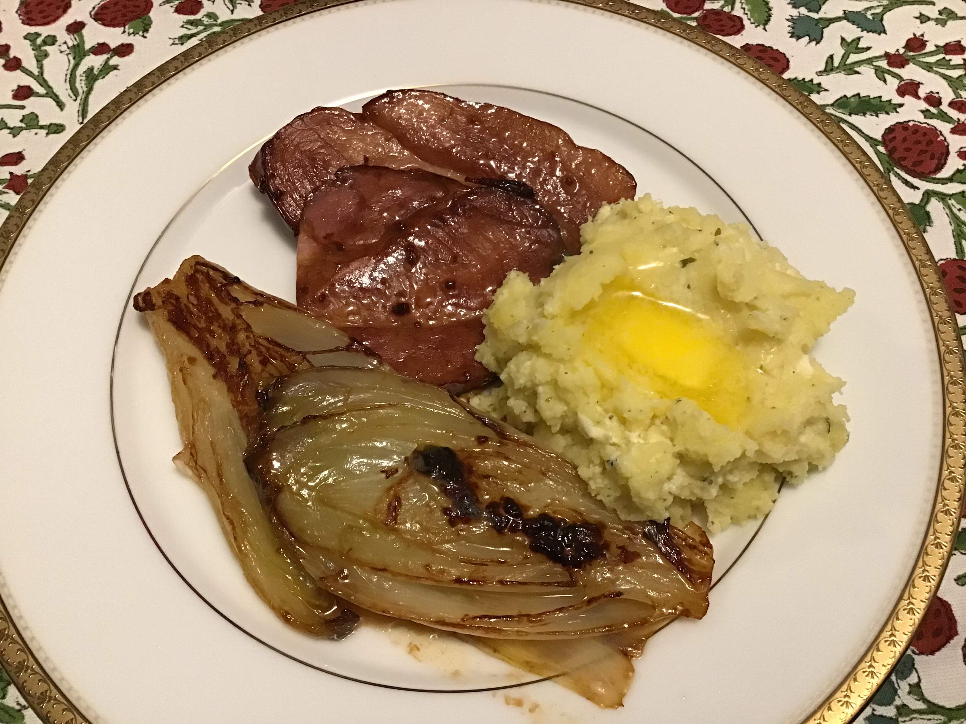Beige but tasty. L/o black truffle Boursin mashed potatoes with more Boursin added were even better. Plus ham heated with pomegranate molasses and whole seed mustard and braised endive.