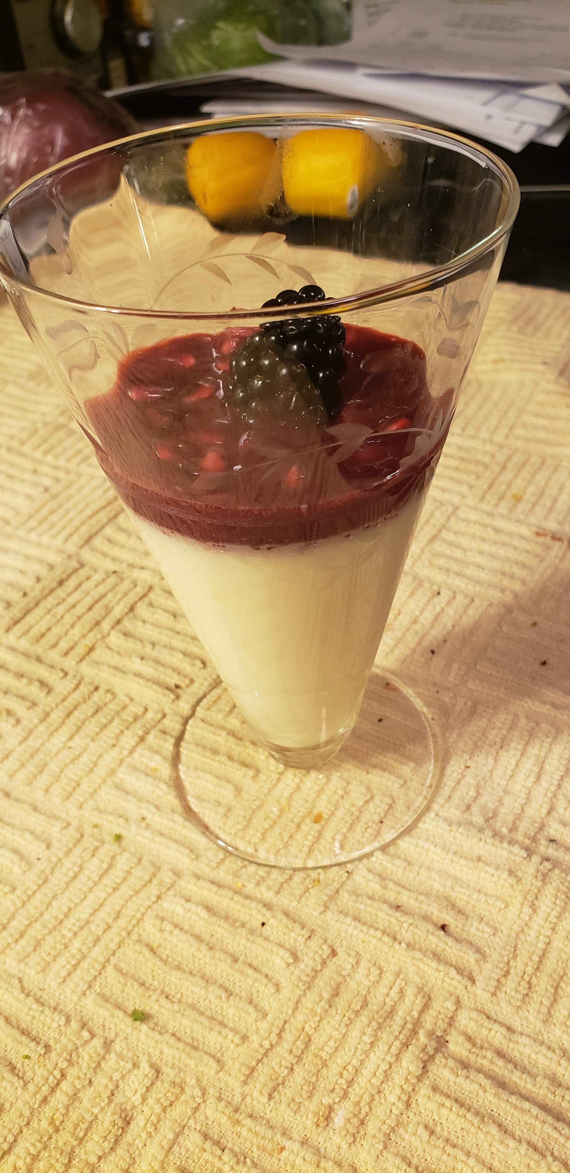 Dessert was Lemon Posset with a blackberry coulis, pomegranate arils, and an XL blackberry on top.