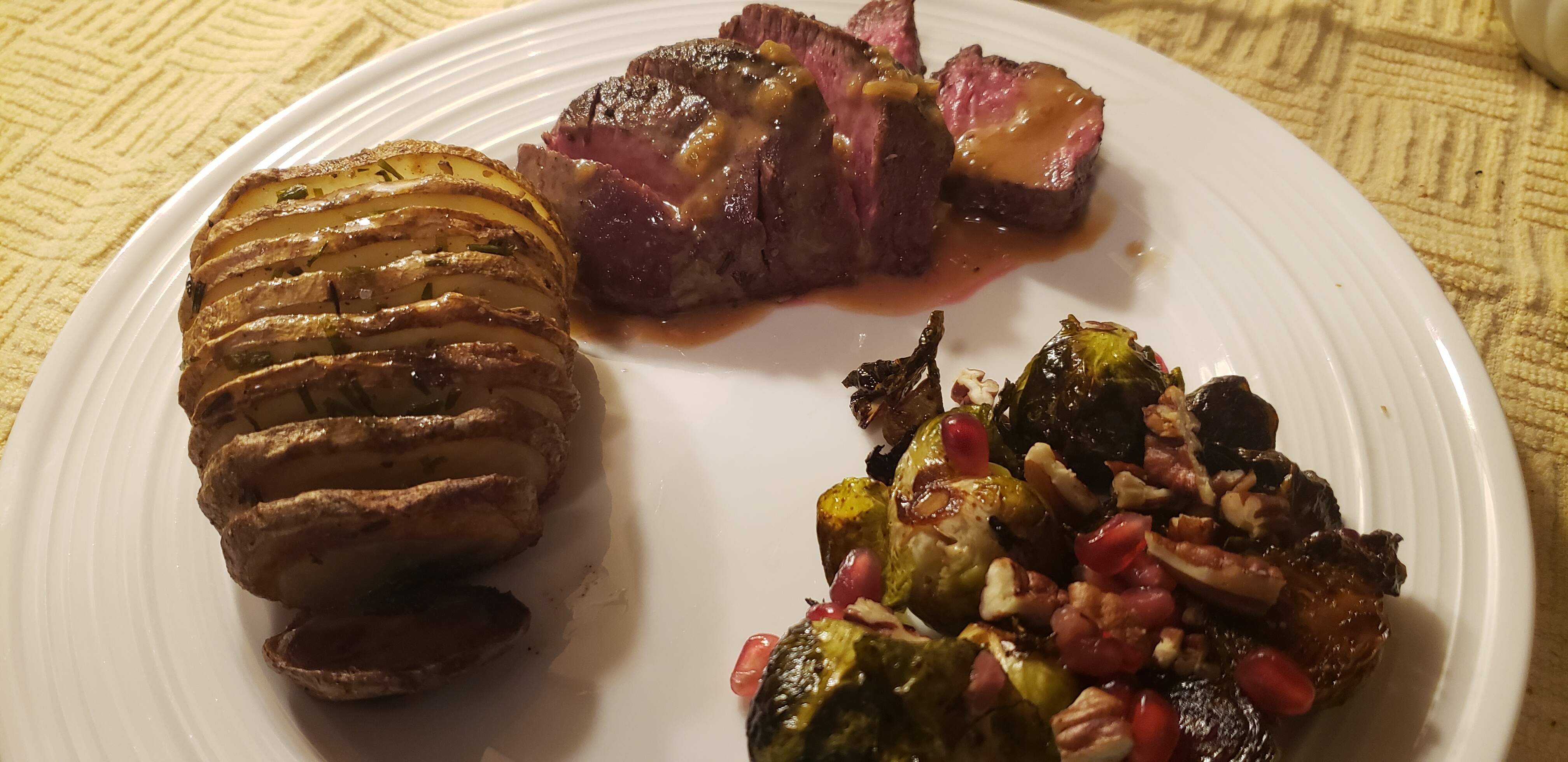 A perfectly medium-rare Angus Prime beef tenderloin from Wegmans with cognac cream sauce, a half a Hasselback Russet potato with chive butter, and roasted Brussels sprouts tossed with olive oil and balsamic vinegar with pomegranate arils and toasted pecans.