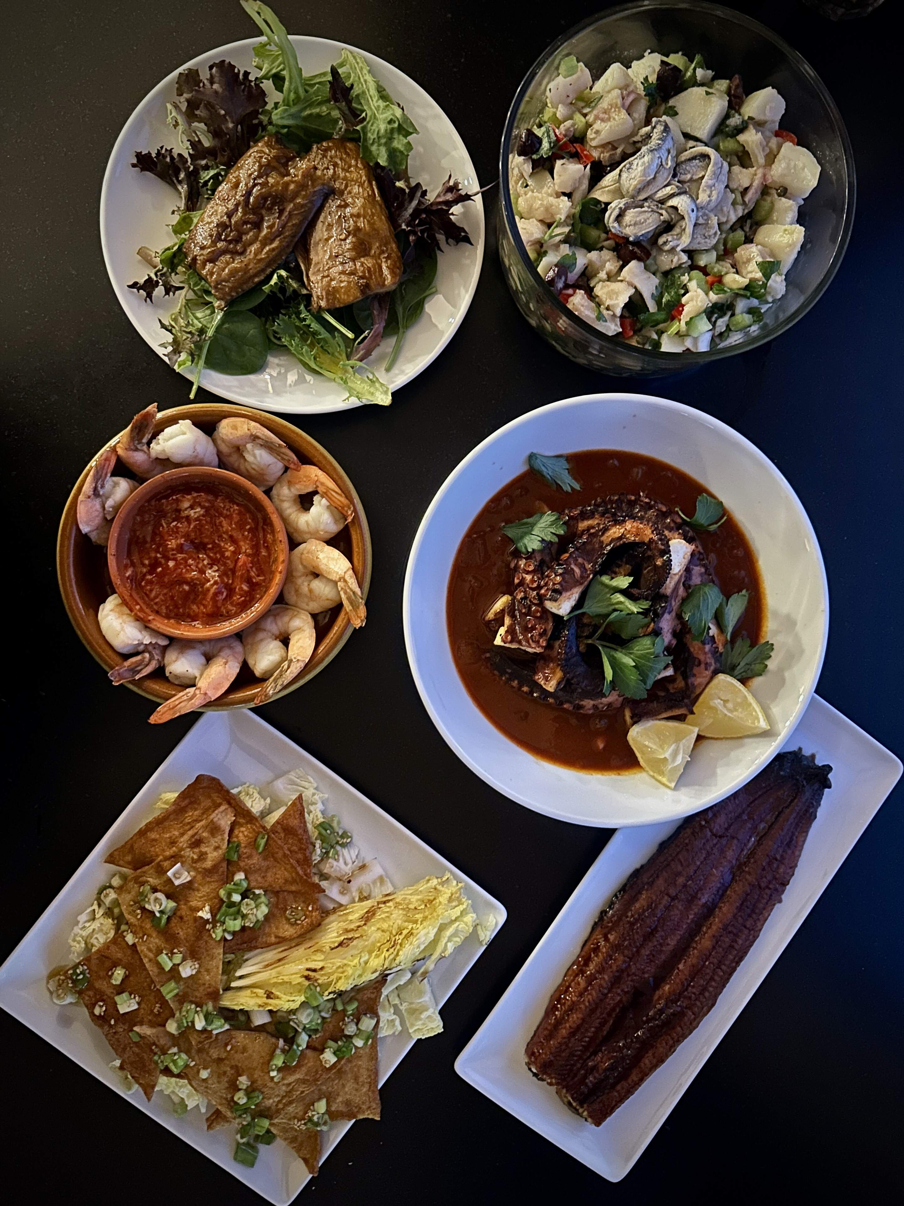 Thank you. Except for the octopus and baccala, I had everything else in the house. I was one fish short until I added the anchovies to the salad.