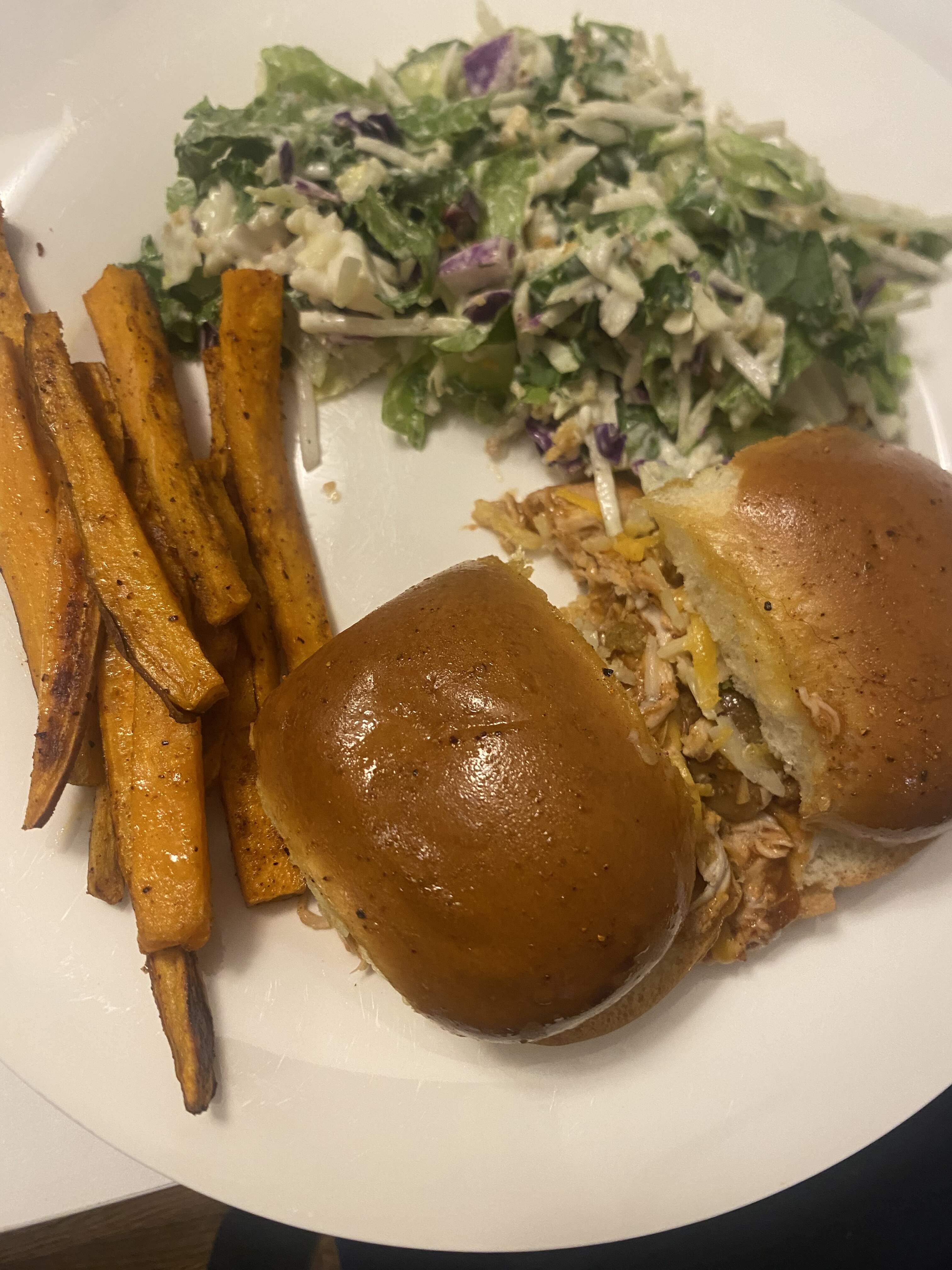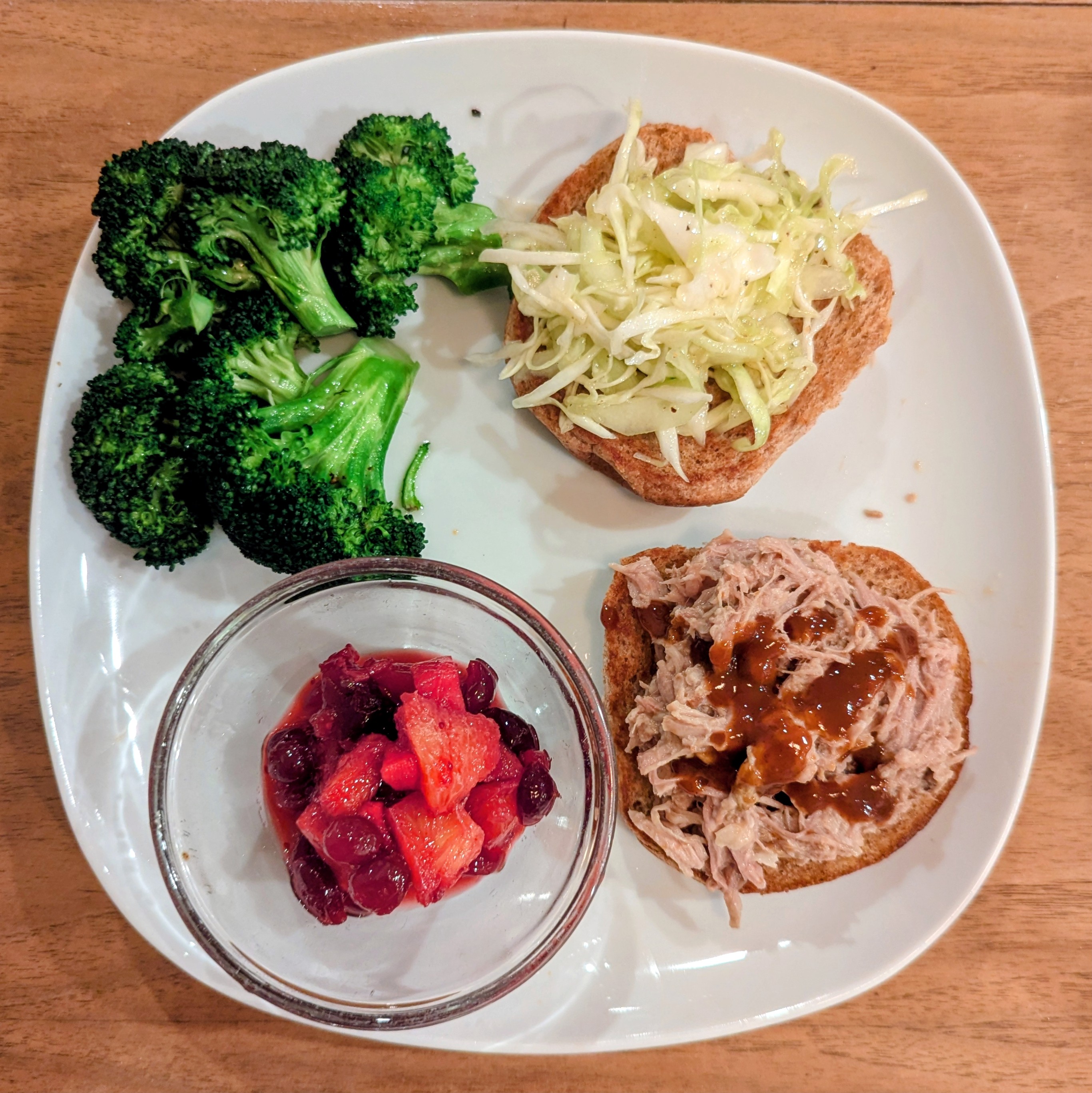 Tonight’s dinner was pulled pork from the freezer on toasted whole wheat buns with slaw vinaigrette, buttered broccoli, and leftover cranberry sauce.