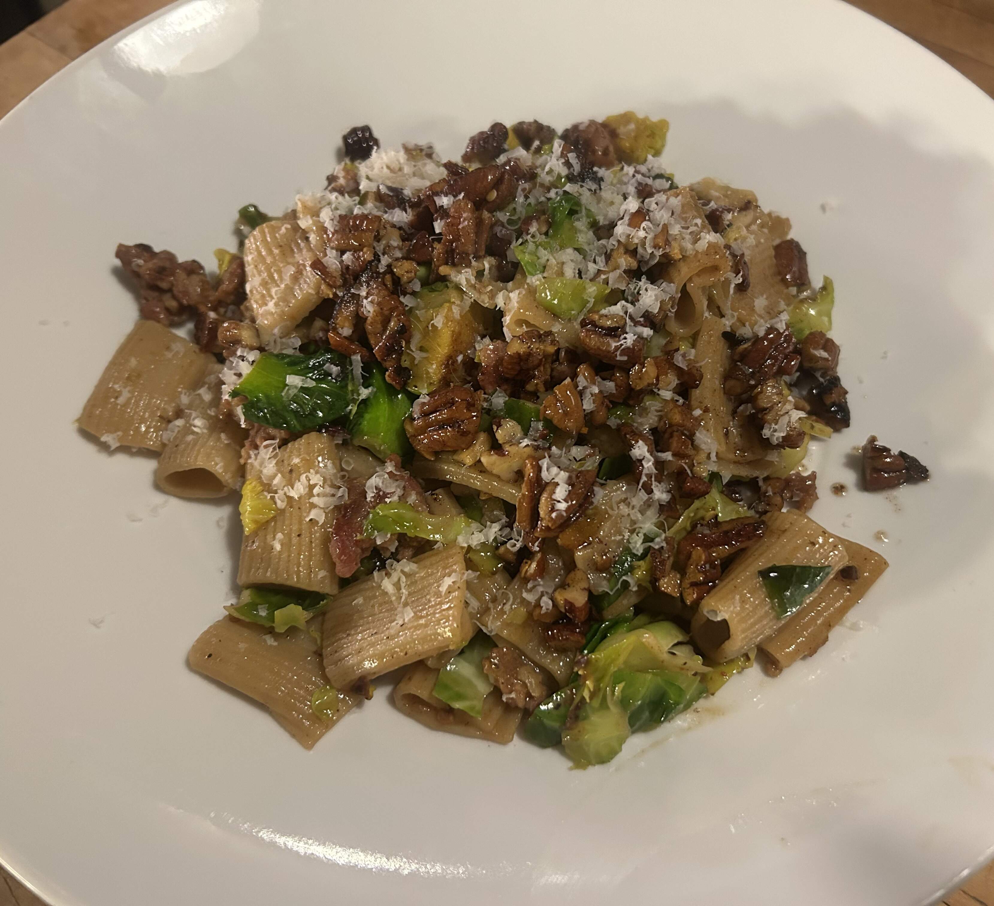 This was very rich but very good. Halved the recipe. Upped the RPFs . Would add more brussel sprouts. There was red wine.