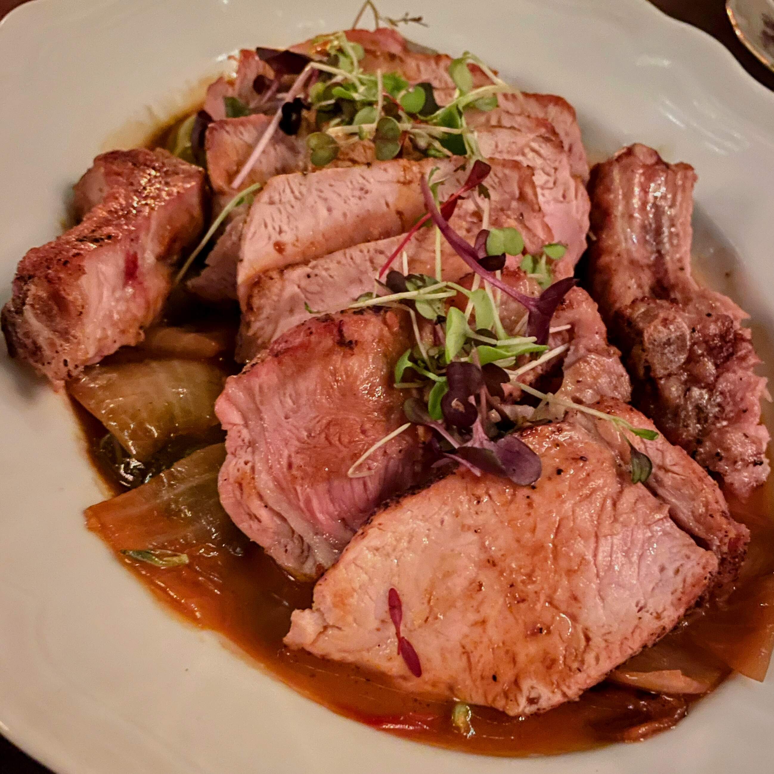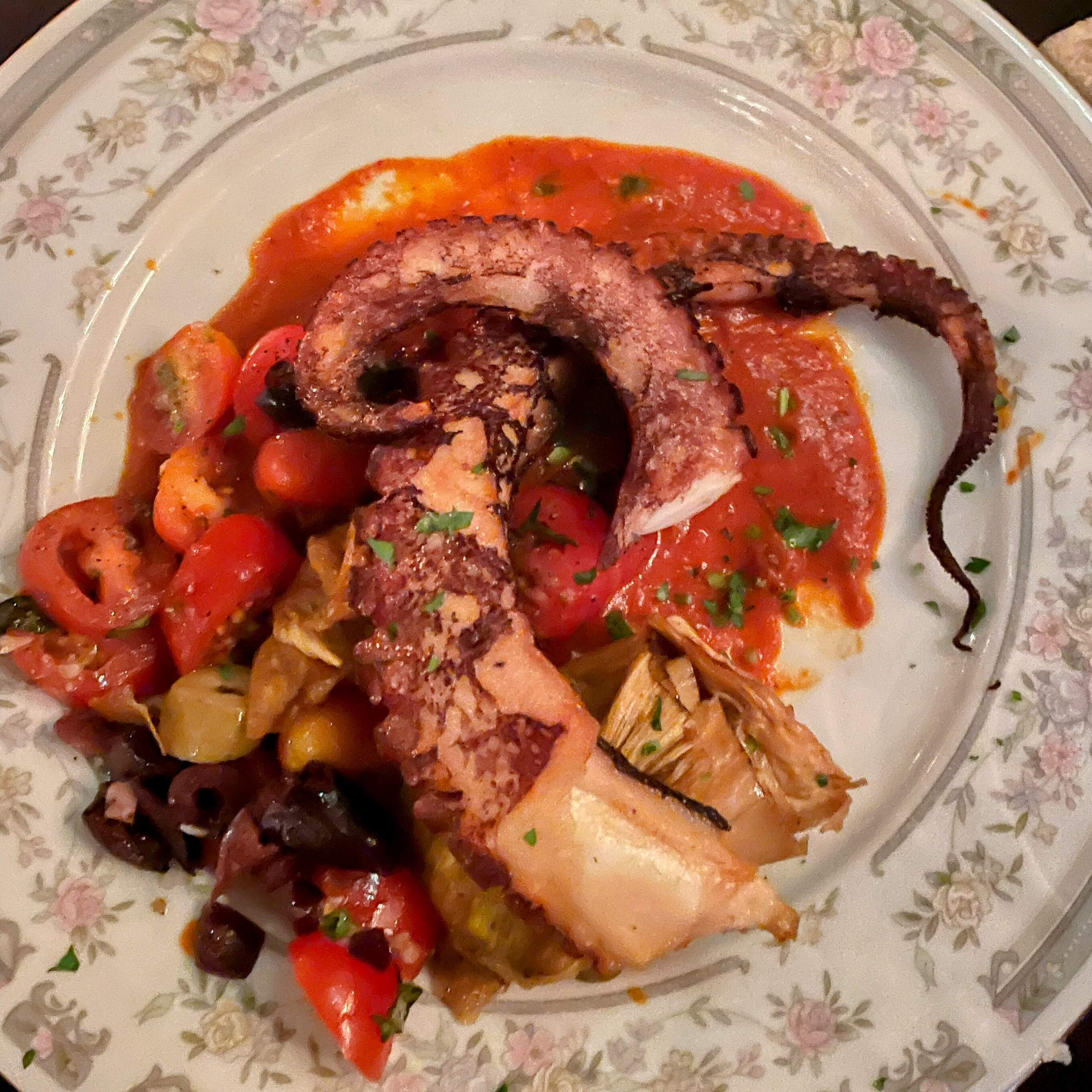 We enjoyed another excellent dinner at Falcone in Lincroft, NJ, including a juicy pork chop with hot and sweet cherry peppers, cipollini onion, aged balsamic, and fresh herbs; whole branzino; seared octopus with sicilian olives, artichokes, and capers; calamari oreganata; and meatballs with ricotta. It all went great with a couple of excellent cabernets.