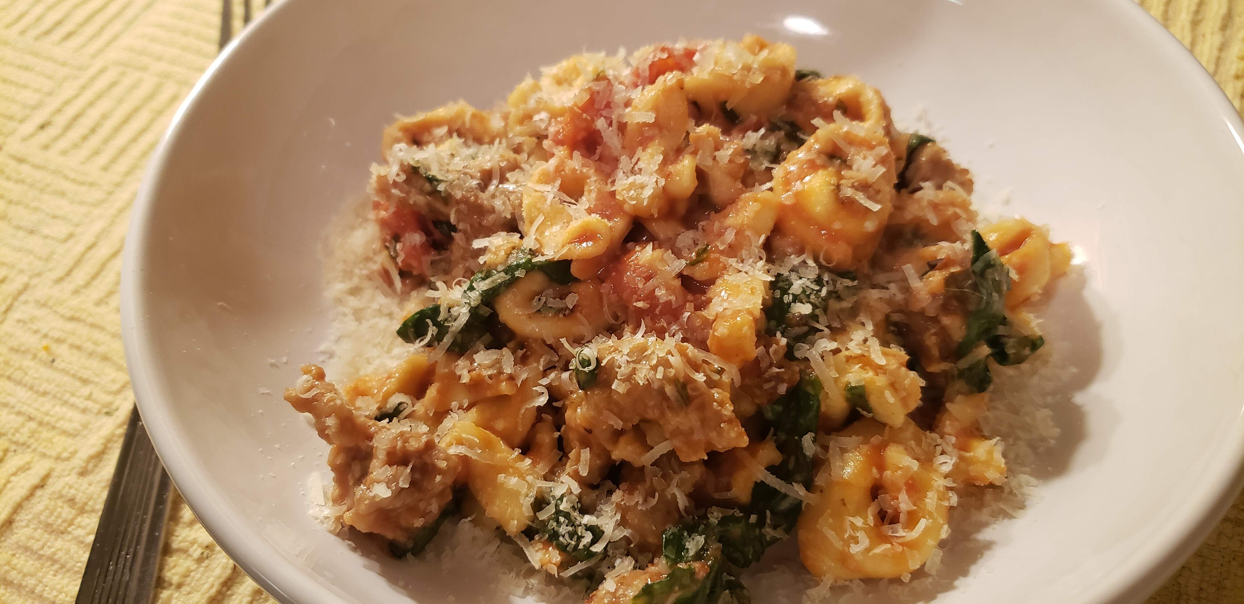 The cooked sausage was put back in, and then a small container of baby spinach was folded in with tongs to wilt along with some pasta water and then the tortellini. About 1/4 cup of heavy cream and more white wine added as I needed it.