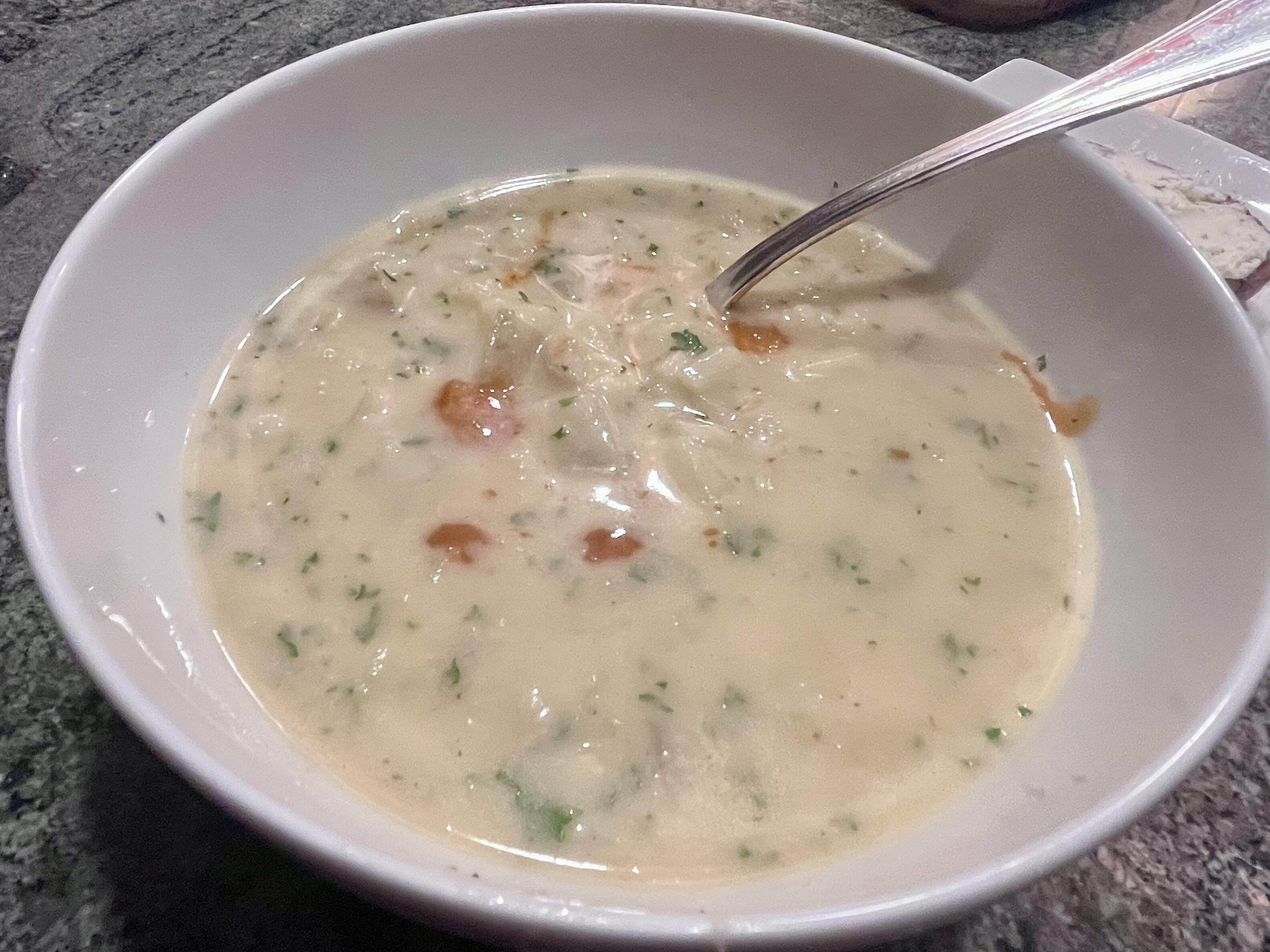 Still not in a major food mood & had no clue what to make for us tonight. Then I remembered the Maine seafood chowdah I picked up for xmas eve we still had in the fridge. I chopped some parsley to go on top, added FL hot sauce, and that was that.