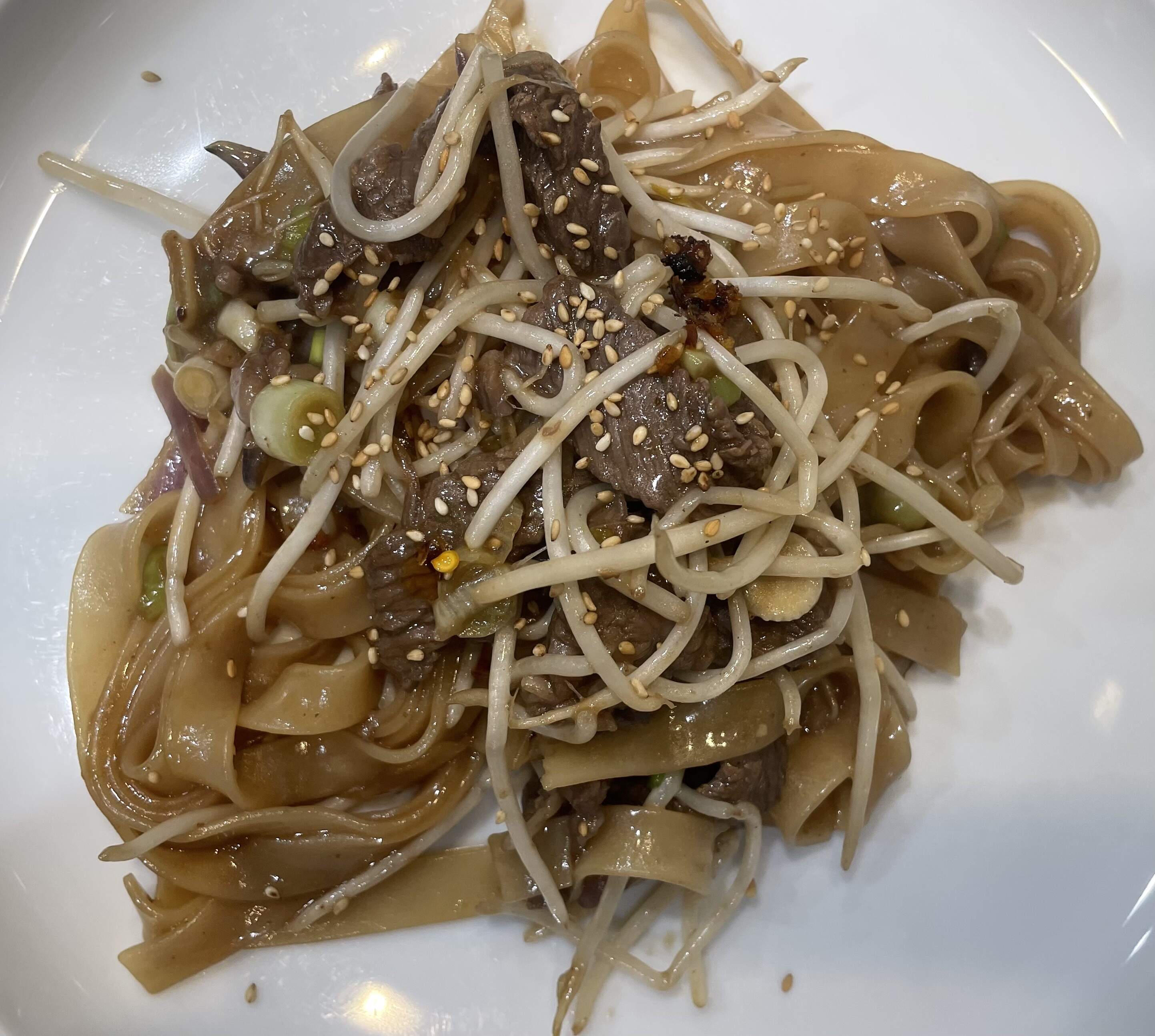 Beef Chow Fun from “That Noodle Life” - thinly sliced rib-eye steak is marinated for two hours in a mixture of light soy sauce, garlic, Shaoxing wine, toasted sesame oil and cornstarch. Afterwards, you stir-fry the meat mixture, add sliced red onions, add wide rice noodles and finish in the wok by adding a sauce made from light and dark sou sauce, Shaoxing wine, sugar and water. Finished with green onions and plenty of mung beans sprouts and served with toasted sesame seeds and chili crunch and oil