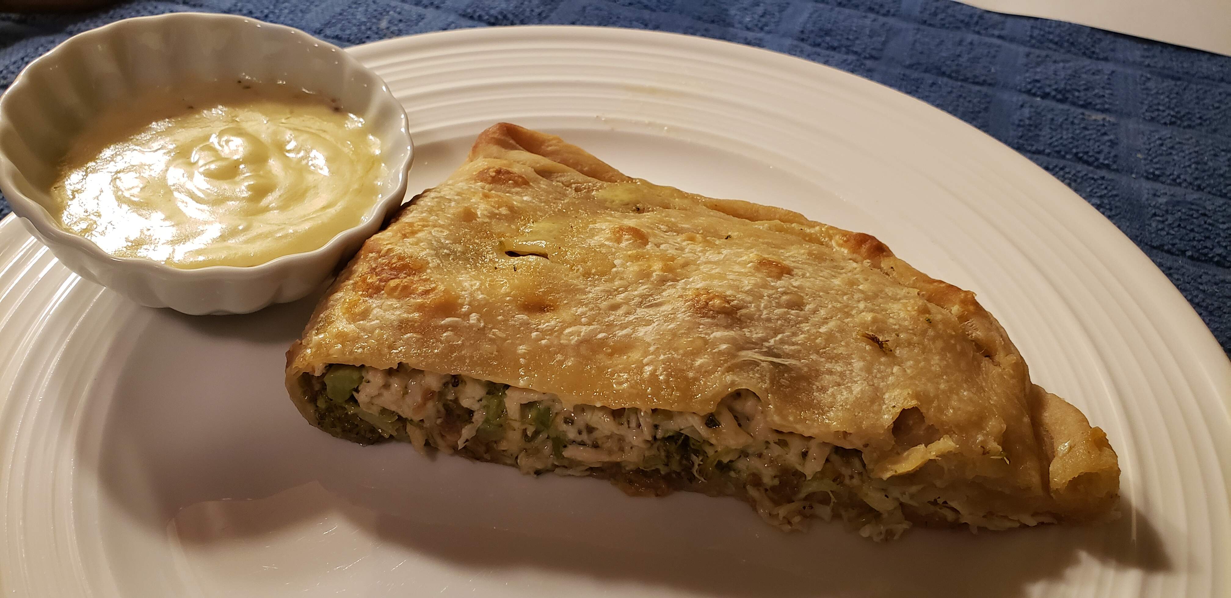Was going to do a chicken-broccoli pizza, but pivoted to a chicken-broccoli-caramelized onion calzone with Alfredo sauce. Shredded some of the roast chicken from the weekend (freezing the rest), roasted some broccoli florets and chopped them up. The homemade Alfredo sauce I found could have used some oomph, but not bad.