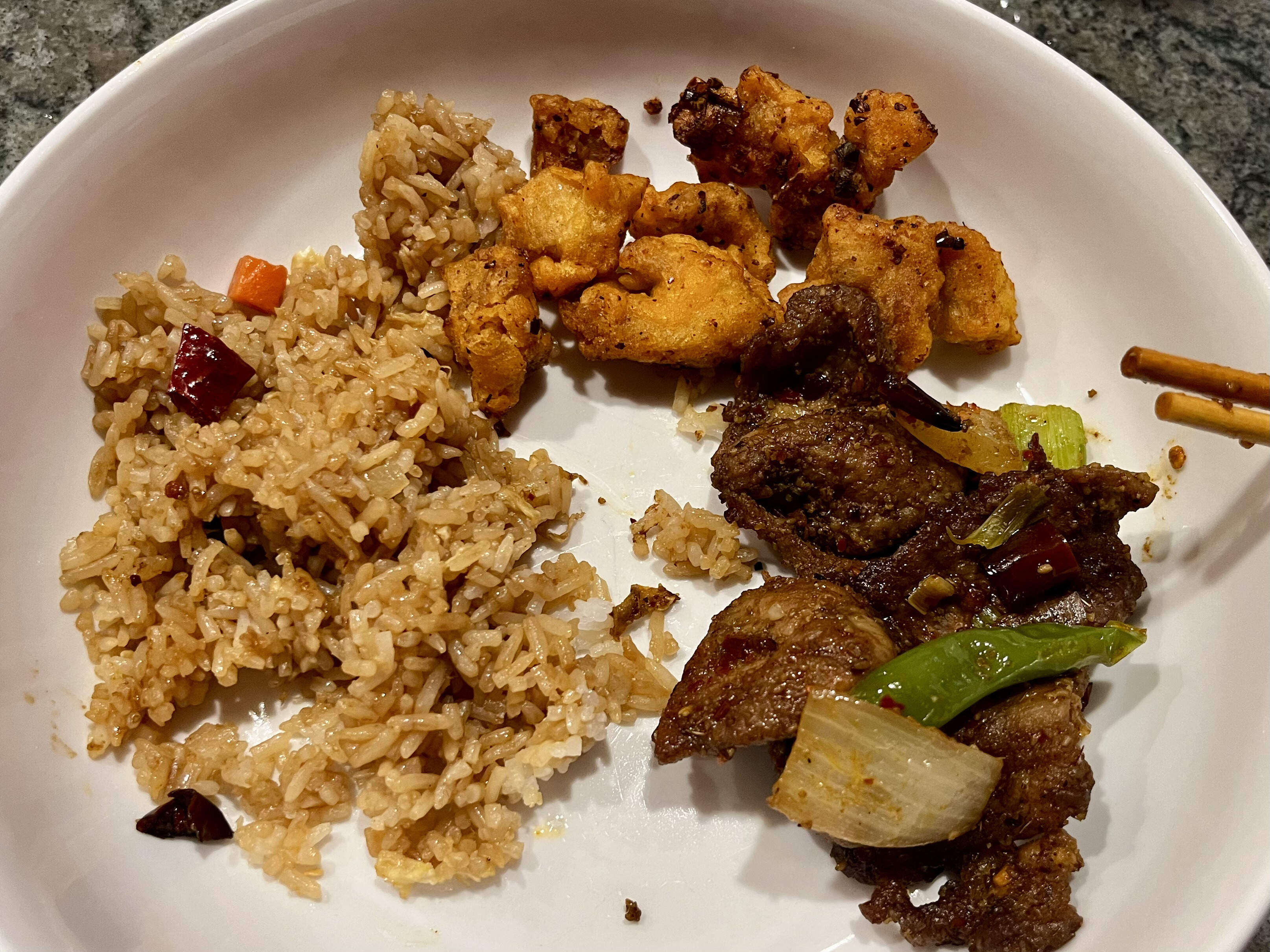 super-cuminy cumin lamb, and the “house” spicy chicken aka Chongqing chicken