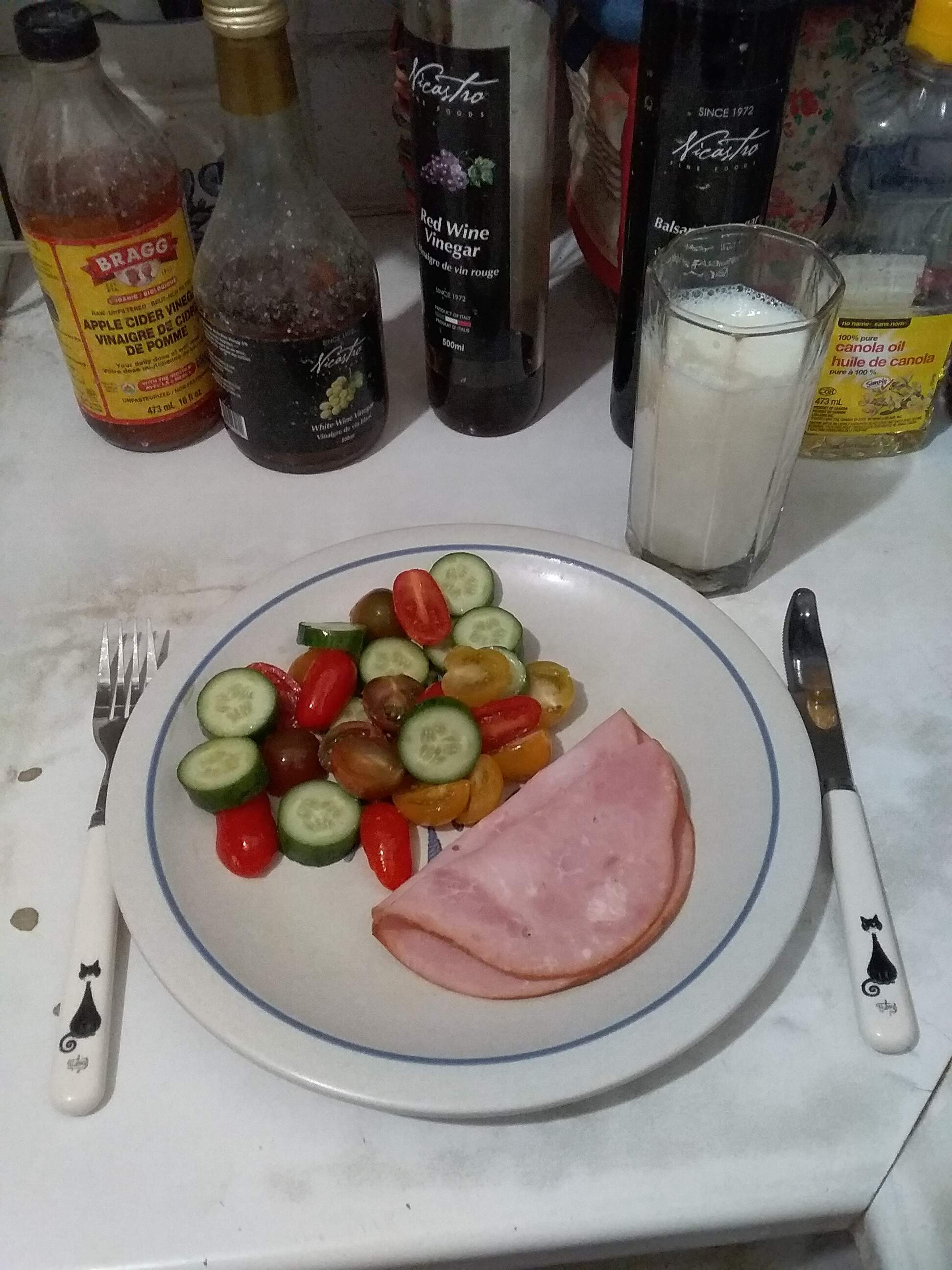 Baked BLSL chicken breast and romaine salad with grape tomatoes, cucumber and garlic stuffed green olives. I never buy BLSL breasts, but they were on sale so I couldn’t resist. I’ll probable go back tomorrow and grab a few more packs.