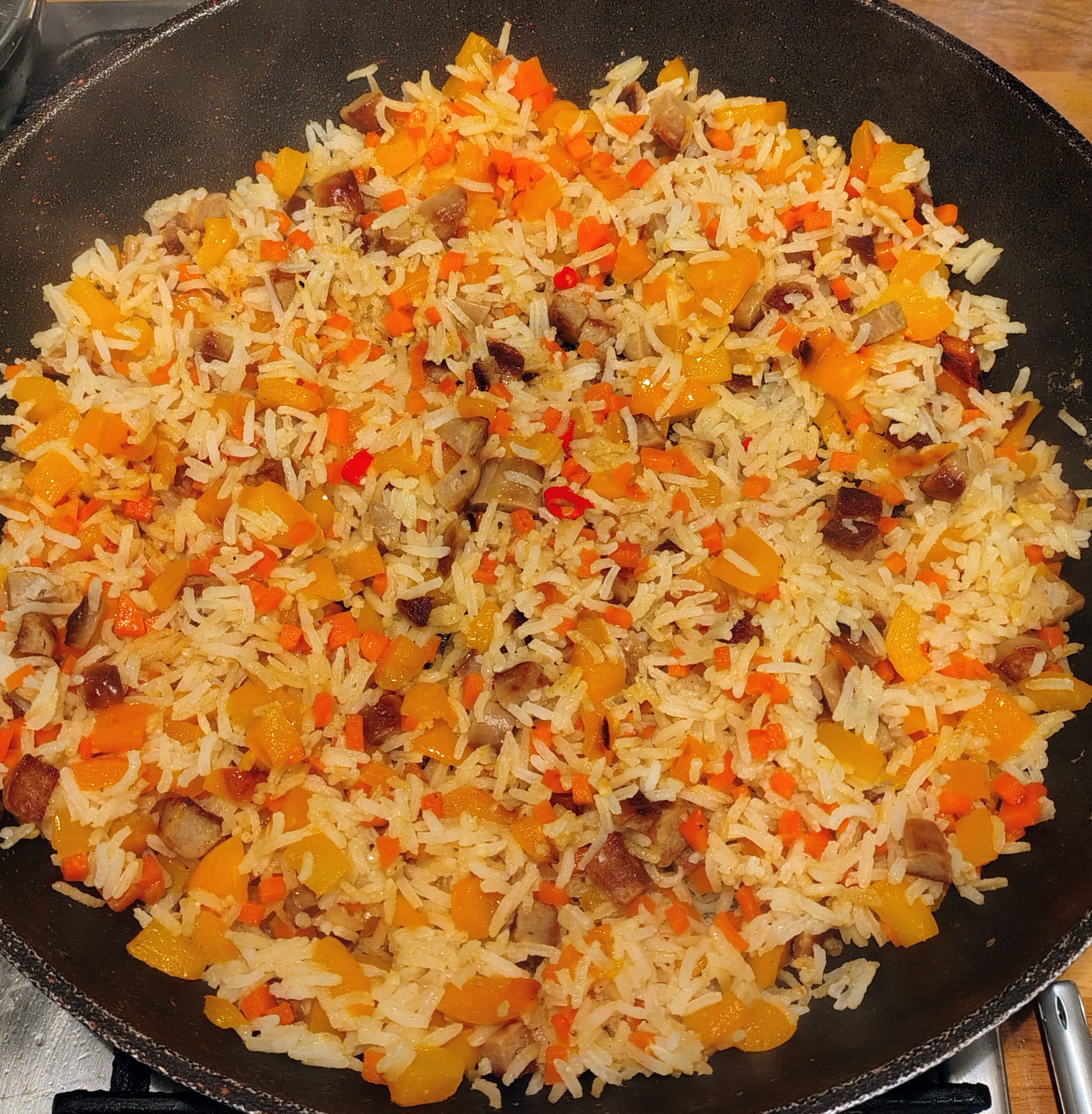 Fried rice with things that needed to be used up in my fridge: a carrot, a yellow pepper, a red chilli, some leftover sausage. The colours are pleasingly autumnal. ![]()
