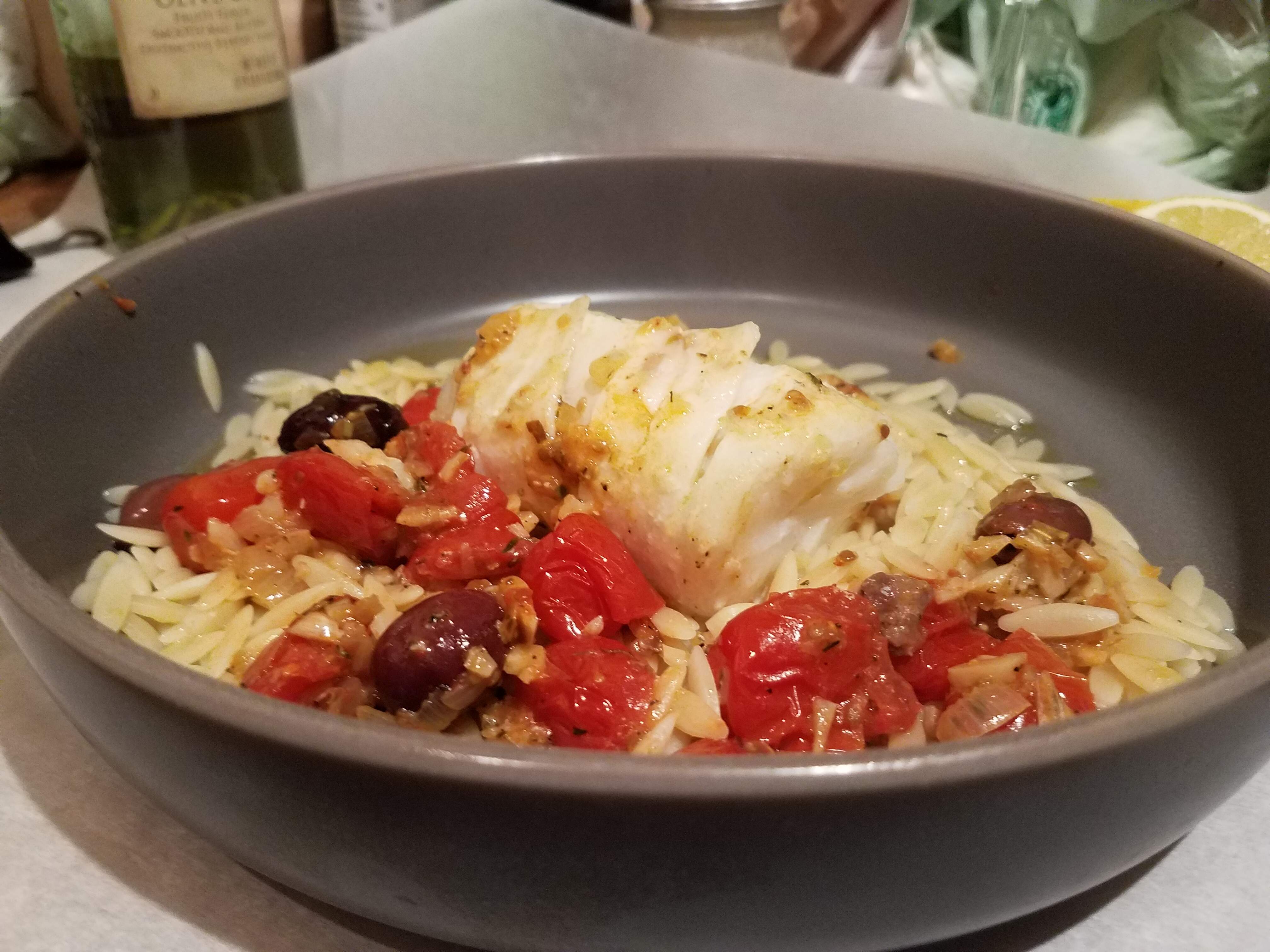 Cod alla livornese-ish. I sous-vided the cod at 120F, so it was flaky and soft, then added it to the sauteed cherry tomatoes and olives. I might use more tomato next time. With orzo.