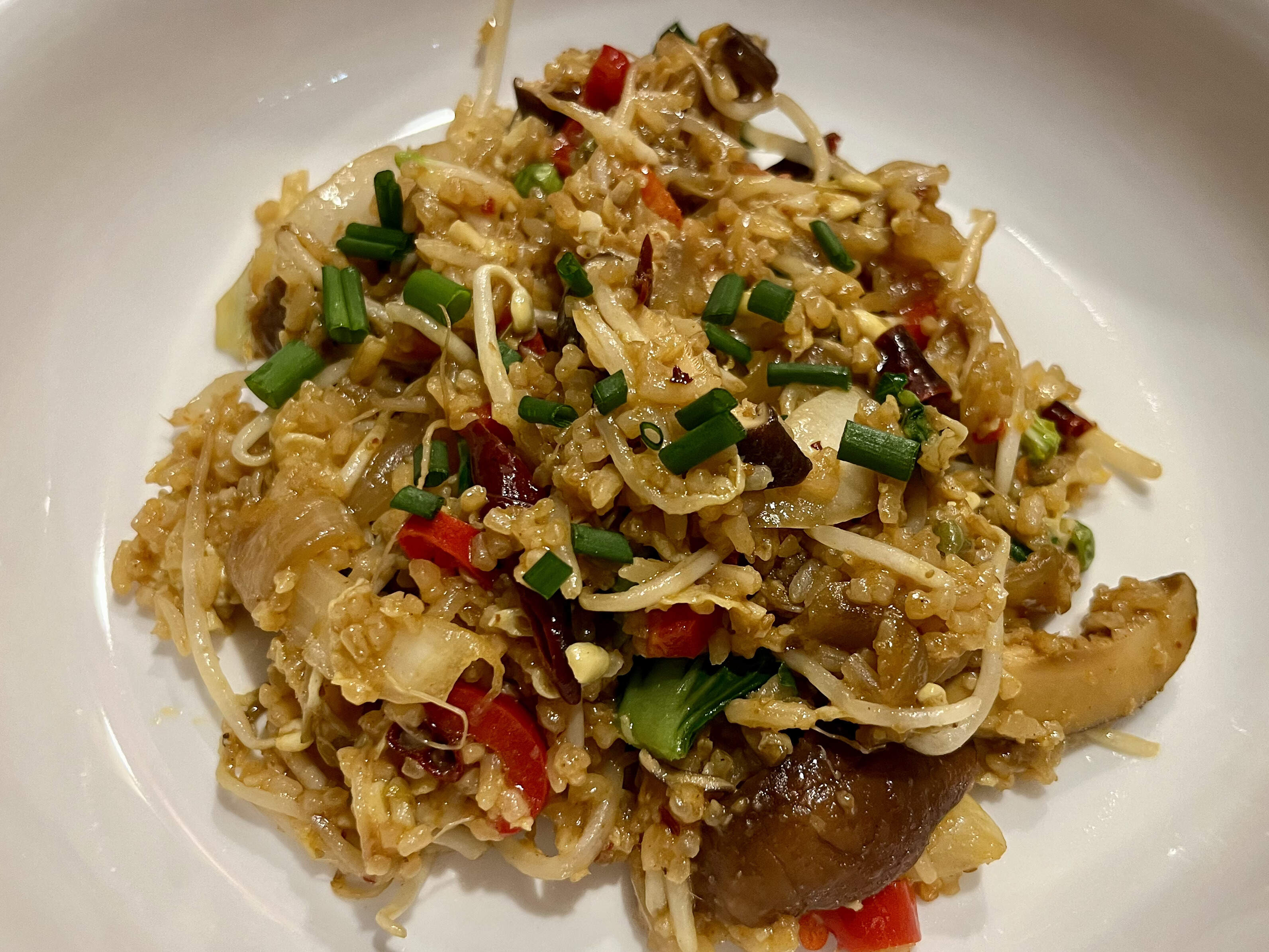 Dinner was egg-fried rice with 3 eggs, the fried rice & cumin lamb leftover from our Sichuan order Friday, bok choy, red peppers, mung bean sprouts, reconstituted shiitakes, plus of course TPSTOFGAGABP, the latter for the heat which was decidedly buh-rought.