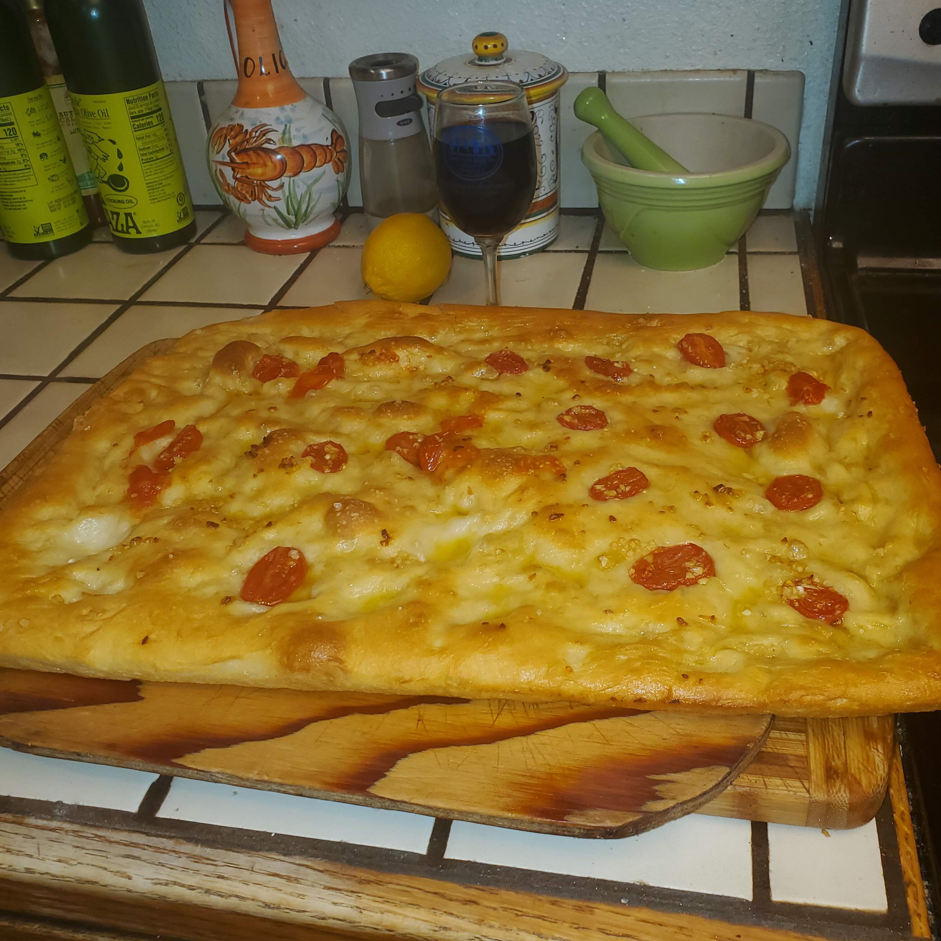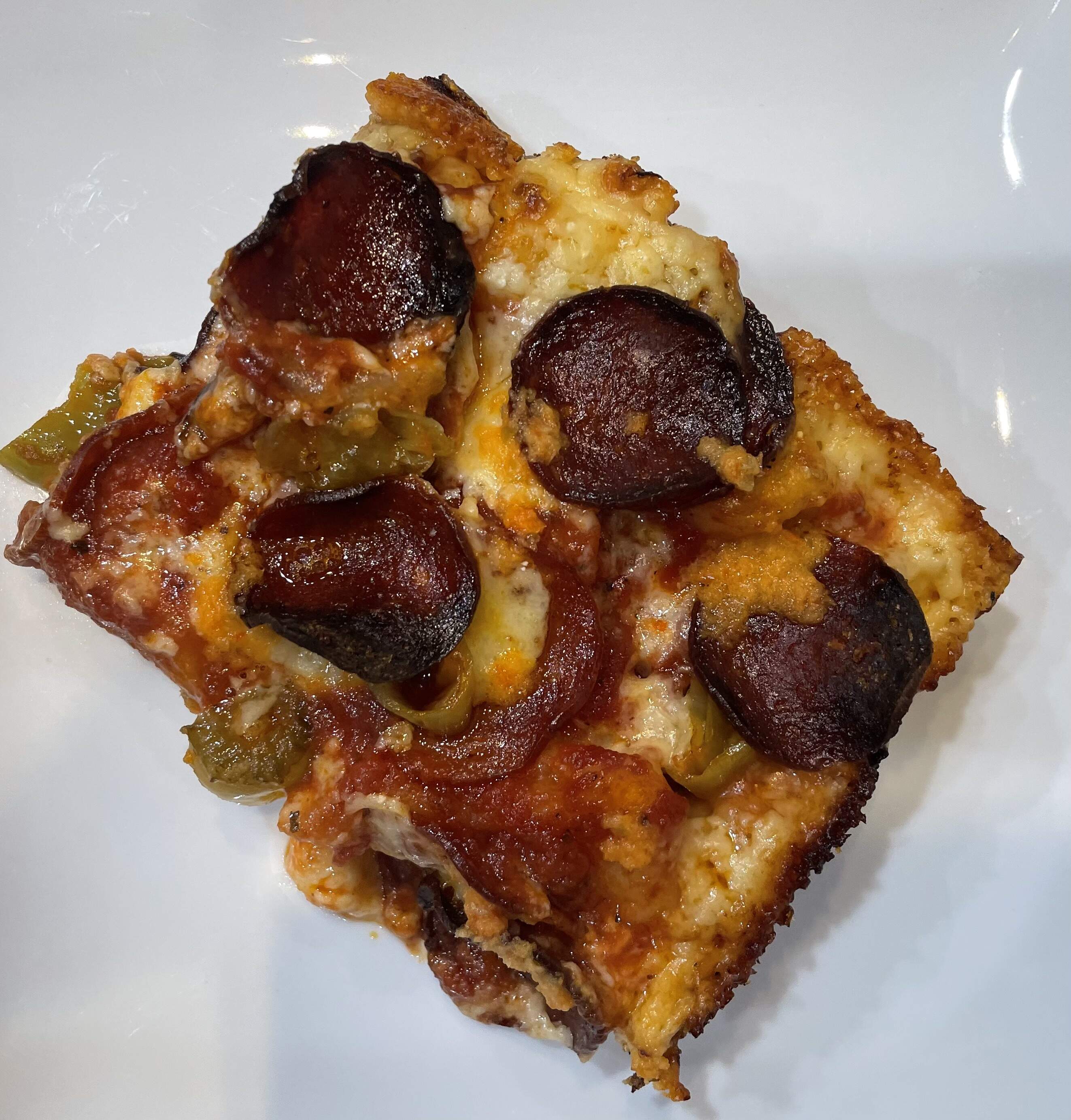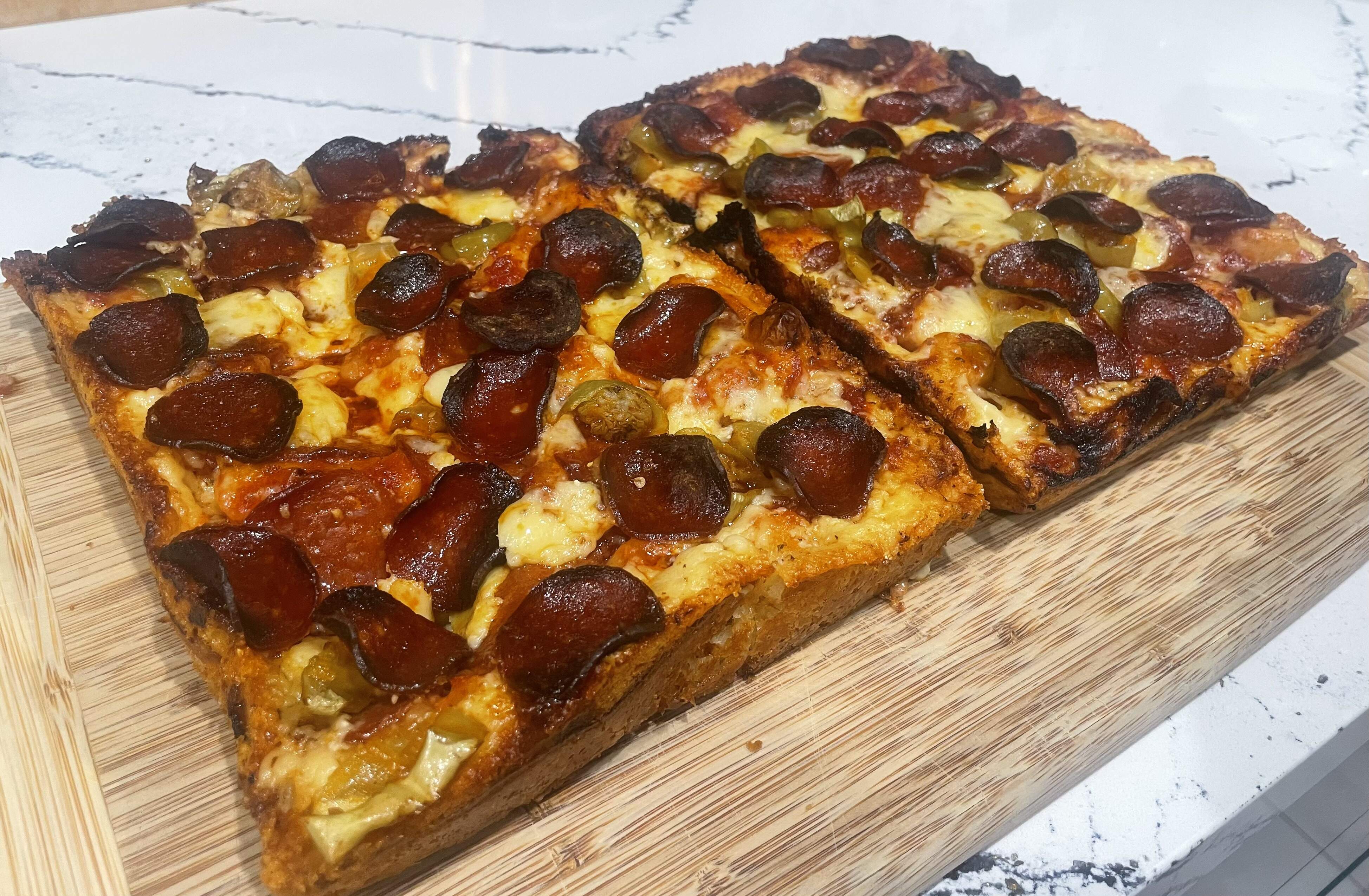 Detroit-Style Pepperoni Deluxe from Peter Reinhart’s “Perfect Pan Pizza” - white flour dough (bread flour, instant yeast, salt, water, olive oil) refrigerated for 18 hours. Then put into the pans with his “panning and dimpling” method over an hour, added first half of cheese to dough and second raise for four hours. Pizza is topped with crushed tomato sauce (flavored with oregano, basil,garlic and red wine vinegar), pepperoni slices, more cheddar cheese, pickled pepperoncini and a last layer of pepperoni slices. After baking, finished with a little bit of his secret sauce (pureed red bell pepper, pickled pepperoncini (and some of the brine), garlic, red wine vinegar and olive oil)