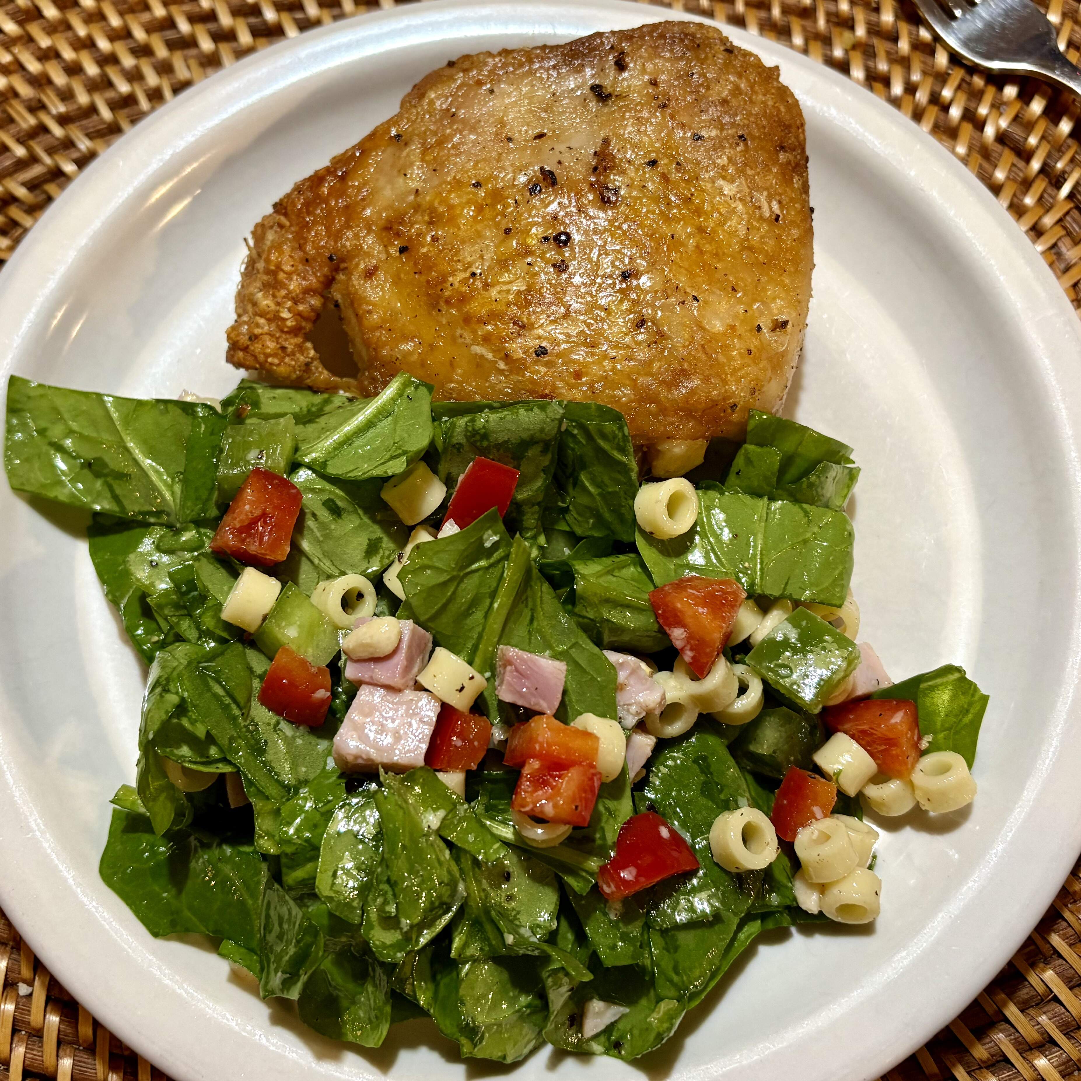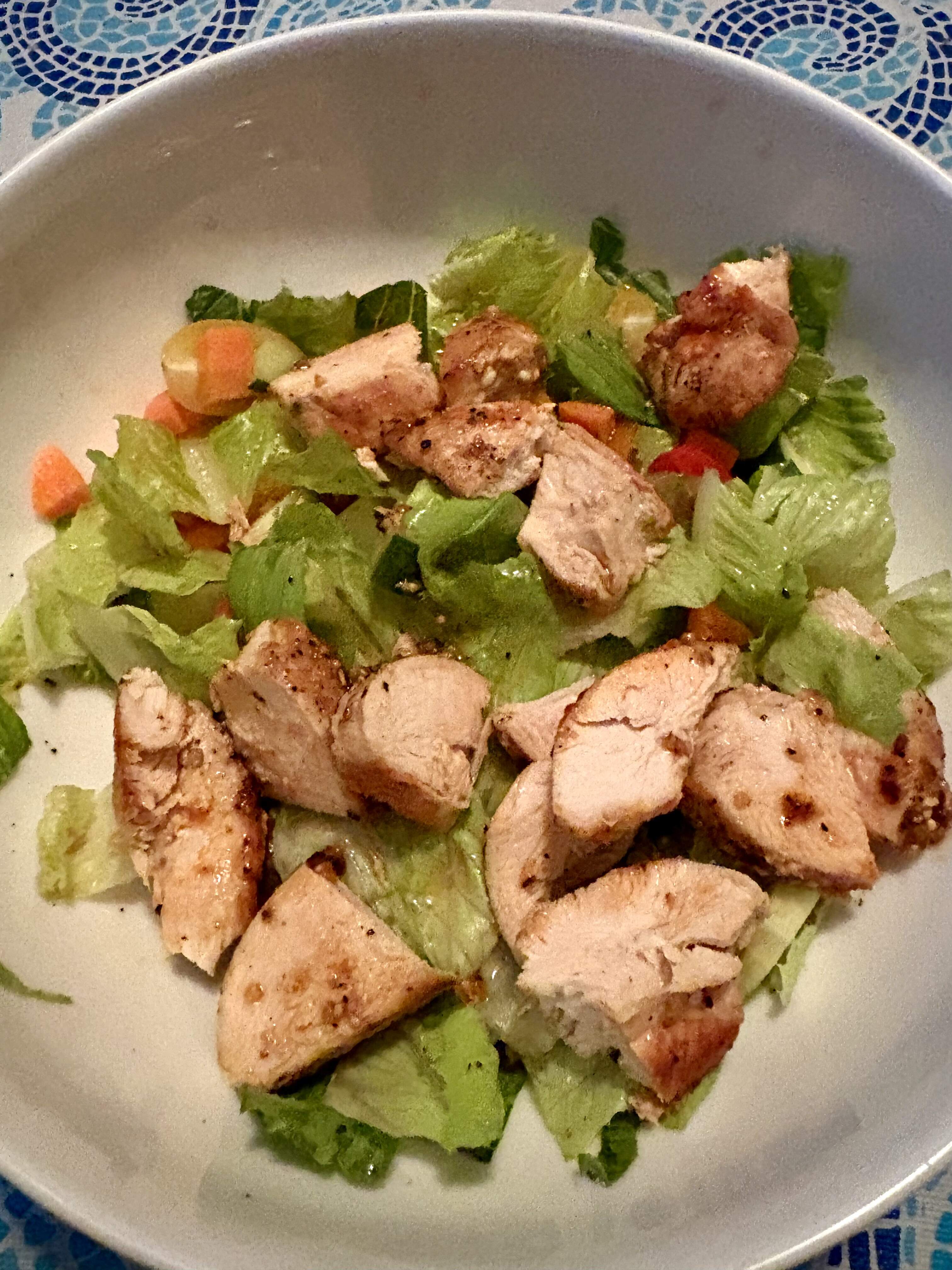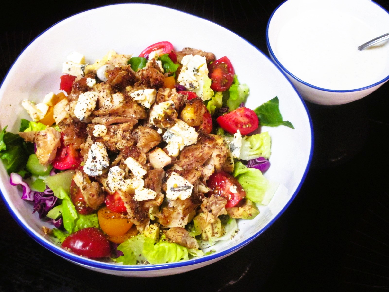 Chicken salad. Seared and roasted chicken thigh over a bed of little gem, green onion, celery, tomatoes, avocado and cambozola. Ranch.