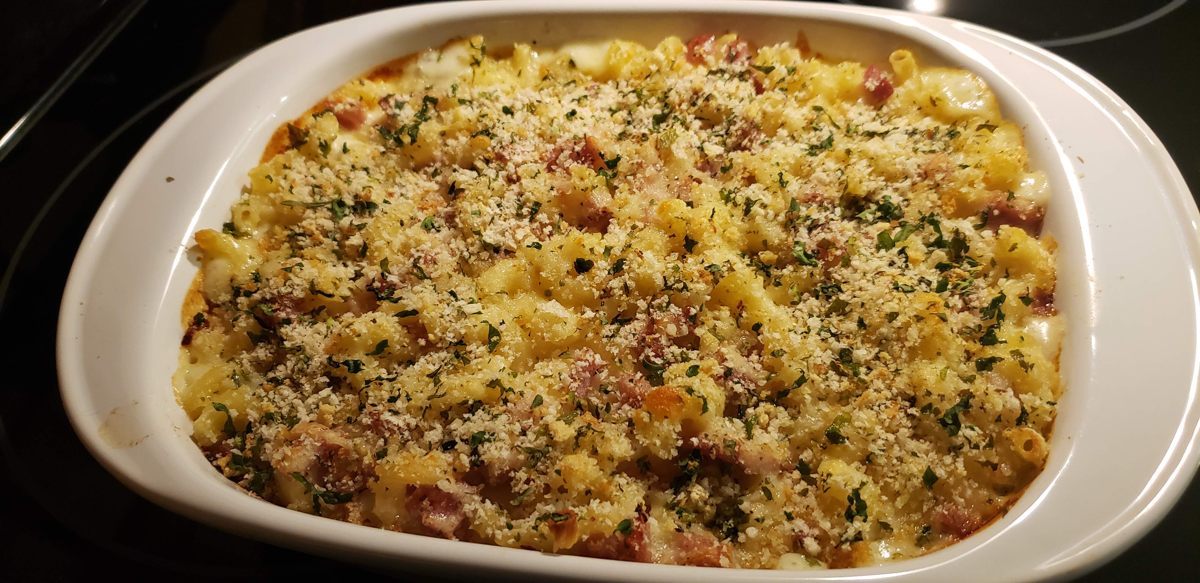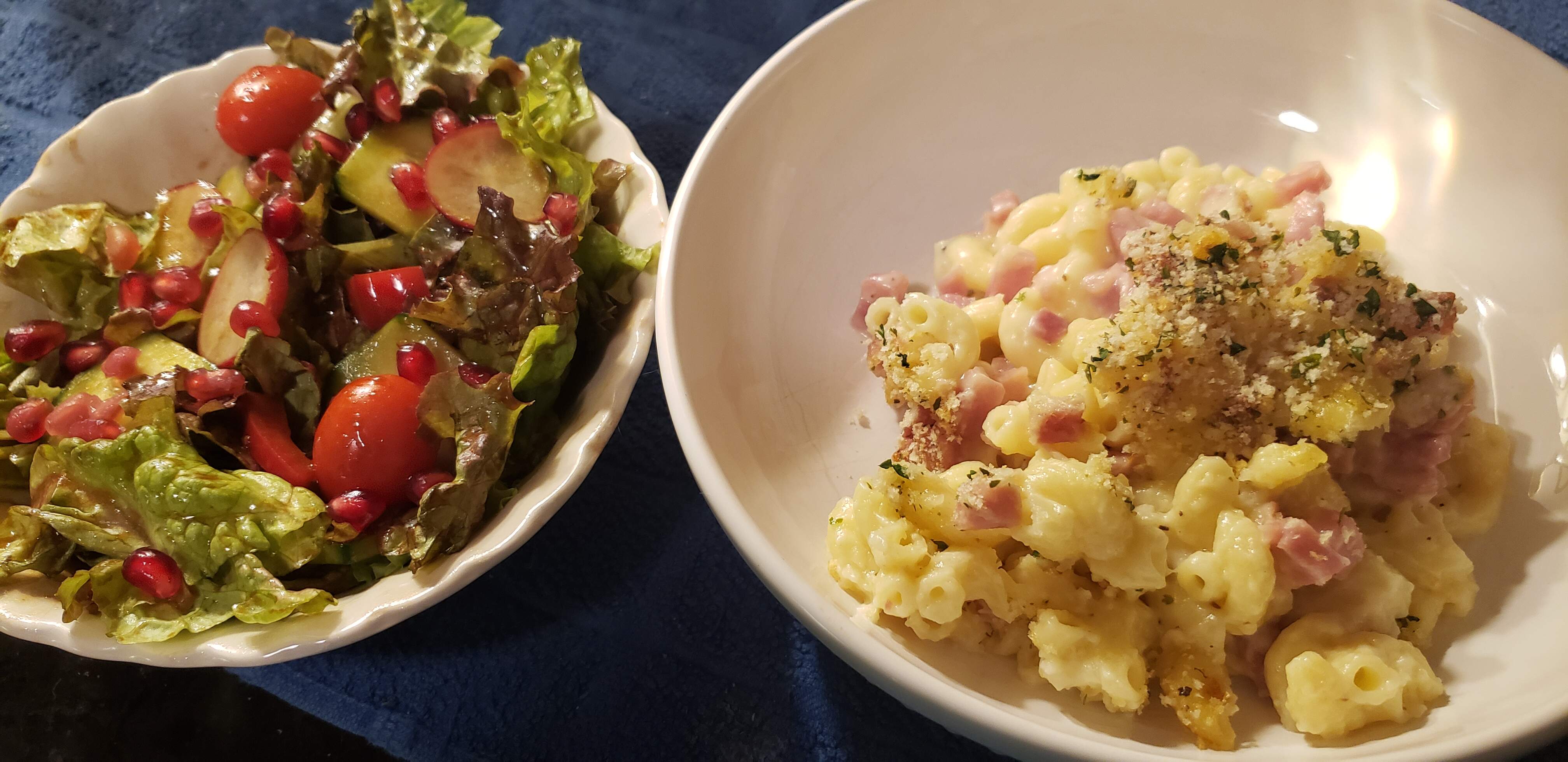 So I grated the rest of the Tillamook cheddar in my fridge along with some Cabot Seriously Sharp cheddar, the rest of some previously purchased Havarti, and some of the new Monterey Jack for a cheese sauce for baked Mac and Ham and Cheese (diced ham pulled from the freezer).