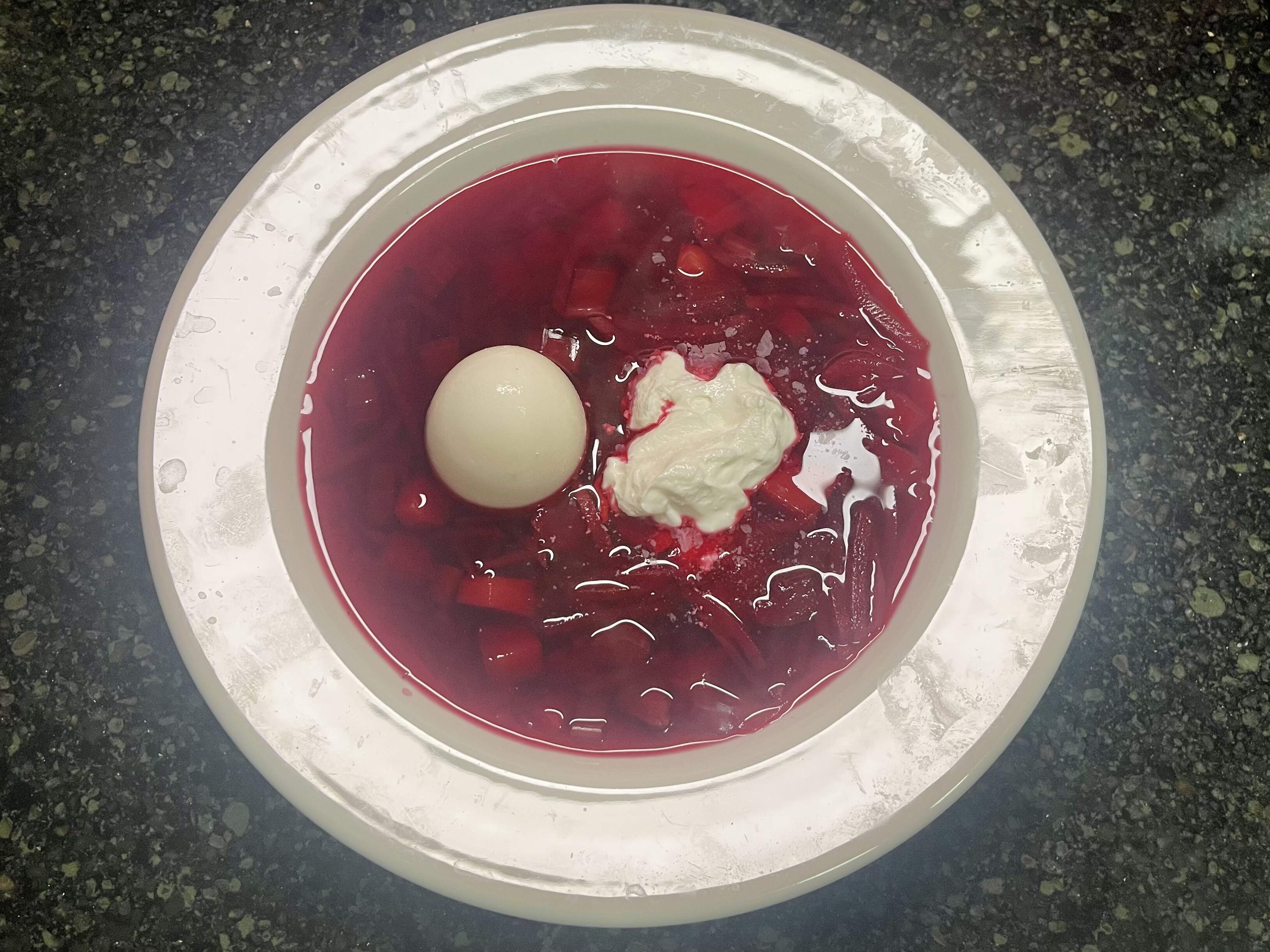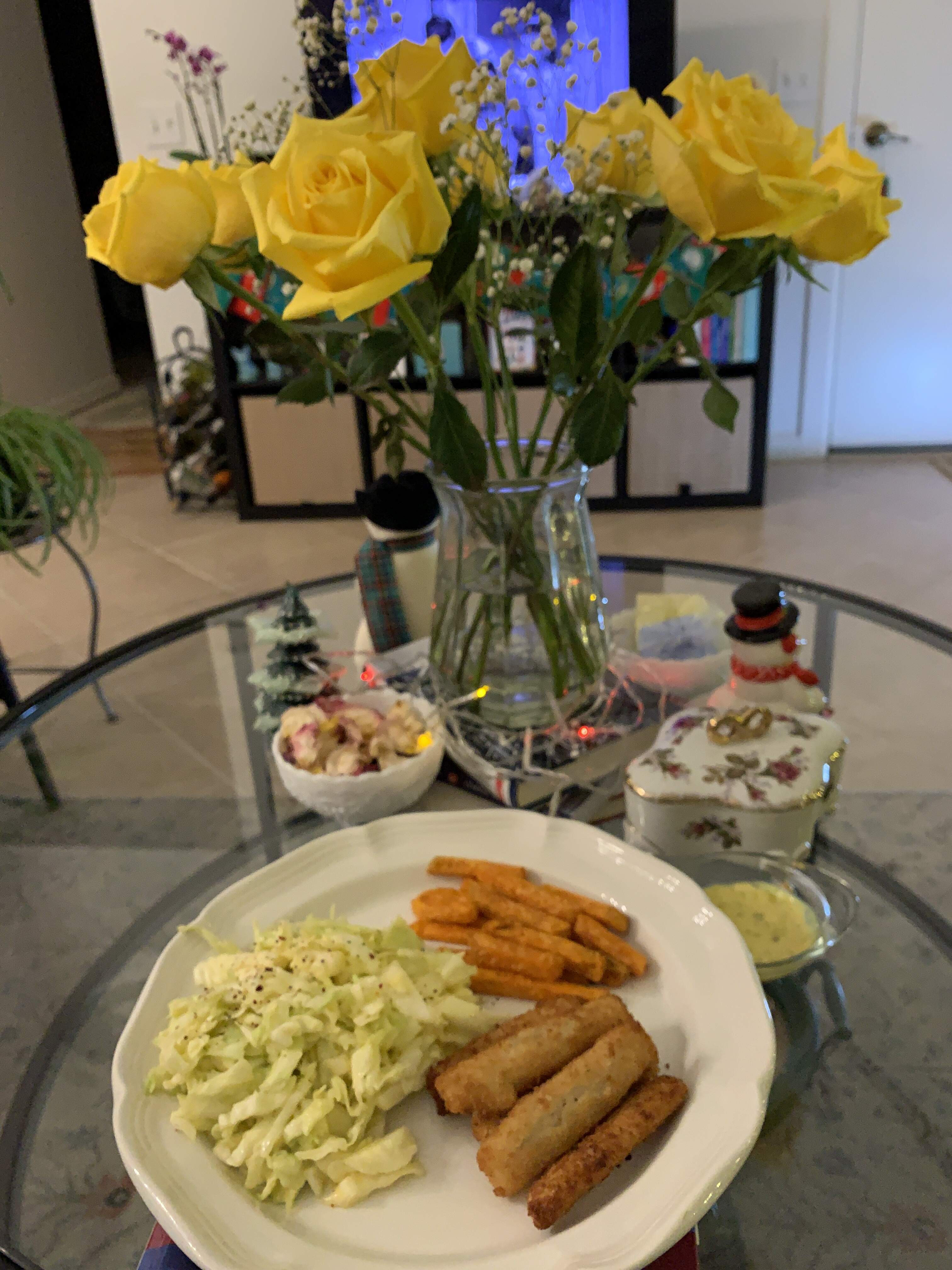 A salad of red leaf lettuce, sliced radish, cuke, and red bell pepper with some Cherub tomatoes with a dressing of fig balsamic vinegar, olive oil, white wine, Dijon mustard, garlic paste and a pinch of s/p. Sprinkled with some pom arils. Decided to forgo the goat cheese for the salad because…well, ummm… ![]()