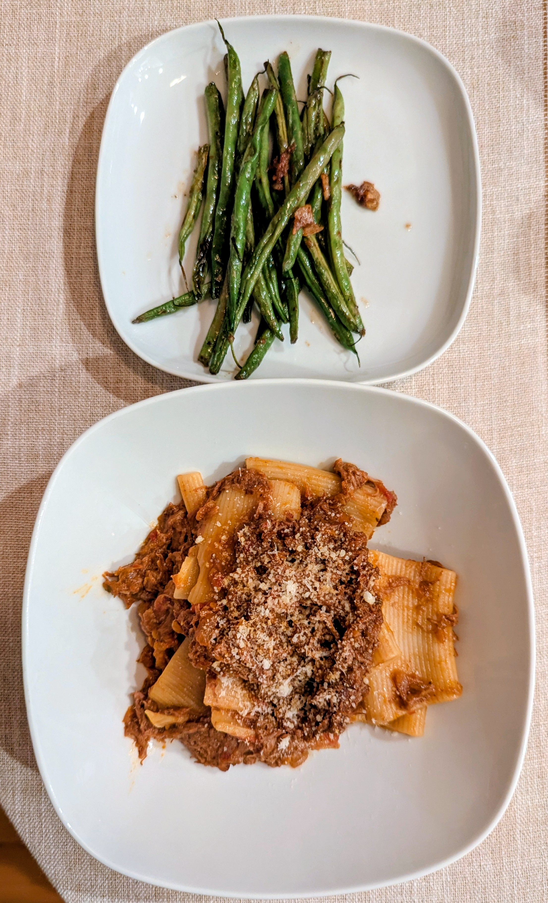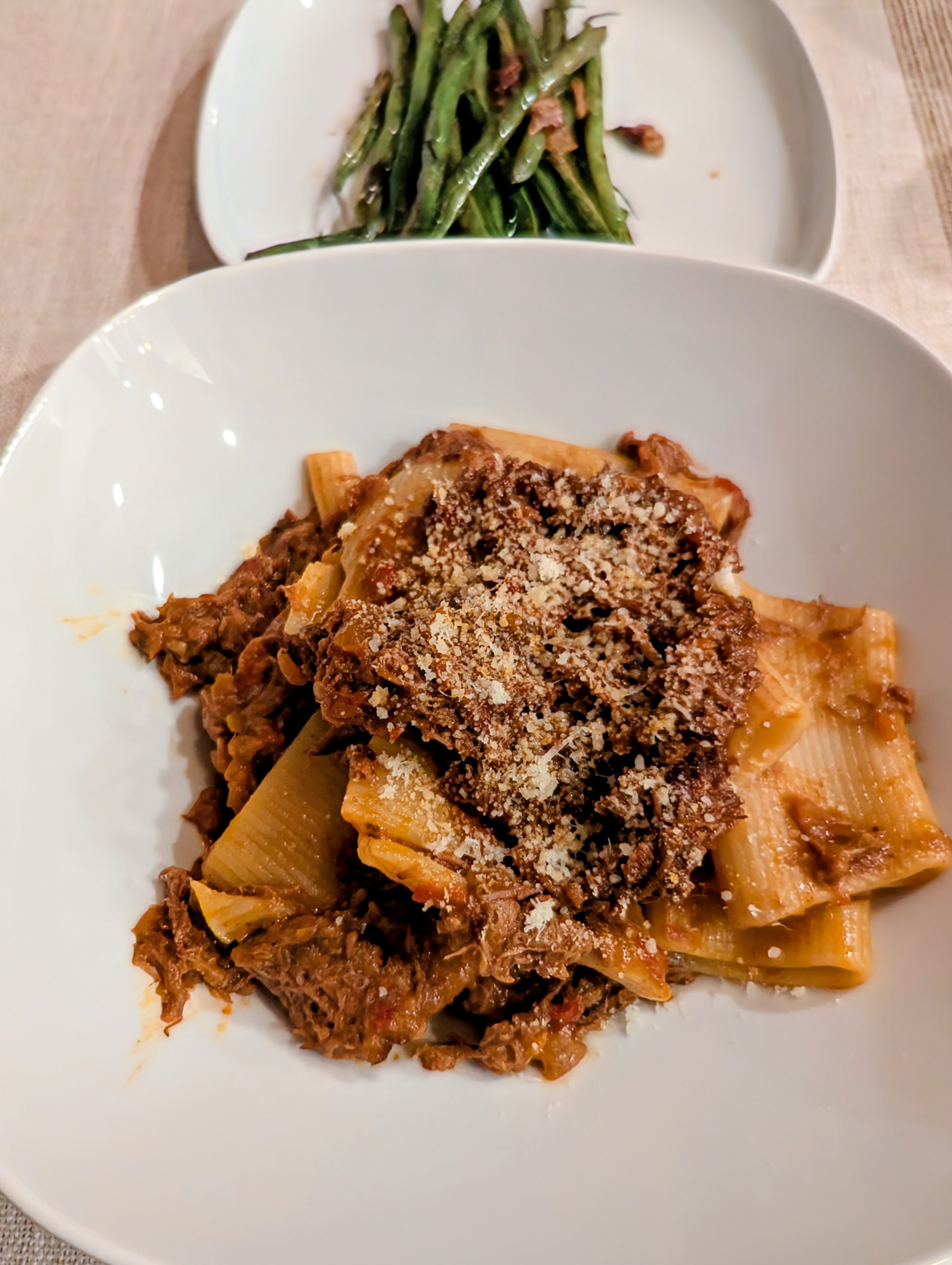 Two days ago I made RecipeTin Eats’ Slow Cooked Shredded Beef Ragu and last night my DH heated it up and served over paccheri with some garlic-butter haricots on the side. Yum!