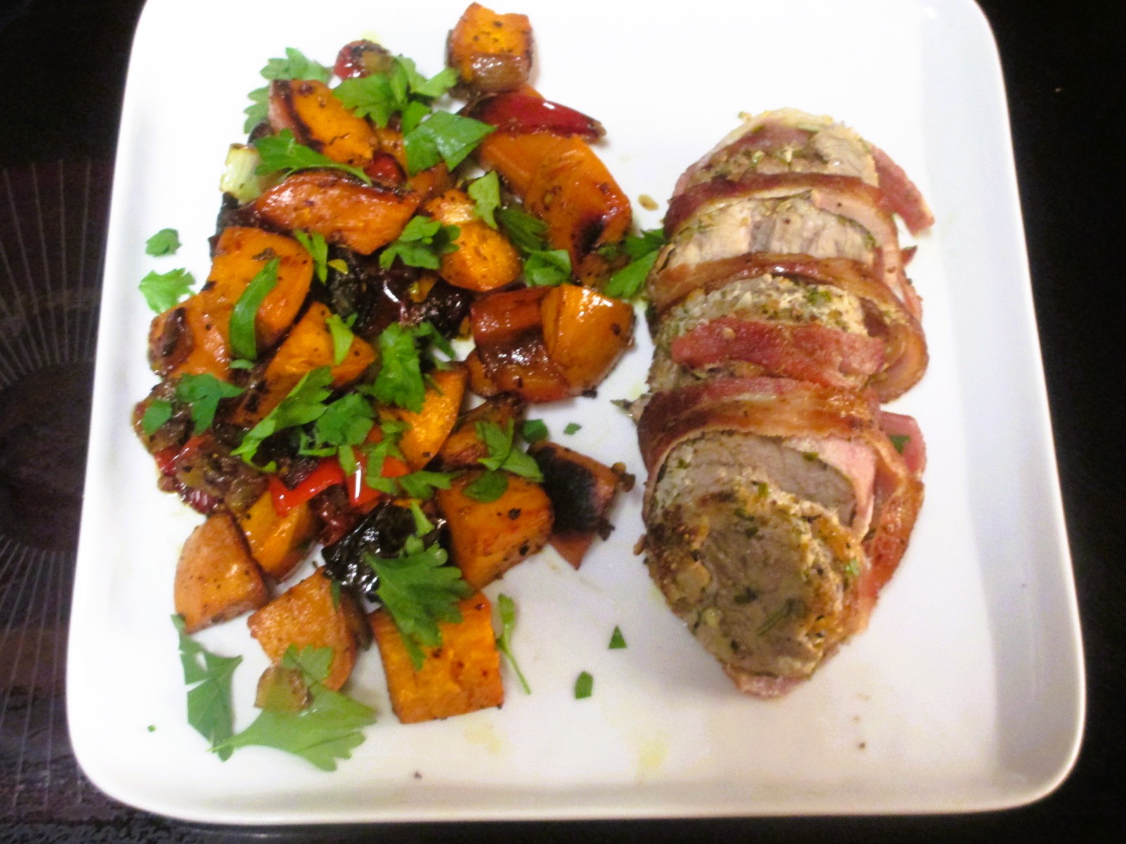 Pork tenderloin, rolled in rosemary, fennel seed, garlic, s&p and bacon. Seared and roasted with Garnet sweet potato, onion and red bells. Savoy & red cabbage, carrot, green onion slaw, creamy curry dressing. Cocktail was a maple Manhattan.