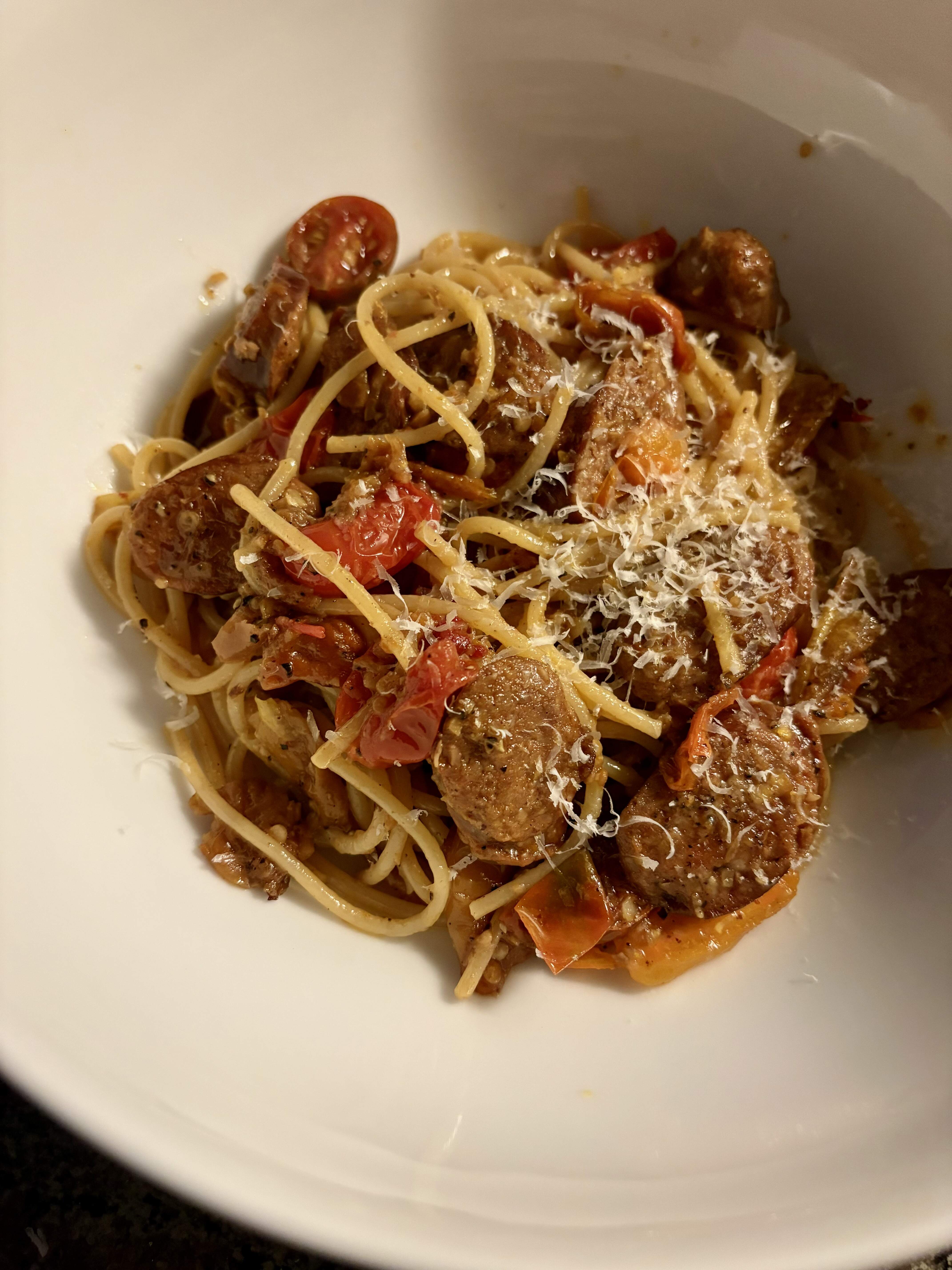 Spaghetti and hot Italian sausage, grape tomatoes, roasted peppers and a shyte ton of garlic. Loads of Parm/Regg of course.
