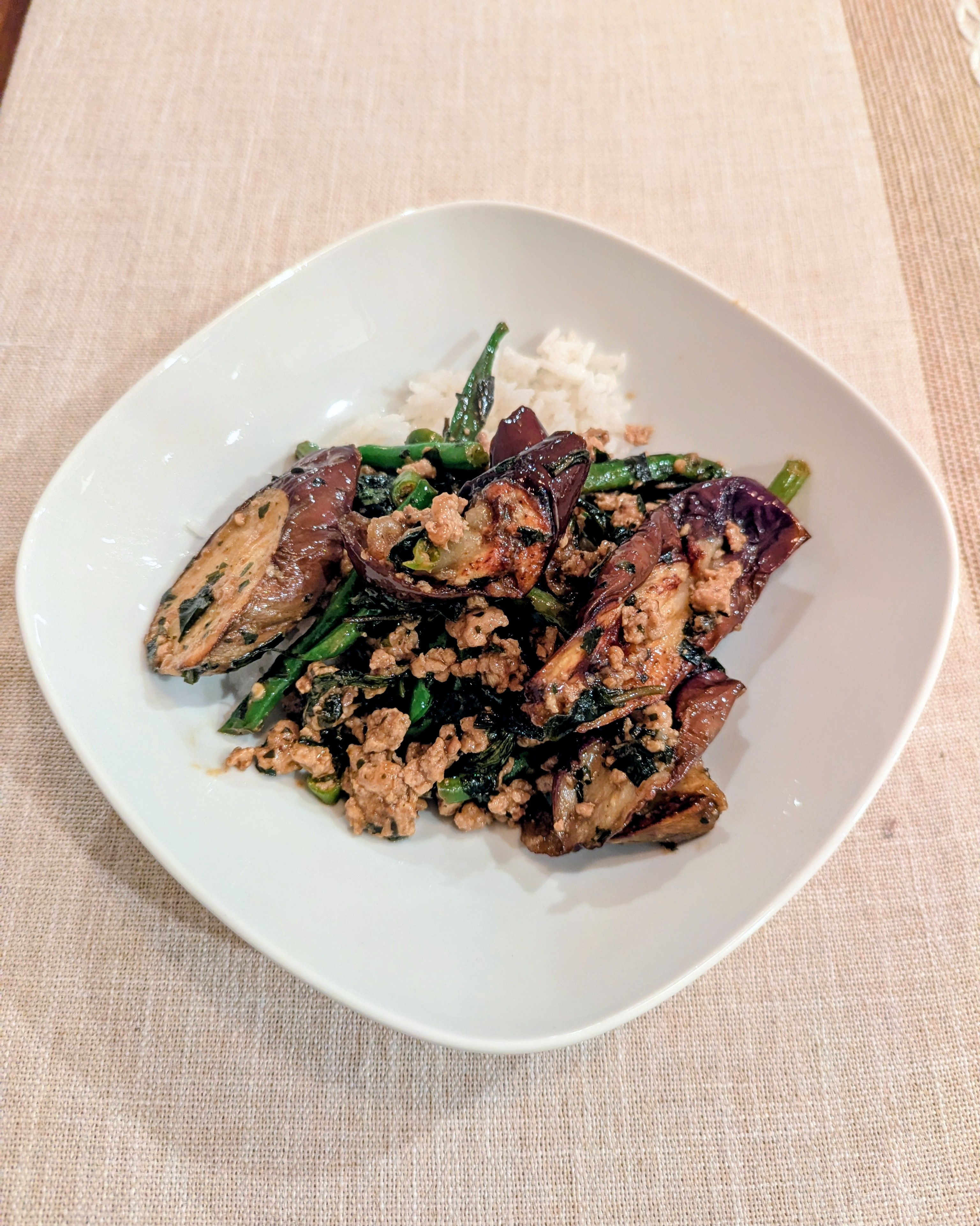 Tonight we made Makheua Yao Pad Tao Jiao (Stir-Fried Eggplant With Minced Pork) adding haricots and serving over jasmine rice. Really good. I subbed white miso and a little doenjang for the Thai soybean paste. I steamed and oven “fried” the eggplant.