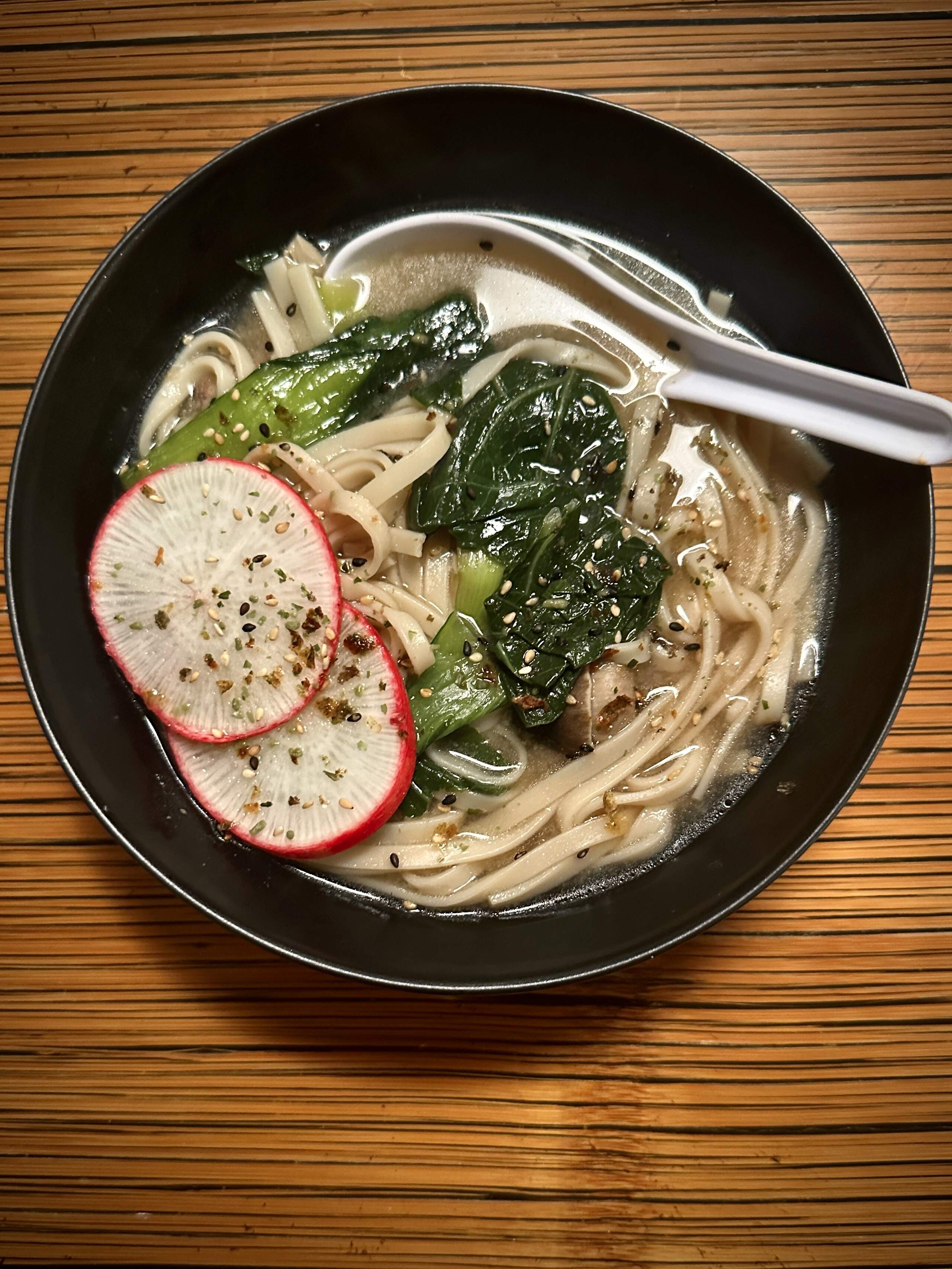 Since today was the first really cold day of the 25-26 winter season, I was in the mood for something warm and comforting. Since I had most of the ingredients on hand I made Nabeyaki Udon, with striped bass from the freezer, bok choy and a giant radish from my last CSA delivery, a can of straw mushrooms that was sitting in the pantry, and wasabi furikake.
