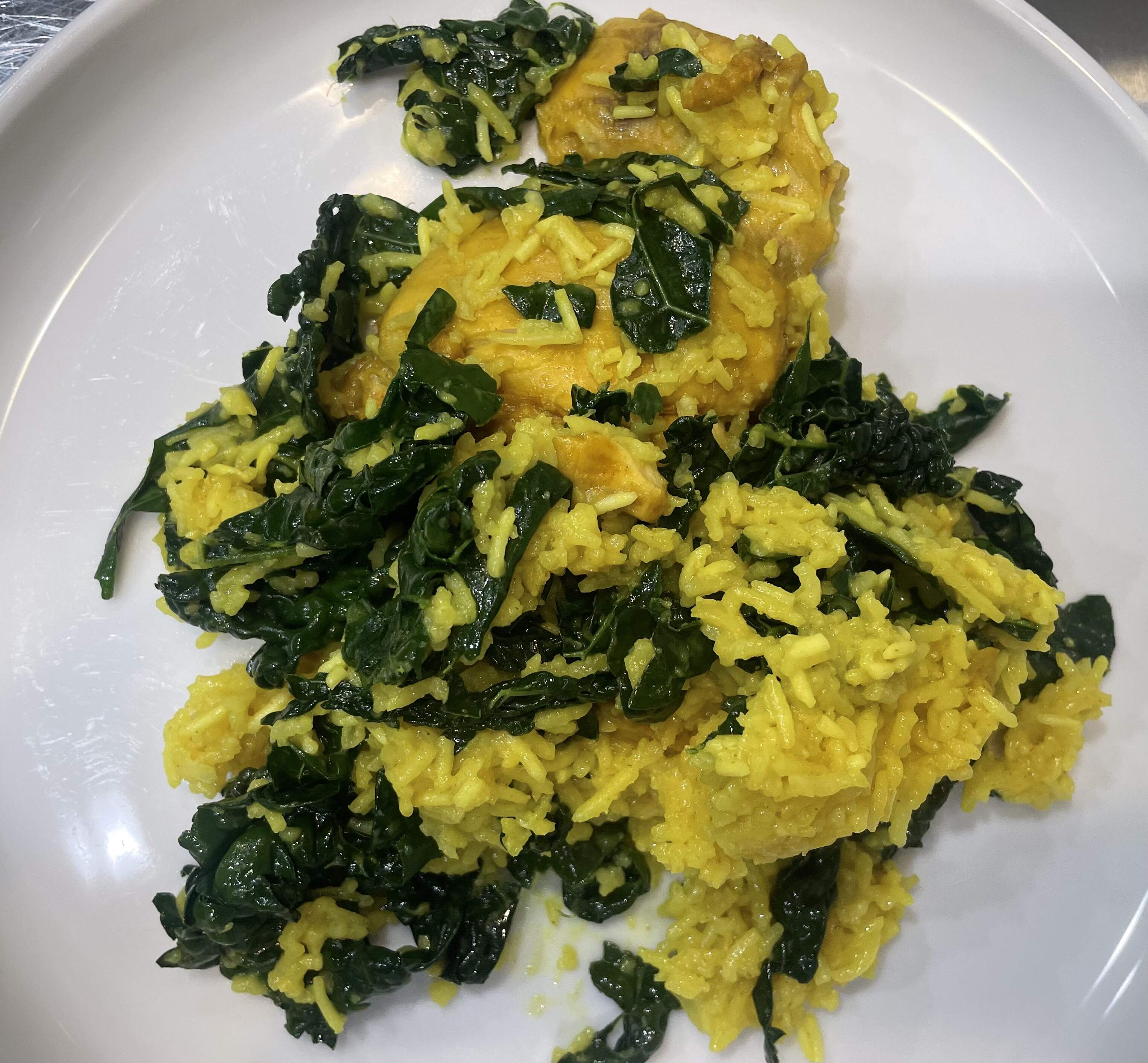 Spiced Coconut Chicken Rice based on a Bon Appetit recipe - chicken thighs, shallots, garlic, turmeric and cayenne pepper are first braised in some water before adding washed basmati rice and coconut milk and cooked on low heat. Shredded black kale is added off heat.