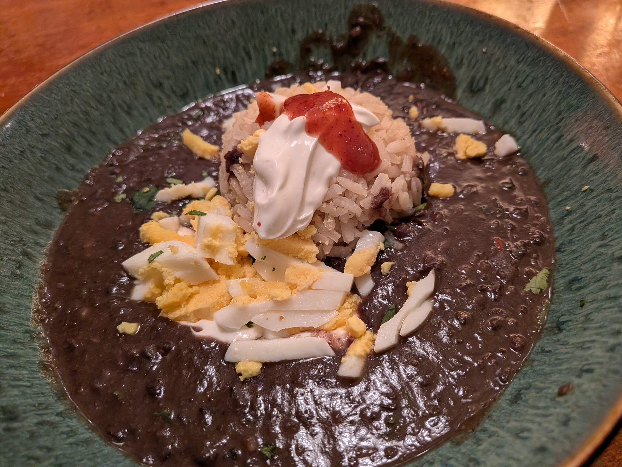I made black bean soup Sunday for last night’s dinner, vaguely following a Jaques Pepin recipe, but mostly a big fridge clean-out incorporating leftover taqueria salsas/hot sauces. Added a little nduja at the end for more heat and protein, and a sliced-up HBE for me. BF made rice to go with. Crema for both of us. Turned out good, a homey dinner after a long, cold (for us!) day.