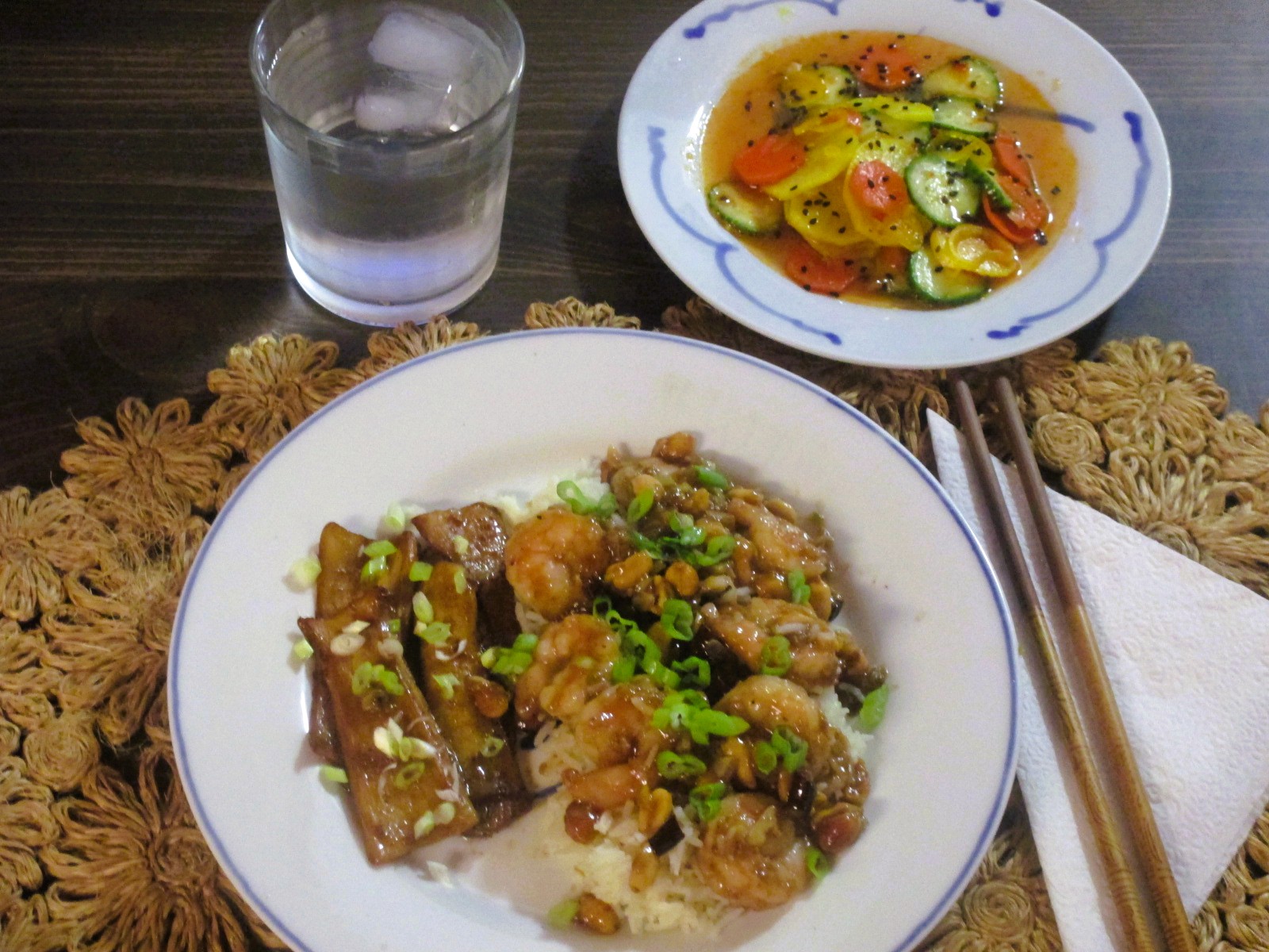 Kung pao shrimp, soy butter glazed king oyster mushrooms, ginger rice. Pickled veg. Shrimp and mushrooms are WoL recipes.