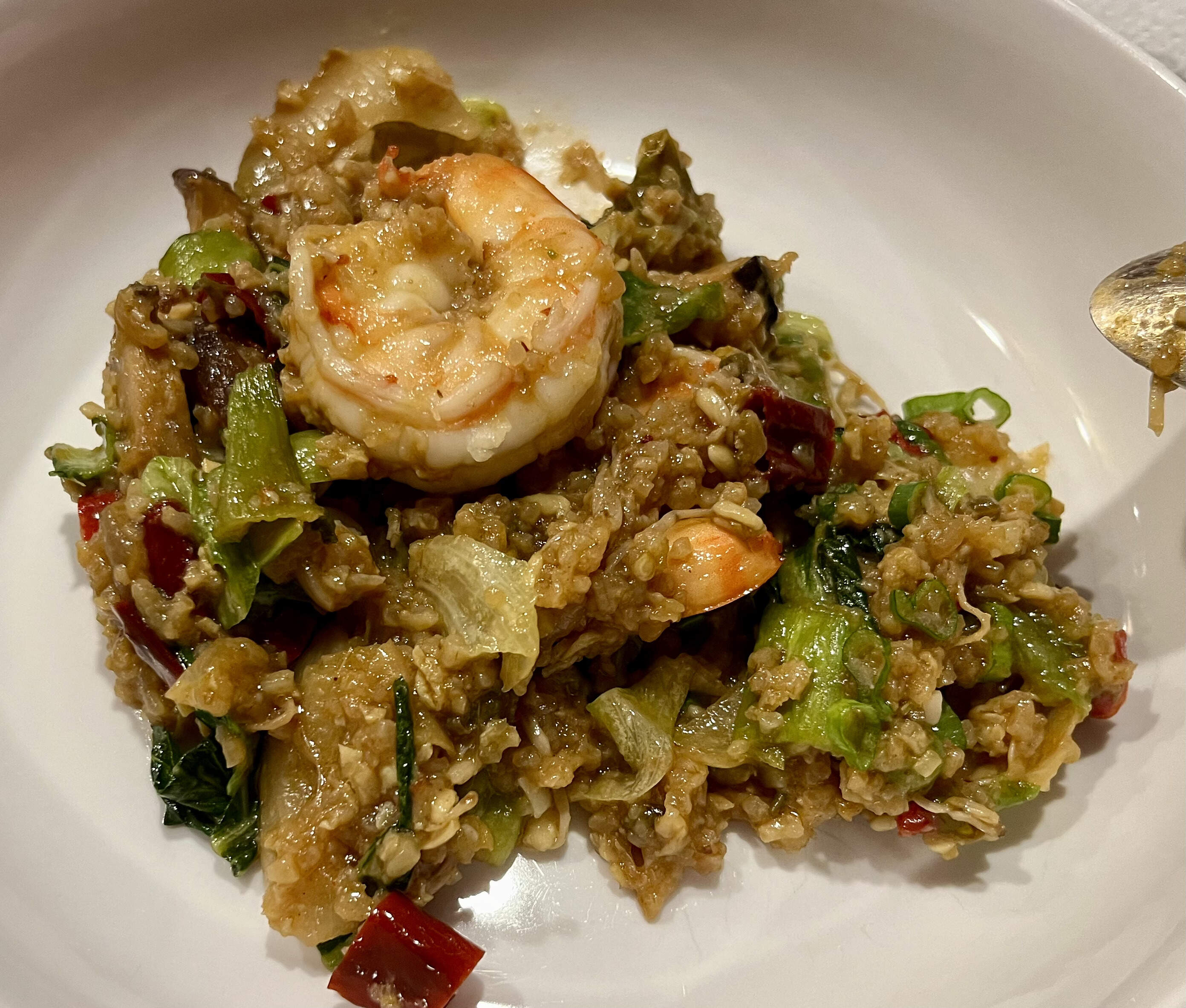 WFD was another very low-key, simple meal of leftovers: Sunday’s veg & shroom fried rice with the addition of a handful of BTS I fried up with TPSTOGAG & a few chopped up iceberg leaves to up the veg content.