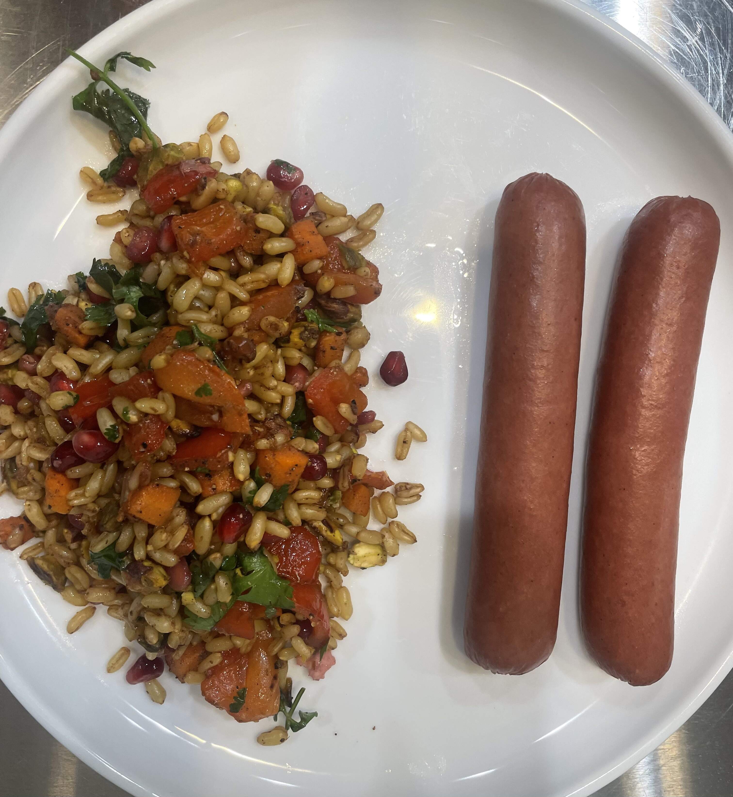 Kamut with Carrots, Red Peppers and Pomegranate from a CI recipe - carrots and red bell peppers are sautéed before garlic, garam masala and freshly cooked kamut are added and warmed through. Finished with toasted pistachios, pomegranate seeds, cilantro and lemon juice. Served with wiener wuerstchen
