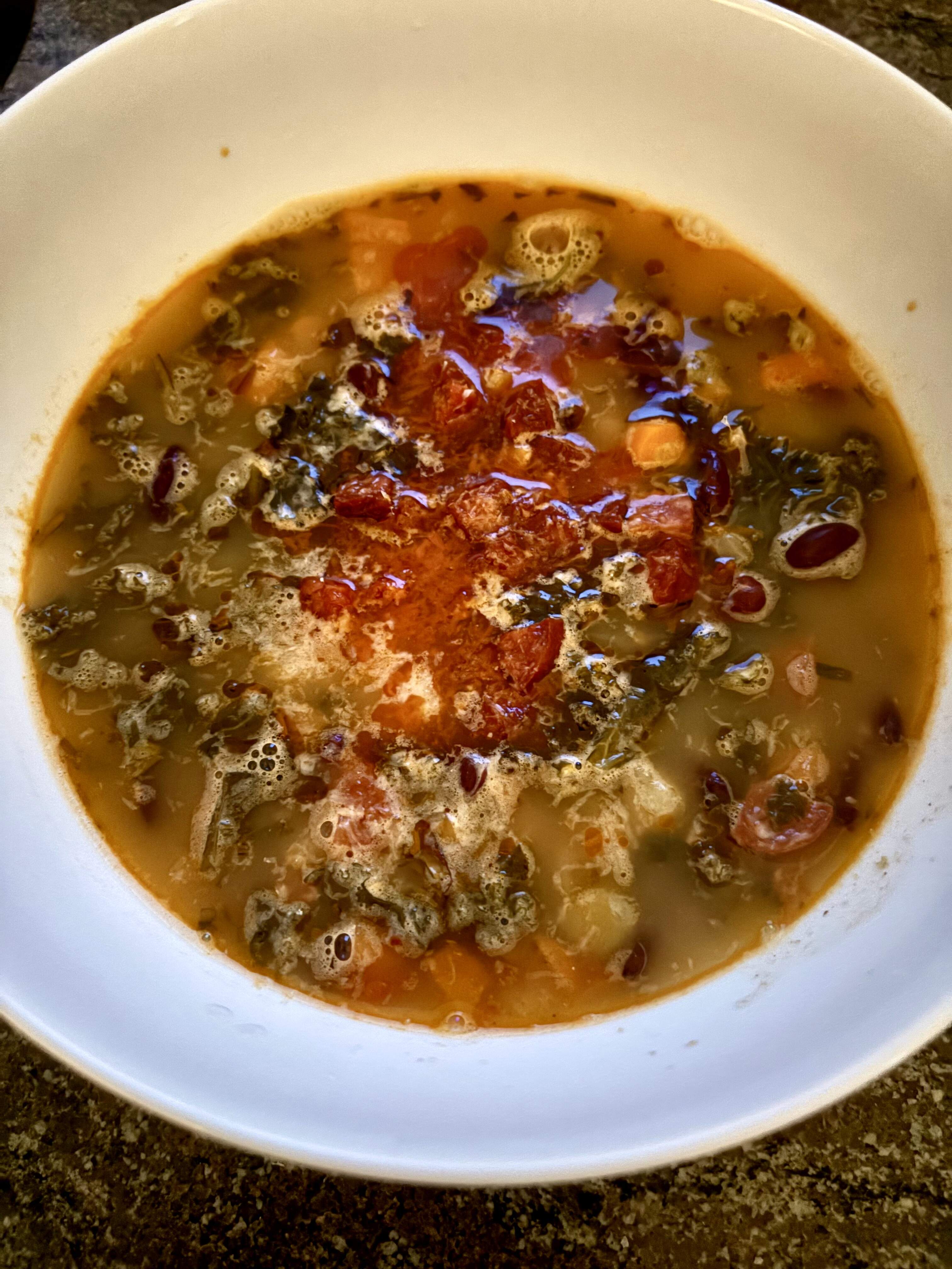 Chorizo/kale/potato and bean soup from the freezer with some extra, crisped up chorizo and XVOO. hit the spot on this miserable, snowy day.