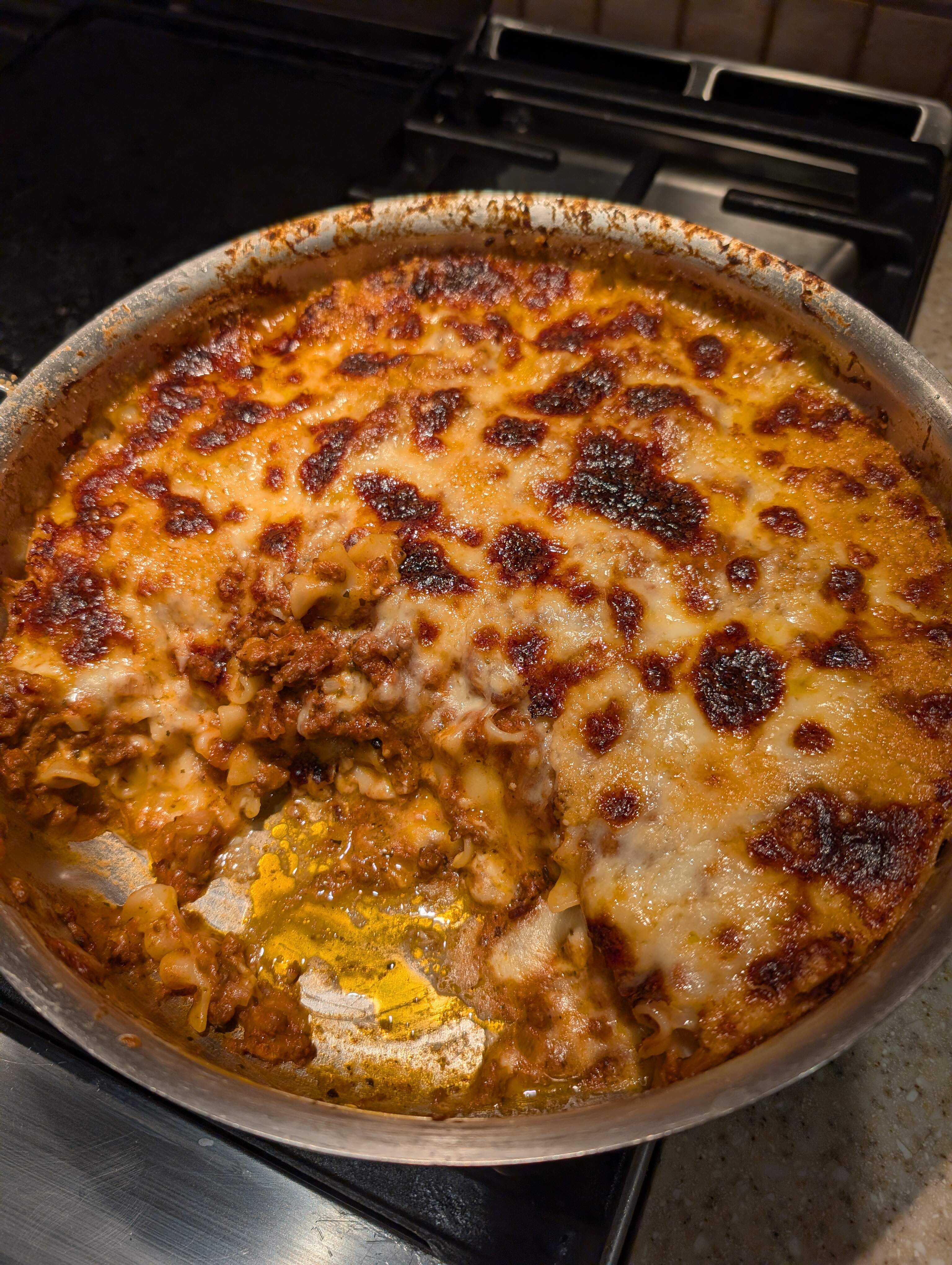Lasagne americane al forno. I didn’t have any lasagna noodles, but I did have a package of mafalde corti that I didn’t particularly love as a sauced pasta, so in they went. I also used up a heel of guanciale, a big hunk of mozzarella and a half tub of stracciatella that were nearing end of life, and some of the glut of homegrown tomatoes (passata) currently overwhelming my freezer. Glorious.